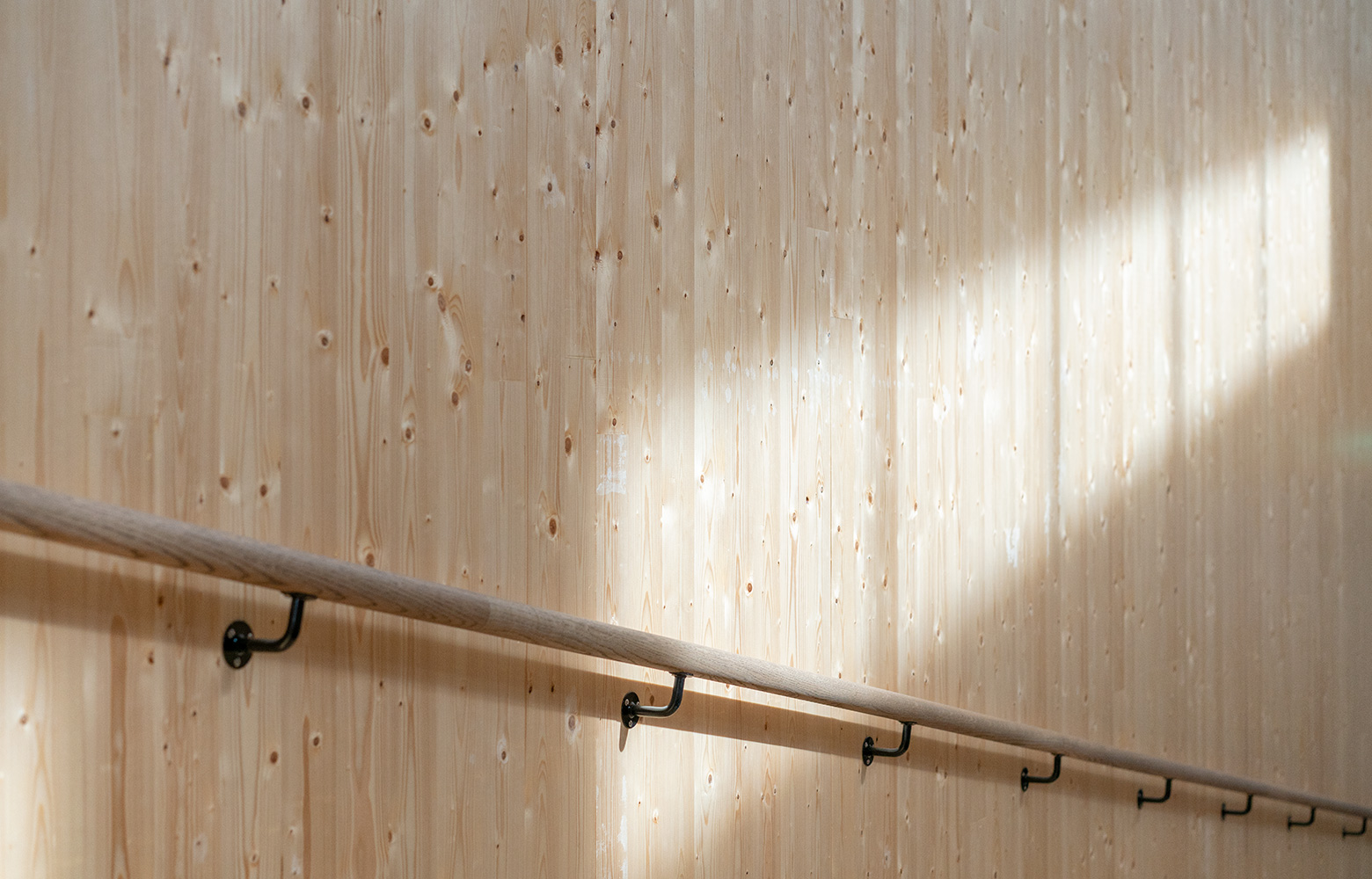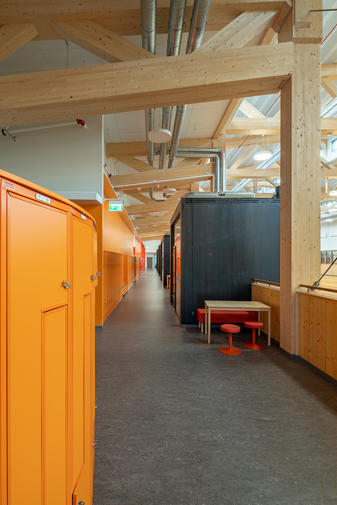 Förutom glaspartierna består alla ytskikt i den luftiga ljusgården av en kombination av limträ och KL-trä. Bärande delar i form av takfackverk i limträ har lämnats synliga och bidrar till den varma, levande känslan.