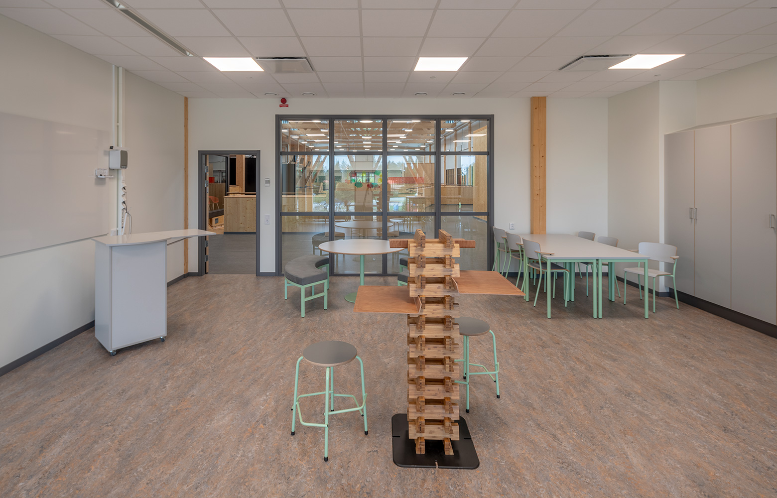 – Det har blivit en väldigt bra kombination, där vi valt trä i högsta möjliga mån, men plockat in en del andra material utifrån hänsyn till ljud, fukt, brandsäkerhet och kostnader. Av erfarenhet vet vi dock att det går att hålla kostnaderna nere om man har med trä som ett alternativ redan från början. Här har träet i stommen till exempel också blivit en del av gestaltningen och ytskiktet, säger Emma Sundelin, projektchef på Skellefteå kommun.