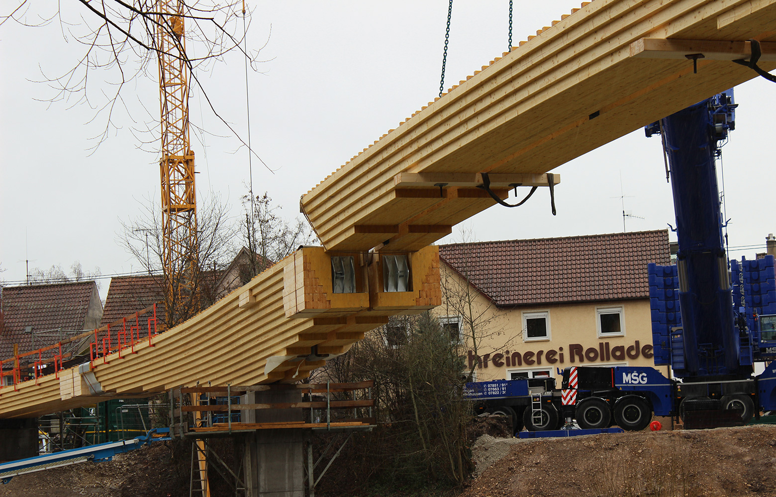 Det lokala träindustriföretaget Schaffitzel Holzindustrie började tillverka broelementen i november 2016. Totalt användes 255 kubikmeter lokalproducerat trä till limträbalkarna som bearbetats och sammanfogats i fabrik. I mars 2017 var elementen klara för montage och kunde lyftas på plats med hjälp av två mobilkranar med en lyftkapacitet på 380 respektive 500 ton som placerats ut på flodens båda sidor. En arbetsinsats som endast tog tre dagar.