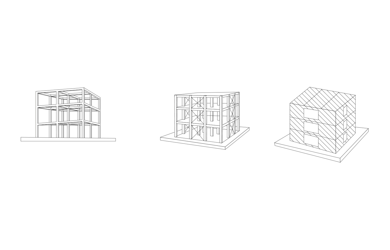 Vid högre hus (ej skyskrapor) är följande stabiliseringsmetoder vanliga (se figur 1):