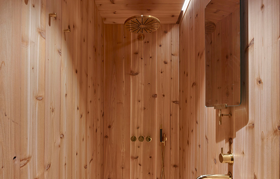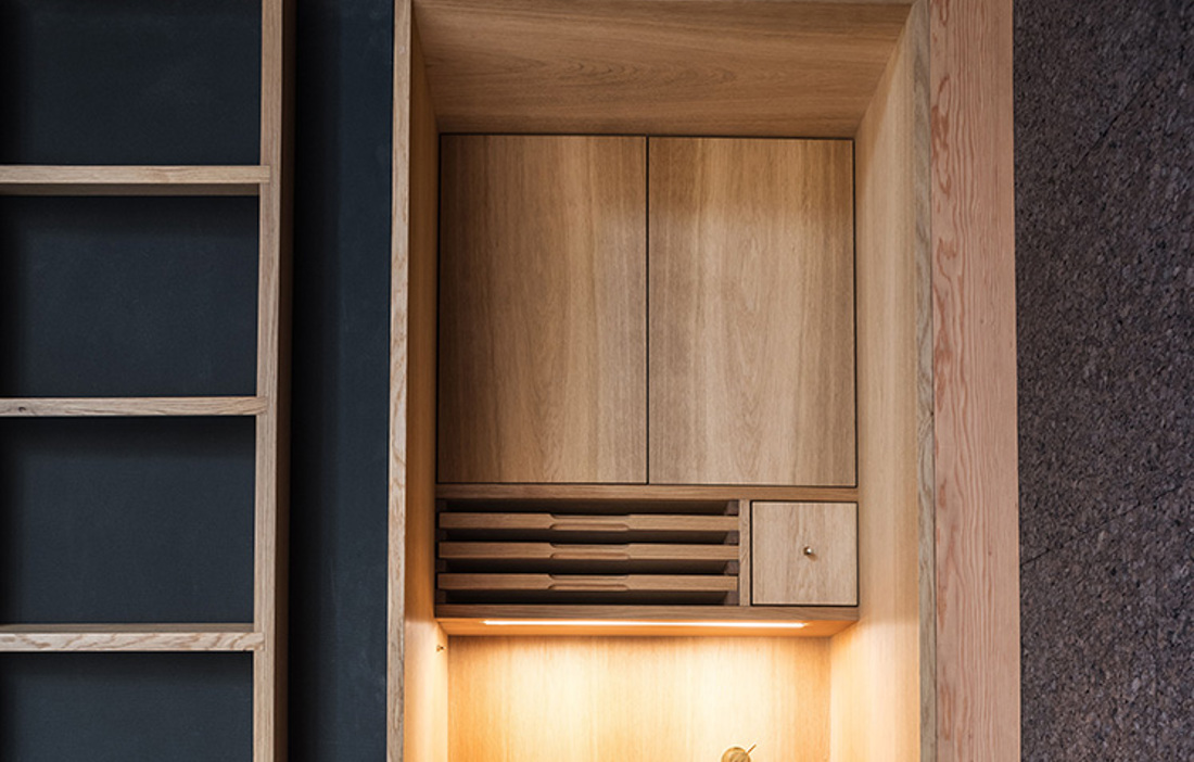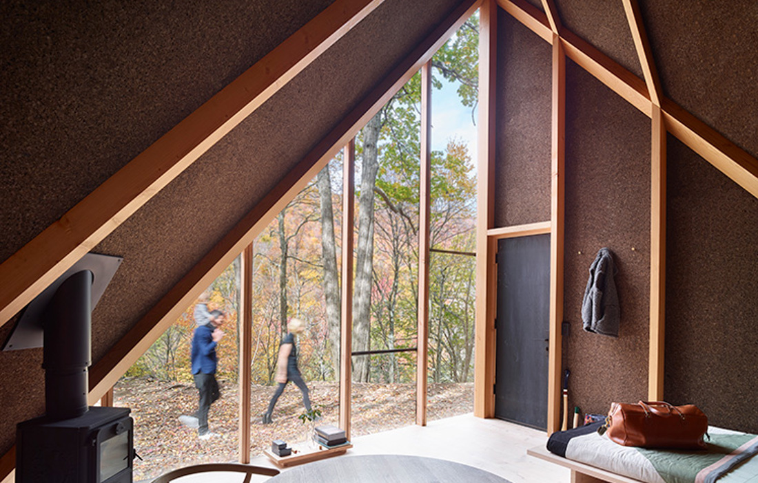 Stugan konstrueras utifrån moduler och vilar på fyra betongpelare. Därmed går det att sätta upp den även på platser där större maskiner inte kan ta sig fram. Modulerna består av 100 procent återvinningsbart material, och kopplingen till naturen är tydlig även invändigt med golv av douglasgran och badrum av cederträ. Mellan reglarna sitter väggmoduler av furu som invändigt är klädda med isolerande kork.