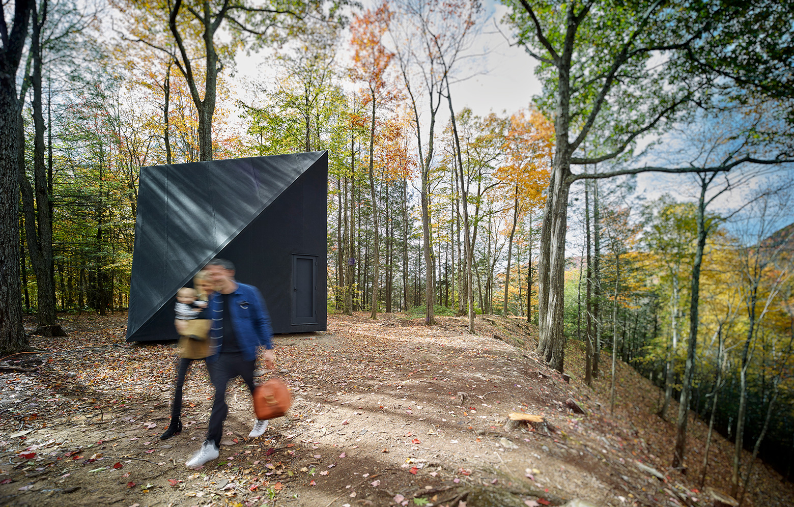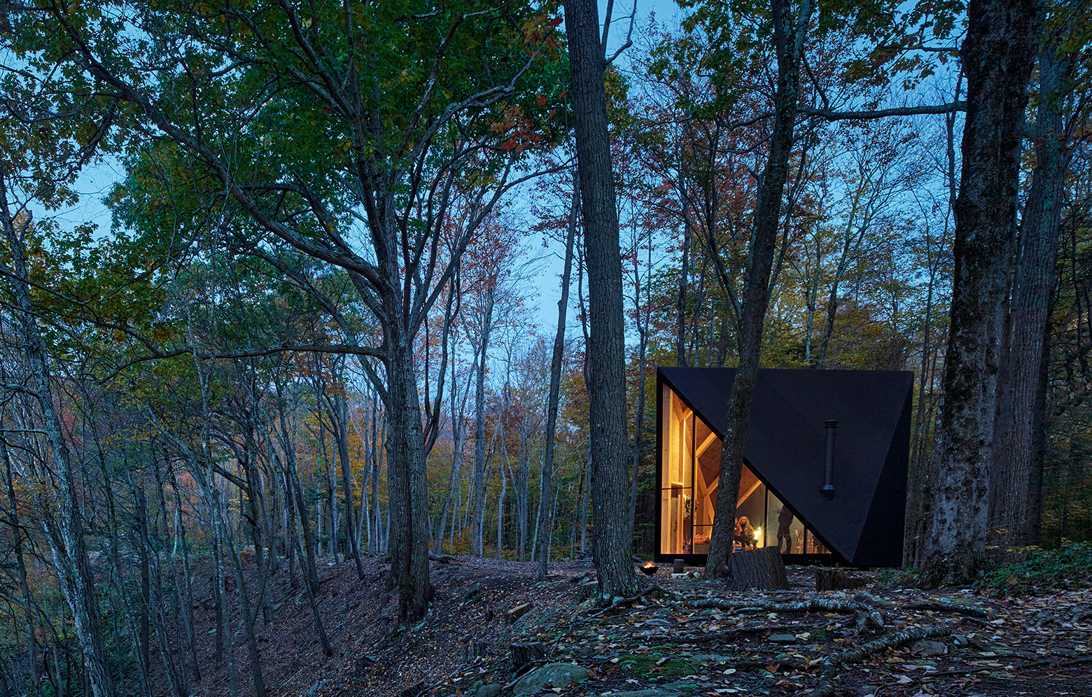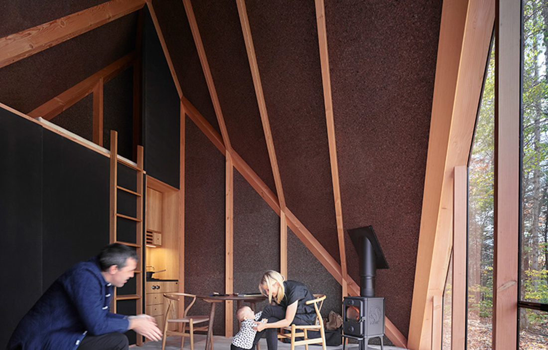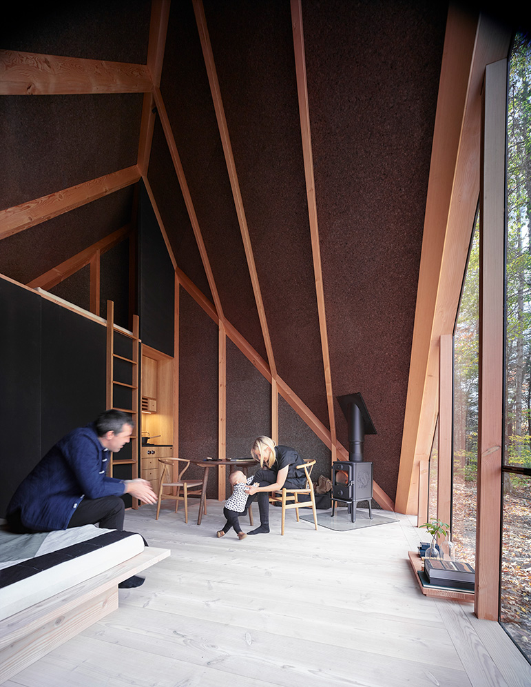 Designen har utvecklats från den traditionella a-formade stugan, känd för sin enkla konstruktion samt för sitt vinklade tak och lutande väggar. Genom att vrida taket 45 grader har arkitekterna här skapat extra utrymme, vilket utöver en mer spännande design gör att man på de invändiga 17 kvadratmeterna får plats med ett sovloft.