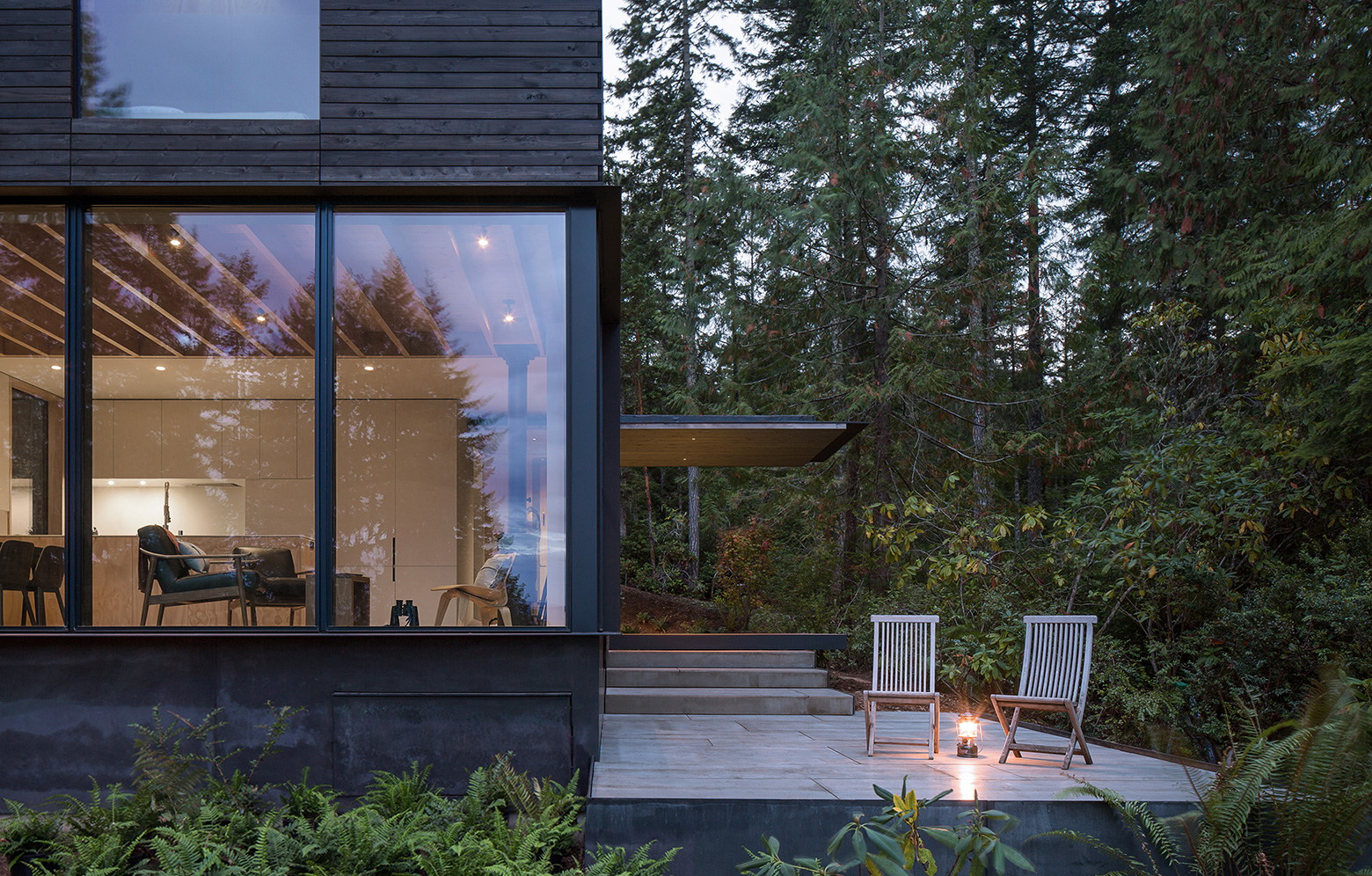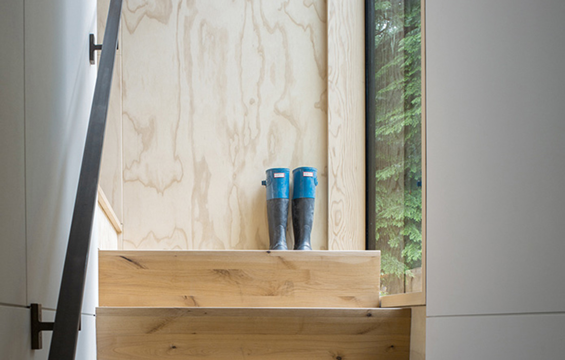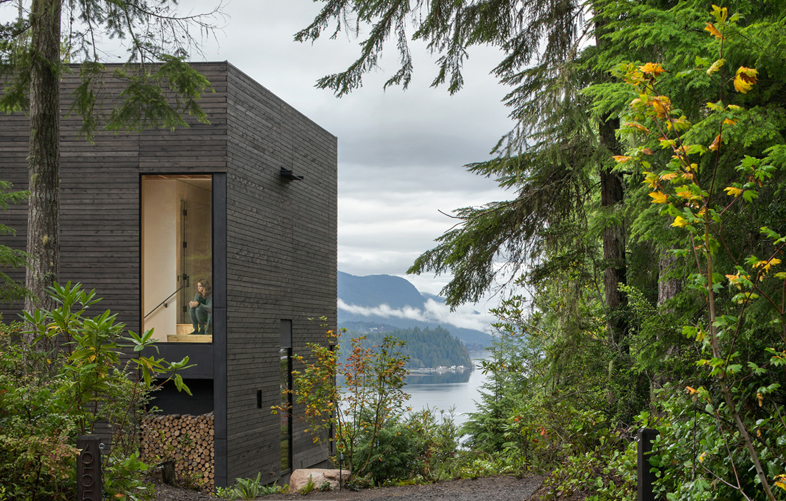 Det nybyggda fritidshuset i nordvästra USA, placerat på en klippbrant med utsikt över både vatten och skog, är en plats för kontraster. Här möter den distinkta exteriören en varm och mjuk interiör, allt skapat med en enkel design för att främst tillgodose de funktionella önskemålen. Idén utgår från en enkel lådformad byggnad, varifrån arkitekterna på mw Works har skapat stora öppningar för fönster i såväl tak som väggar för att få ett stort och naturligt ljusinsläpp. Byggnaden placerades på en befintlig grund, och de två våningarna har fått en generös takhöjd vilket ger en lyxig känsla trots att familjens strama budget satte vissa begränsningar.
