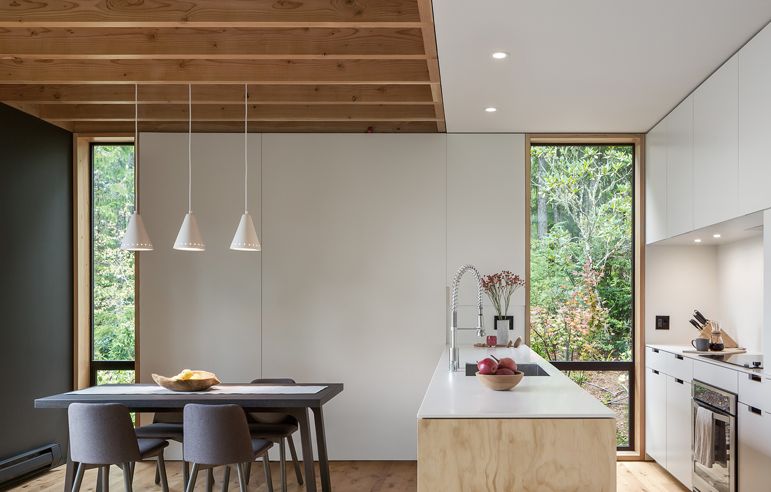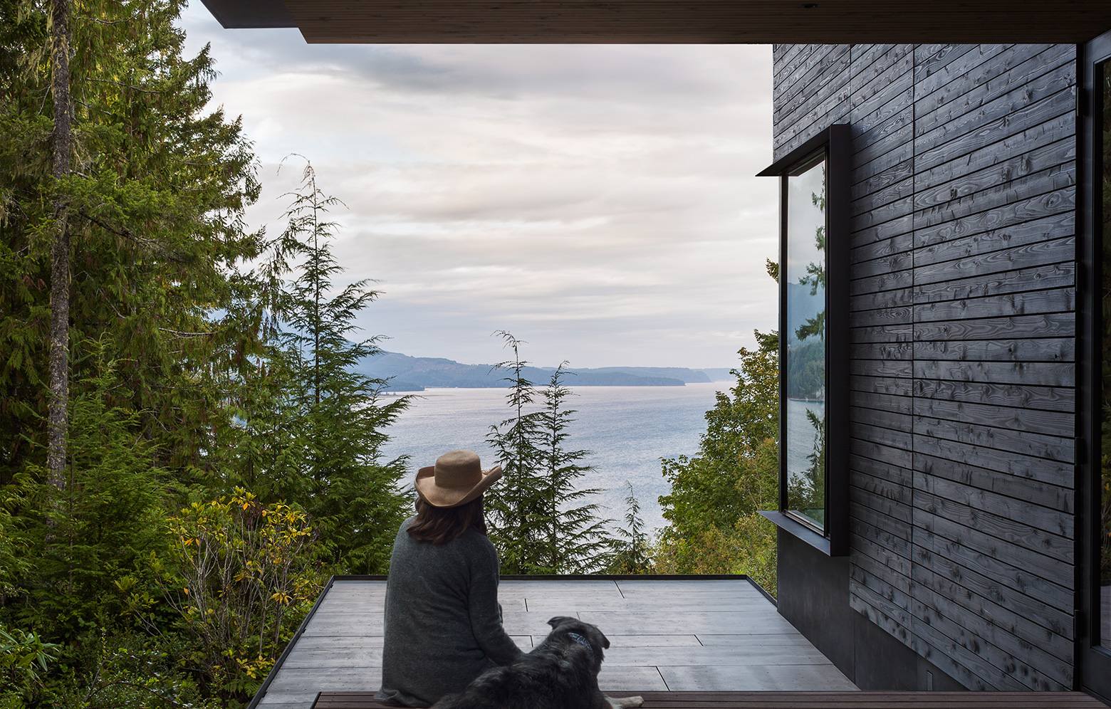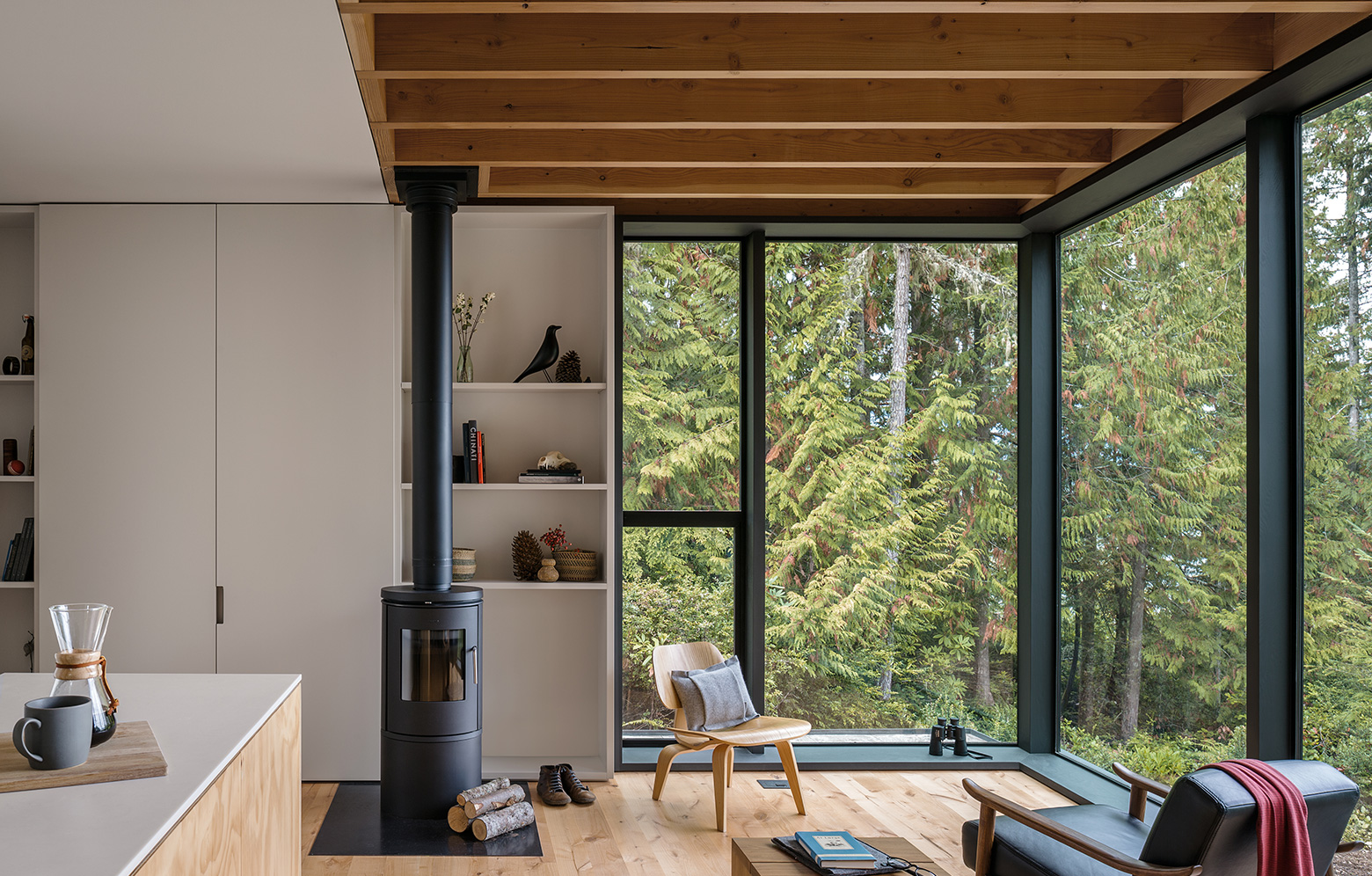 Det nybyggda fritidshuset i nordvästra USA, placerat på en klippbrant med utsikt över både vatten och skog, är en plats för kontraster. Här möter den distinkta exteriören en varm och mjuk interiör, allt skapat med en enkel design för att främst tillgodose de funktionella önskemålen. Idén utgår från en enkel lådformad byggnad, varifrån arkitekterna på mw Works har skapat stora öppningar för fönster i såväl tak som väggar för att få ett stort och naturligt ljusinsläpp. Byggnaden placerades på en befintlig grund, och de två våningarna har fått en generös takhöjd vilket ger en lyxig känsla trots att familjens strama budget satte vissa begränsningar.