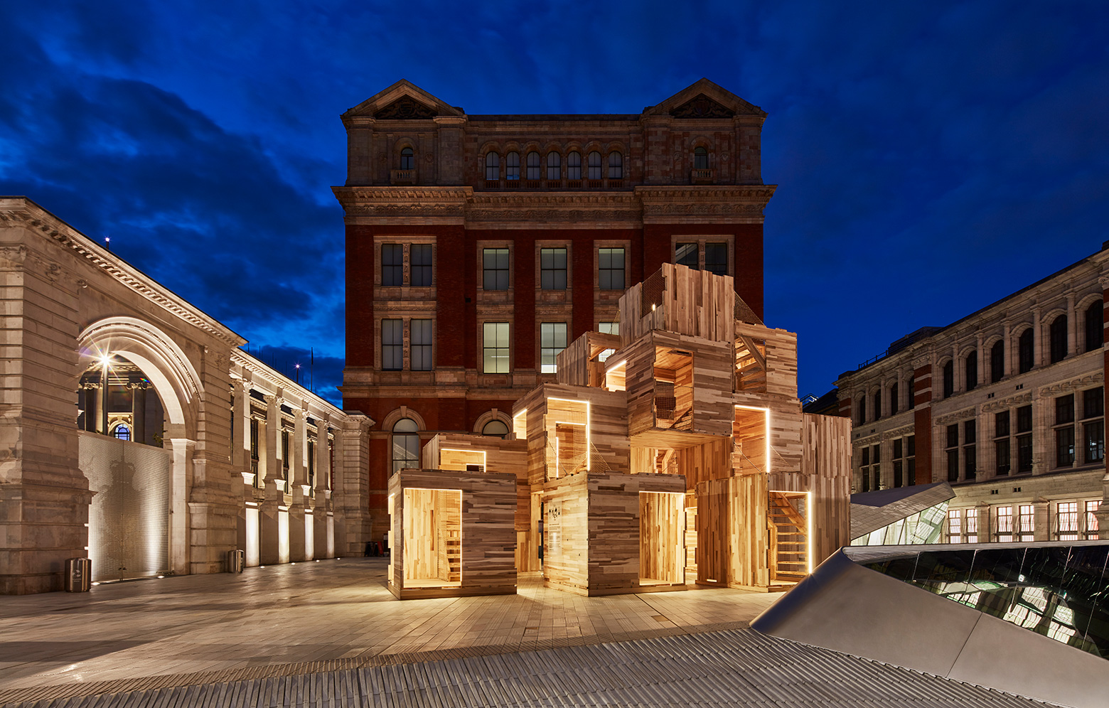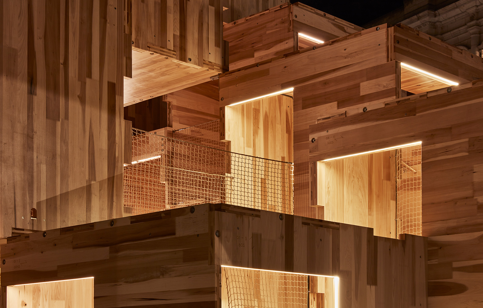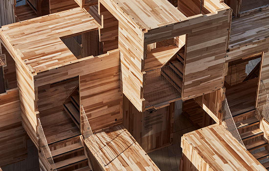 En lek med form och en uppvisning i KL-trä. Den tre våningar höga labyrintliknande byggnaden Multiply som i september ställdes ut på London Design Festival är skapad för att väcka diskussion om vår tids två stora utmaningar: behovet av nya bostäder samt vikten av att bekämpa klimatförändringarna.