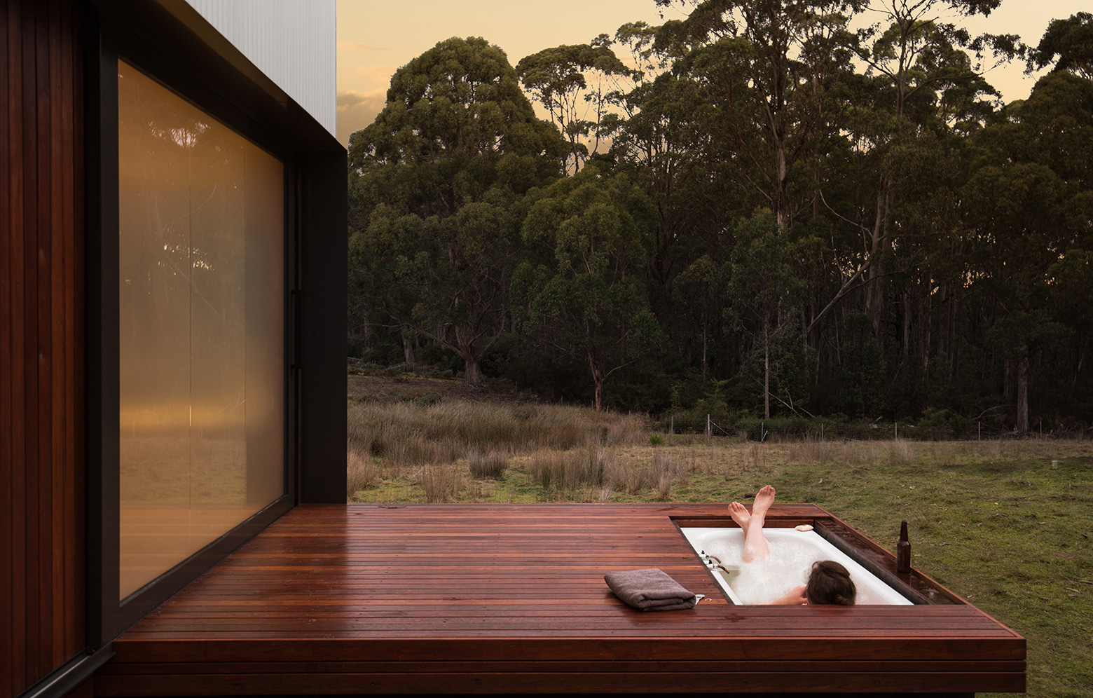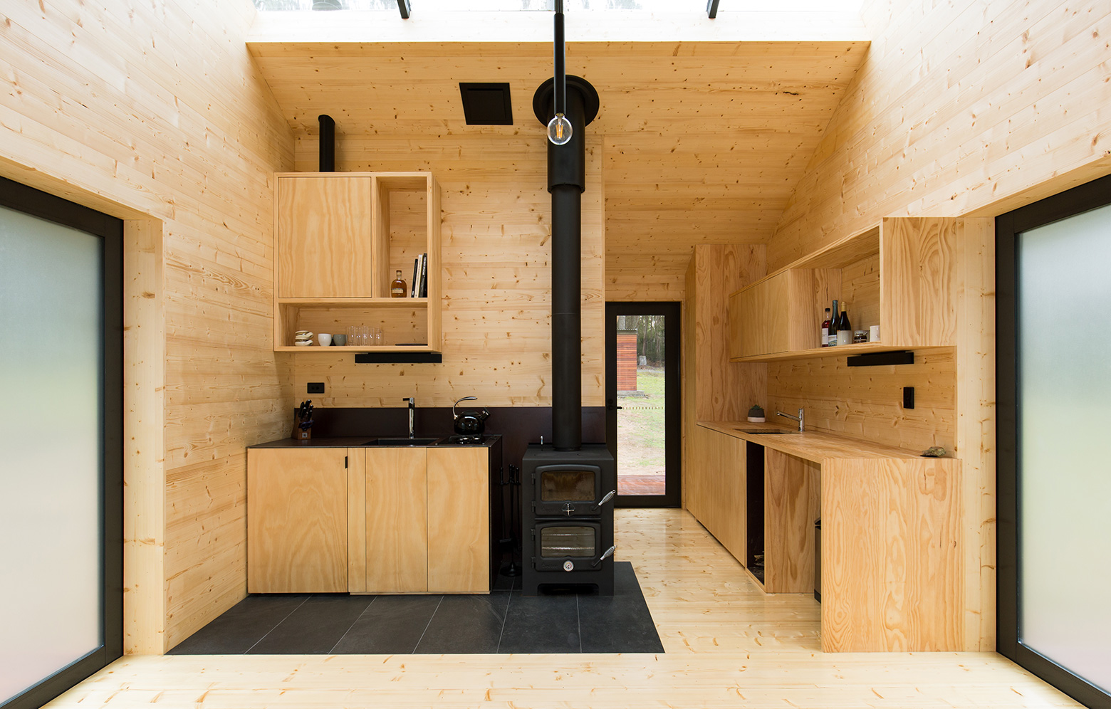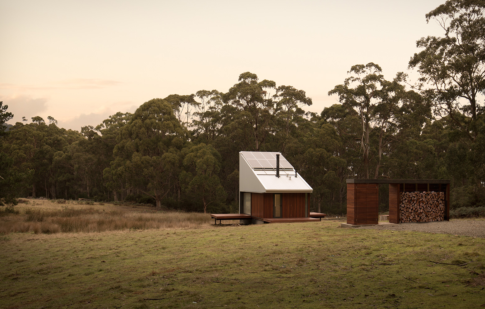 Under ruggiga dagar är fritidshuset på Bruny Island utanför Tasmanien ett litet mysigt krypin där de 28 kvadratmetrarna rymmer allt man behöver. Soliga dagar öppnas husets skjutdörrar och skapar tillsammans med de intilliggande terrasserna en mer rymlig plats. Beställaren ville ha ett fritidshus där hon kunde leva enkelt och titta på stjärnhimlen. Det resulterade i att arkitektbyrån Maguire & Devine skapade en stuga med i princip all inredning platsbyggd; de enda lösa möblerna är ett litet bord och en madrass på sovloftet. Interiört har furu valts för sin ljusa färg och lämnats synlig såväl på väggar som golv och tak.