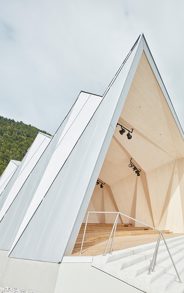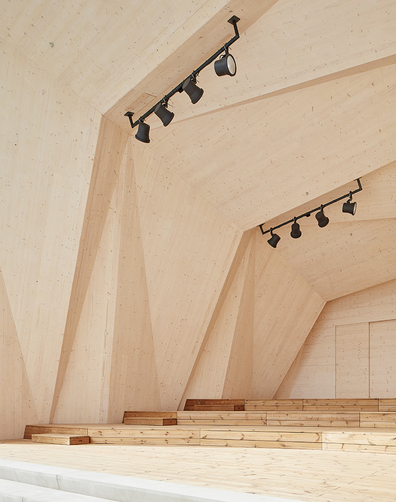 Byggnaden är synlig från alla håll och liknas mer vid en snäckformad skulptur än vid en vanlig byggnad. Men för att den ska fungera i musiksammanhang krävs också stor omsorg om dess akustik; musiken ska kunna nå fram till åhörarna på torget samtidigt som även musikerna måste kunna höra varandra. Vanligtvis har de flesta scener någon form av ljudriktade paneler på sidorna och i taket. Här har arkitekterna utifrån konstruktionens solida träpanel tillsammans med ljud-experter utvecklat en struktur som uppfyller de akustiska kraven. Panelernas veckade form är också ett stöd för konstruktionen och gör byggnaden stabil.