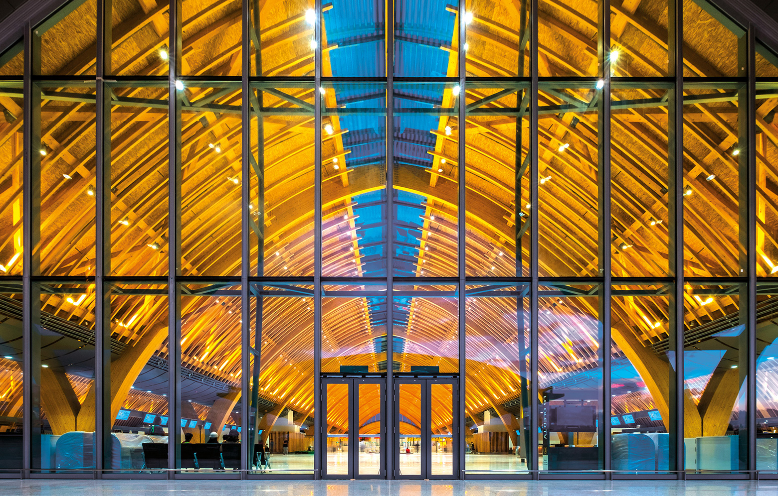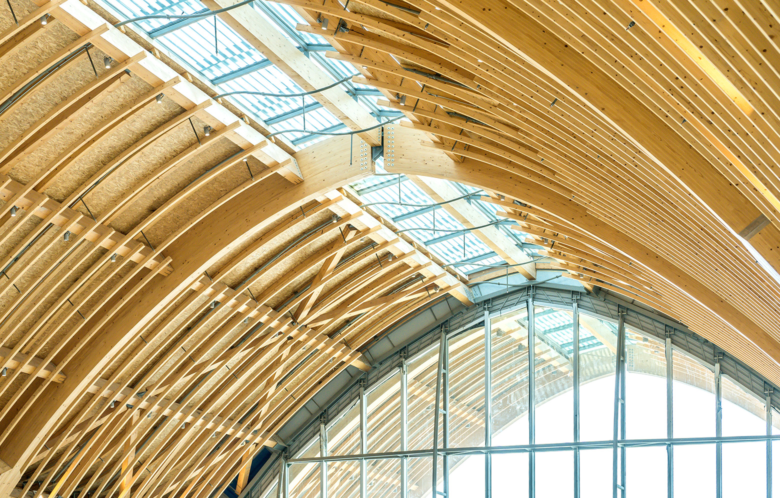 Totalt har man använt 4 500 kubikmeter limträ till den bågformade konstruktionen som har en höjd på 15 meter och ett spann på 30 meter.