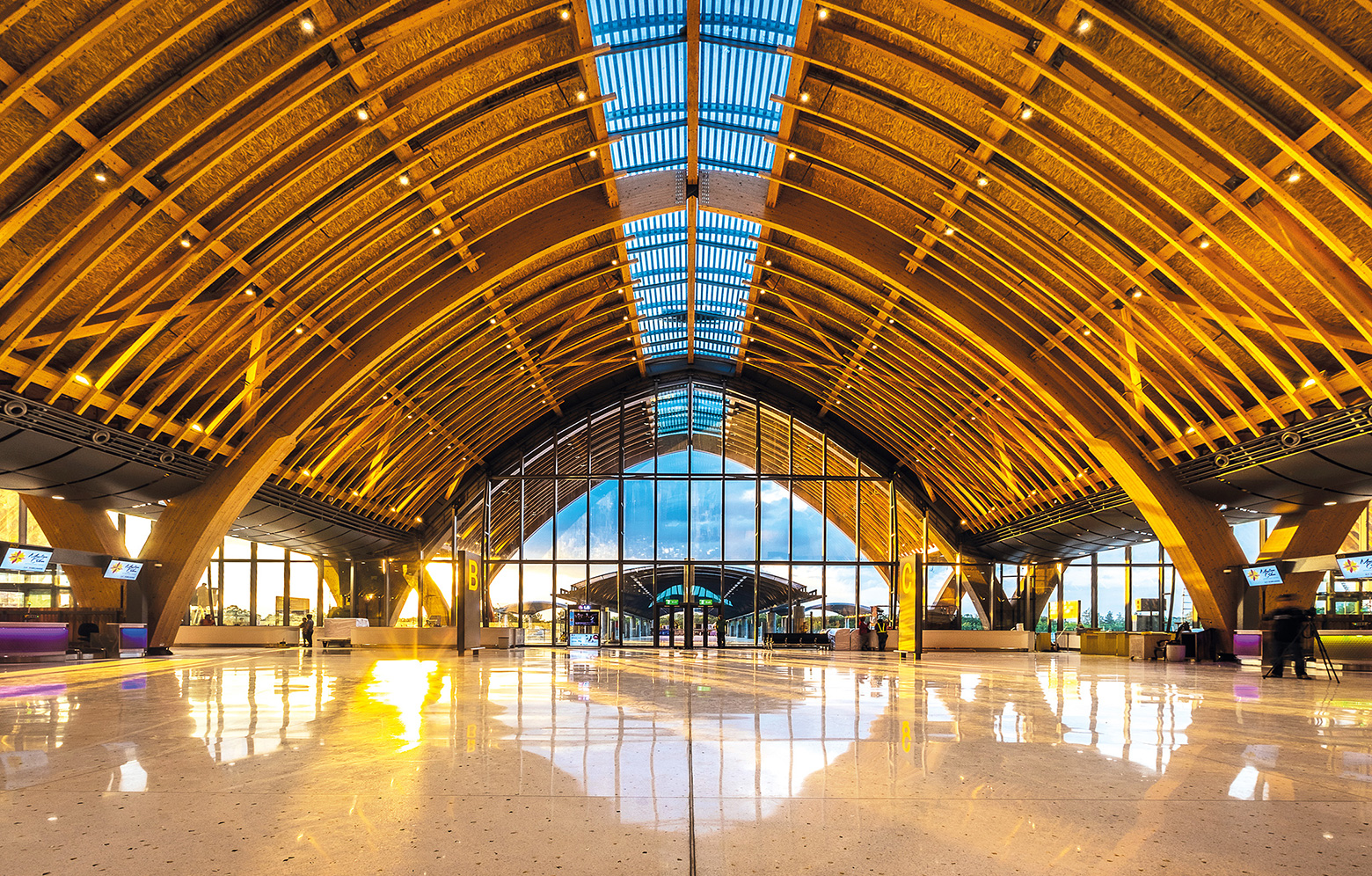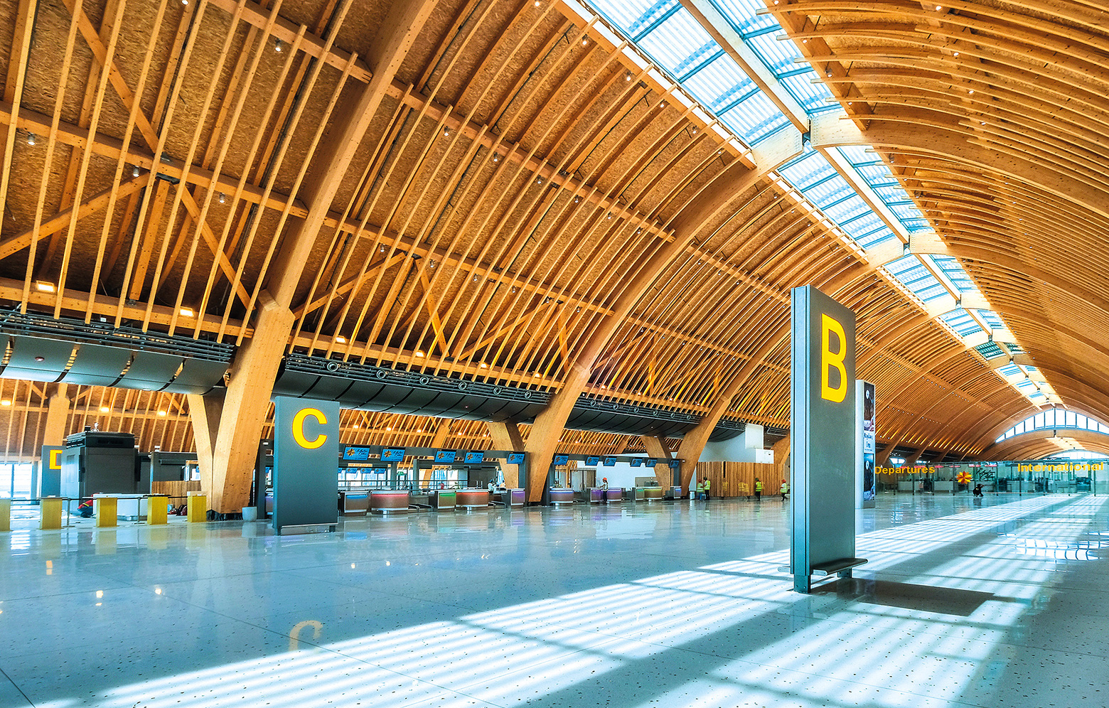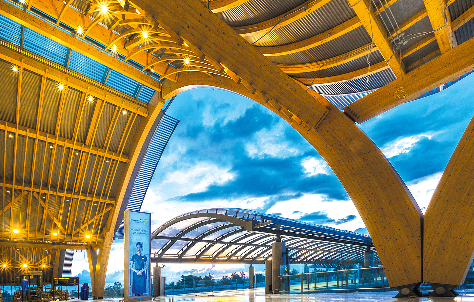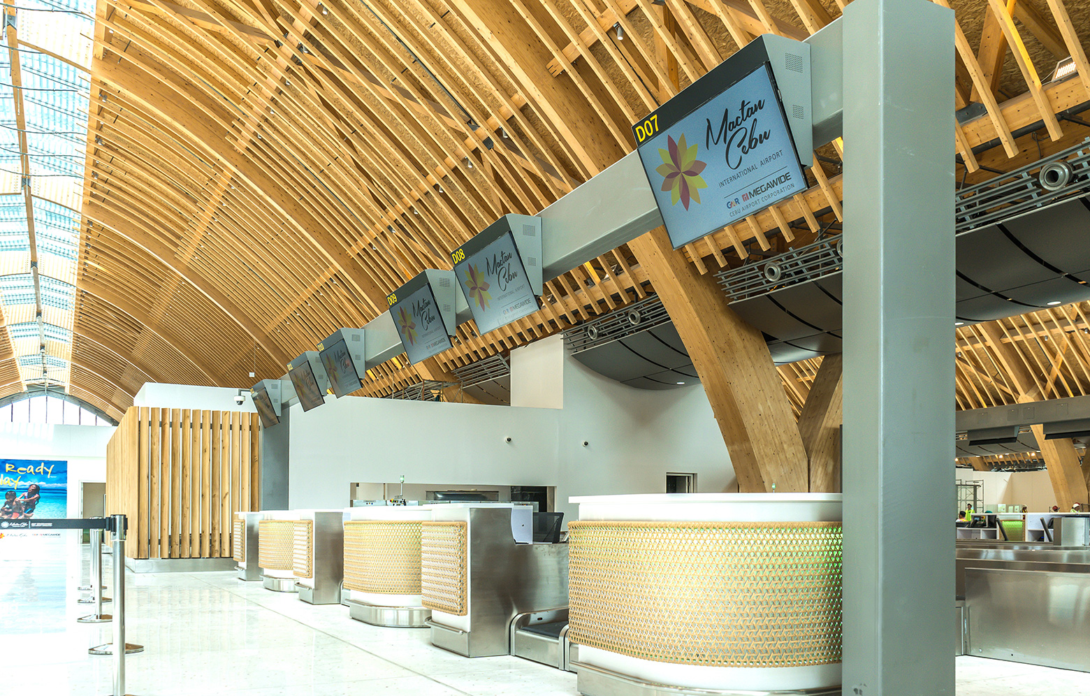Asien har fått sin första flygplats där taket och dess stomme är konstruerade helt av limträ. Det är Filippinernas näst största flygplats, The Mactan Cebu International Airport, som har fått en ny terminal. Önskemålet var att flygplatsens besökare skulle få ett varmt välkomnande och ett lika varmt avsked i en resortliknande atmosfär. En ljus arkitektur i kombination med rätt material skulle spegla Filippinernas vänliga och öppna kultur. Av såväl ekologiska som traditionella skäl föll valet på trä. Innan byggnationen kunde starta byggde konstruktörerna på Rubner Holzbau en fullskalig testkonstruktion. Då kunde de säkerställa att knutpunkterna kan stå emot eventuella seismiska rörelser samt att takstommens reglar som är fästa i bottenvåningens betongpelare stabiliserar byggnaden i det orkan- och jordbävningsdrabbade området.
