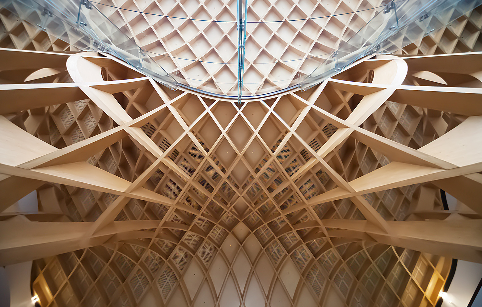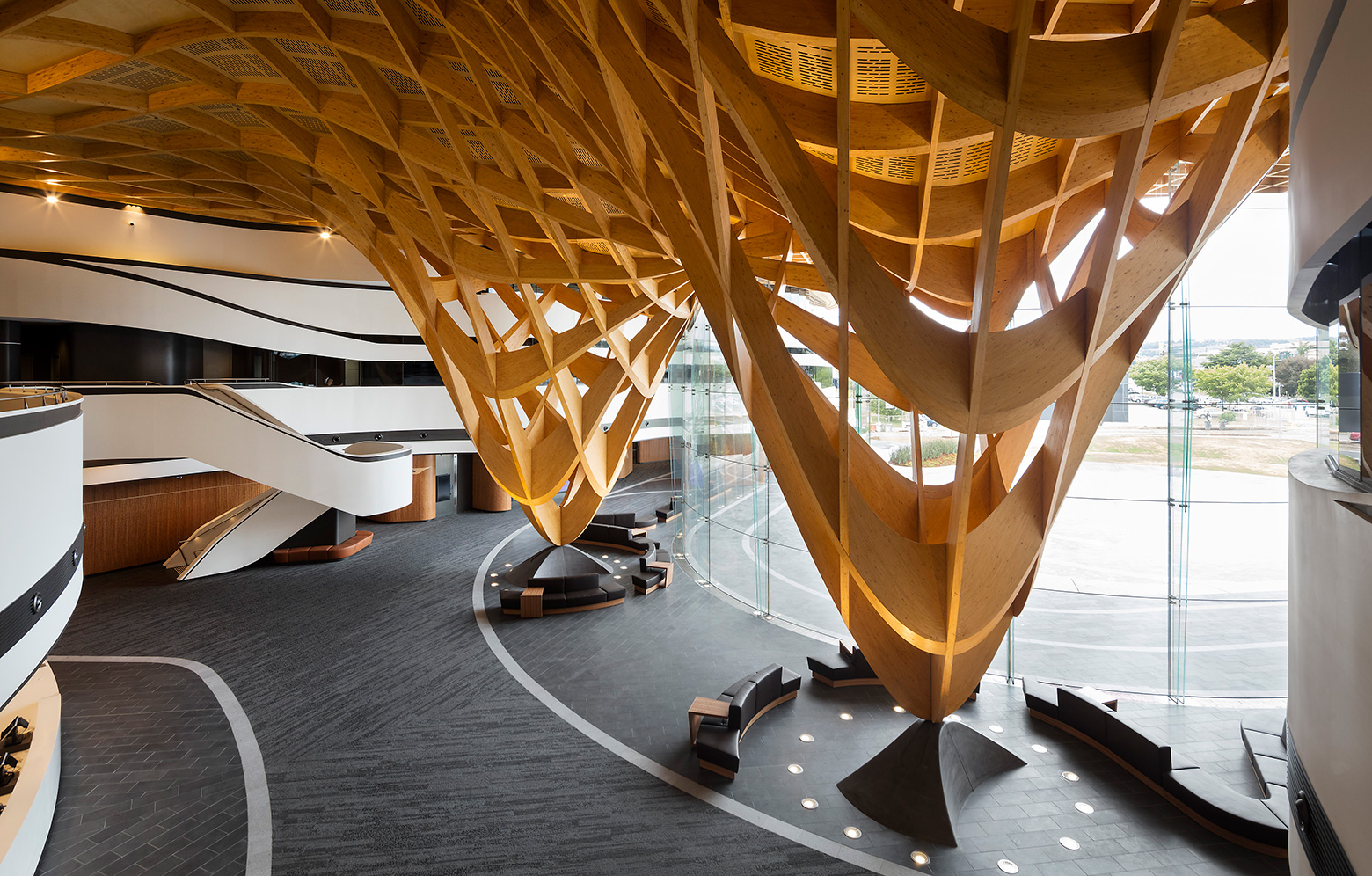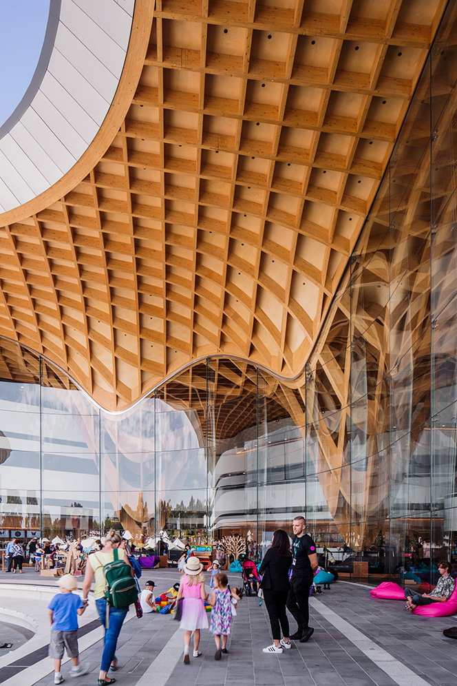 Konstruktionen med det omfattande rutnätverket saknar motstycke i hela Australien – och finns knappt på andra håll i världen heller. För att hitta en leverantör som hade möjlighet att klara den komplicerade uppgiften fick FJMT bege sig till Hess Timber i Tyskland, där limträelementen prefabricerades. Varje kurva i rutnätverket består av upp till 120 laminerade bitar gran, 6 millimeter tunna med en halv millimeters passform sinsemellan. För att kunna skära till de tunna bitarna har man använt ett specialverktyg, en sexaxlad robot som kan skära tredimensionella former. Förbanden mellan de olika delarna i rutnätet har sedan utformats för att klara det strukturella trycket på varje skarv.