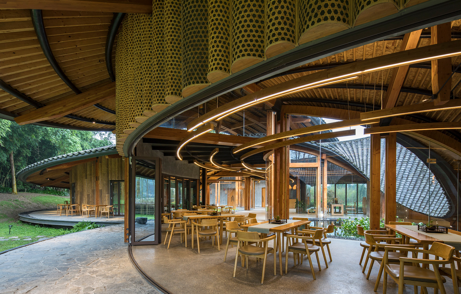 Bambun spelade förstås en stor roll i utformningen, inte bara genom de fasadmönster som skapats av en lokal konstnär. Med sin luftiga design och till-hörande trädgård ger byggnaden också känslan av att befinna sig mitt i en bambuskog. Arkitekterna kunde emellertid snart konstatera att bambu inte fungerar som bärande material. I stället valde de att arbeta med limträ, där pelare och balkar bär upp byggnadens kanske mest iögonfallande del – taket, i formen av ett evighetstecken binder det ihop de två cirkelformade byggnaderna till en enhet. Under takets grå keramikplattor, som är vanligt förekommande i ortens arkitektoniska historia, finns en ram av stål för att skapa den mjuka rundningen. Ovanpå den vilar sekundärbalkar av limträ som har lämnats synliga för att förstärka deras uttryck.