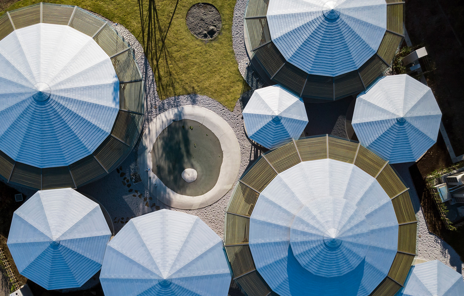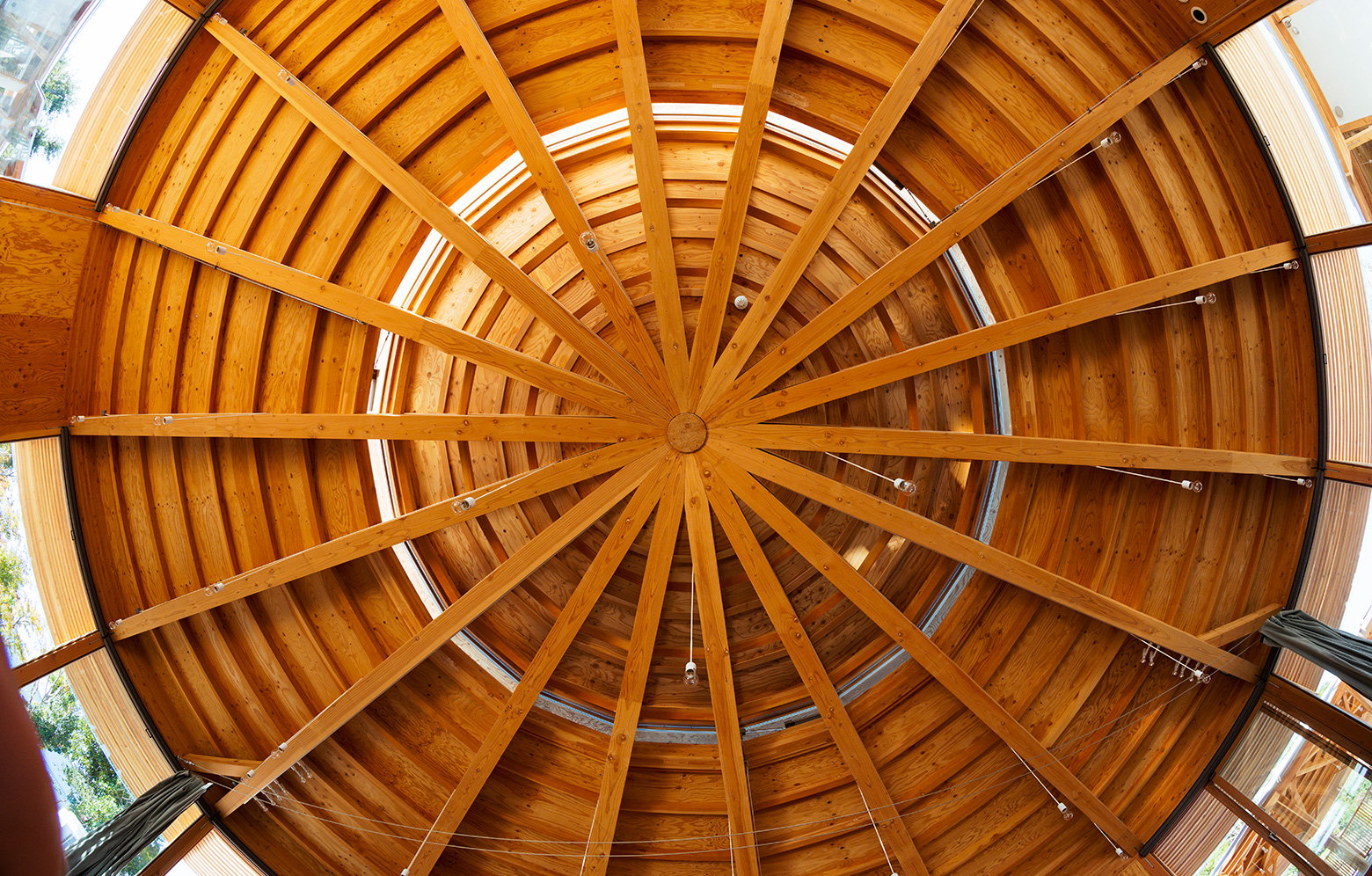 Volymerna är genomgående av trä, och den synliga strukturen i de parasolliknande innertaken visar hur limträbalkarna bär upp konstruktionen genom att likt en blommas kronblad mötas i mitten. Byggnaden tilldelades i fjol priset för bästa skolbyggnad under World Architecture Festival.
