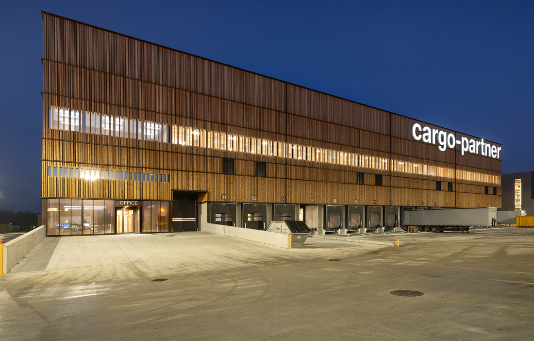 Även utvändigt är det en avsevärd skillnad mellan Cargo-Partners moderna byggnad och de jättelika logistikcenter, alla intill förväxling stöpta i samma form, som brukar finnas uppradade utanför internationella flygplatser runt om i världen. Fasaden i dekorativ lärkpanel bidrar med en levande yta som skiftar med vädret, årstiderna, tid på dygnet och tilltagande ålder.