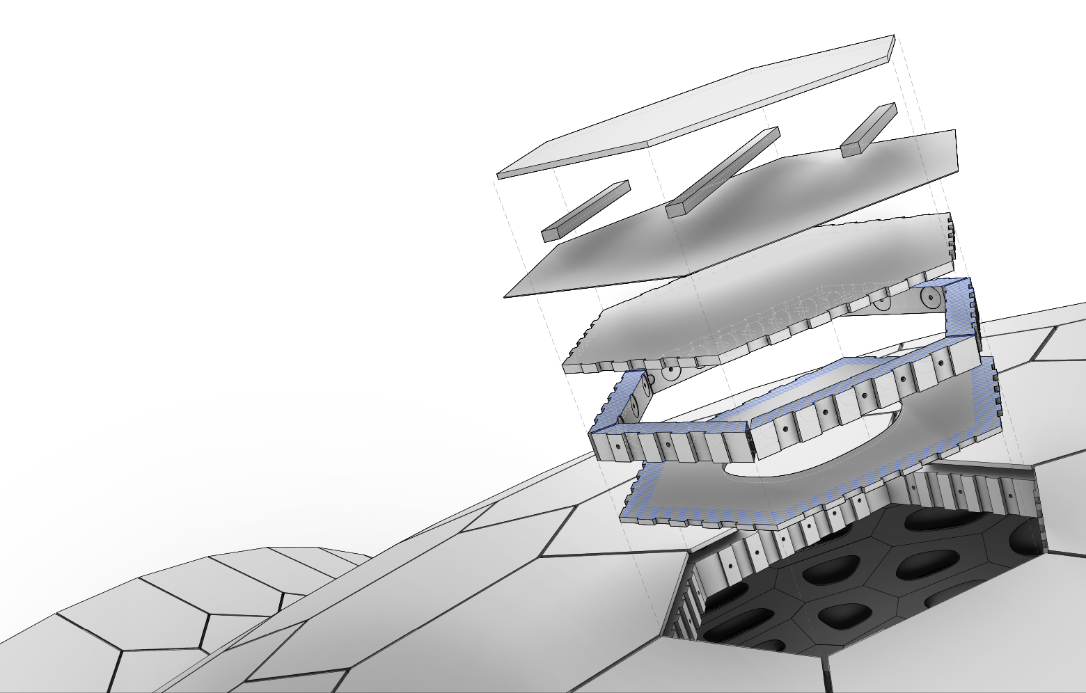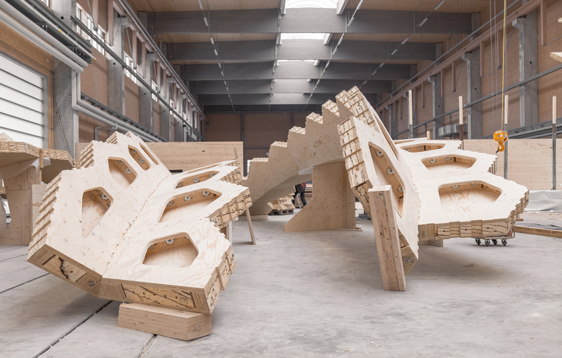Byggnaden är resultatet av ett samarbete mellan flera institutioner, såväl inom design som byggteknik, och som en del av projektet utvecklades också en 14-axlig robot som med mikrometerprecision sammanfogade segmenten och fräste ur fingerskarvarna.