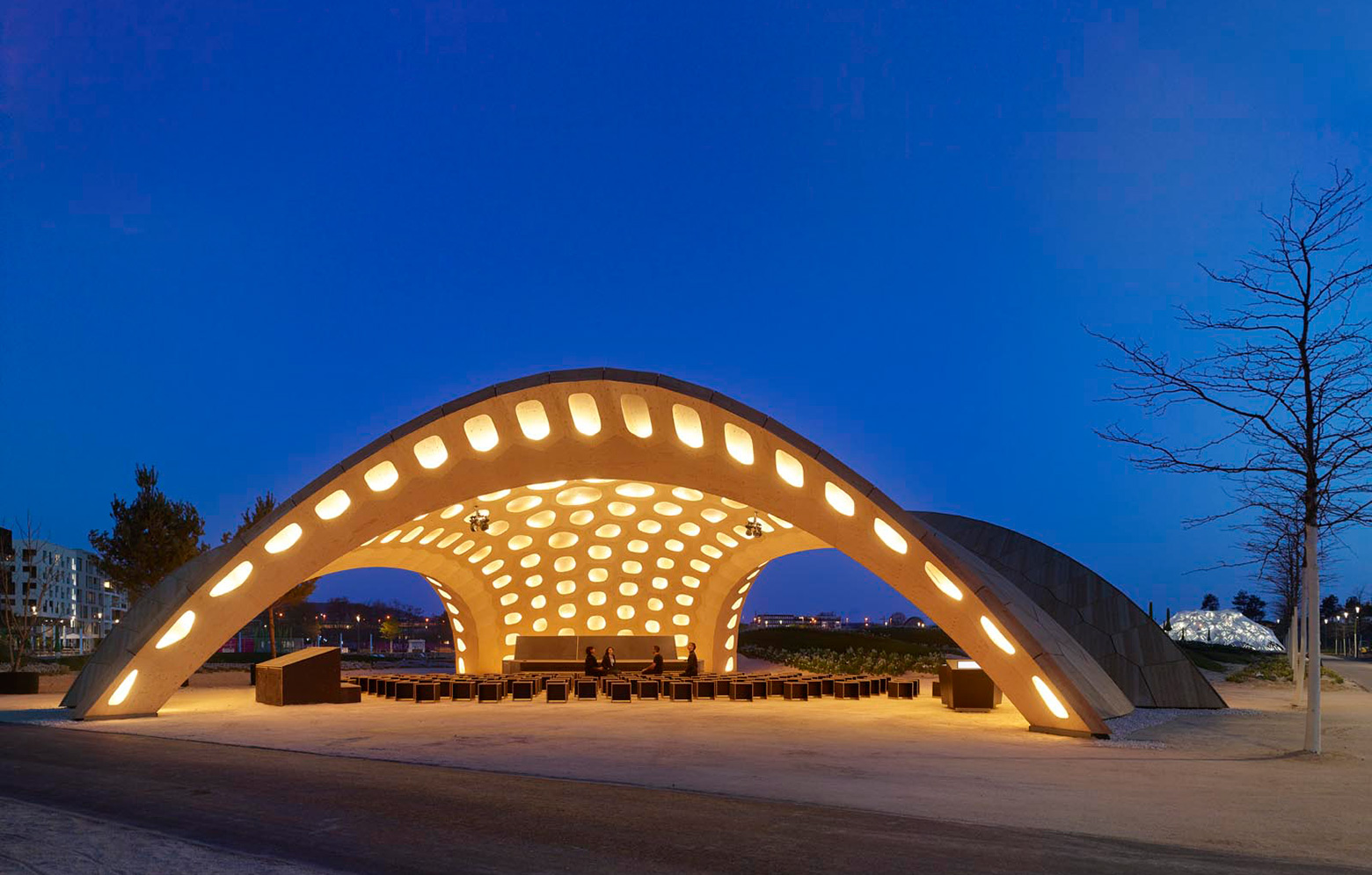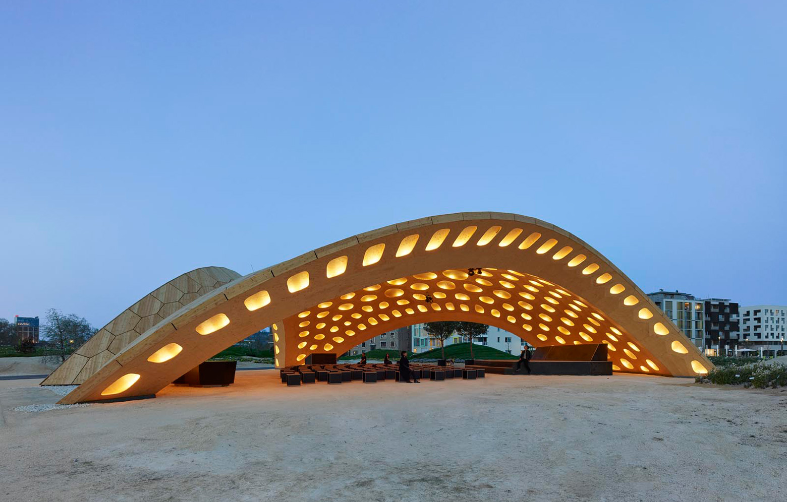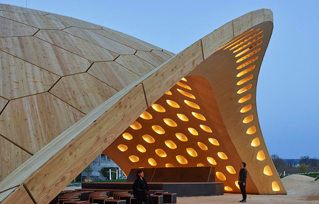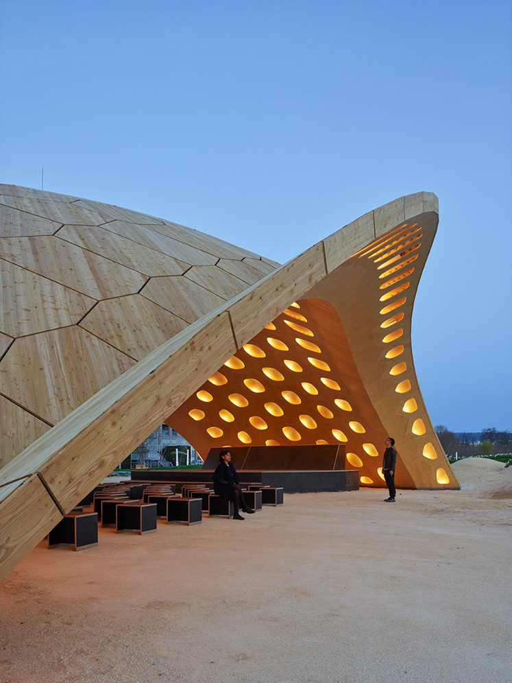 En paviljong skapad av limträ av gran, byggd med robotteknik och med idén att använda så lite material som möjligt genom att skapa mer form. Buga är årets bidrag från universitetet i Stuttgart till utställningen Bundesgartenschau i Heilbronn.