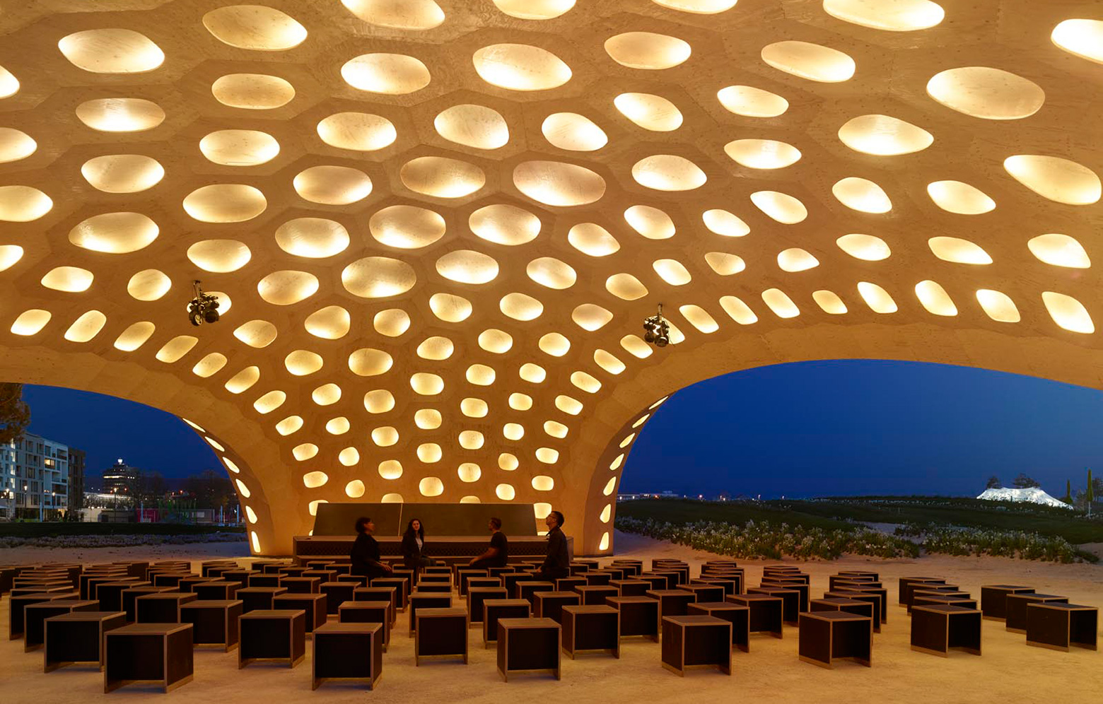 Paviljongen mäter 32 x 25 meter och är uppbyggd av 376 polygonala träskivor. Konstruktörerna har studerat skeletten hos sjöborrar och därefter använt samma princip för att ta fram den avancerade strukturen. Varje segment består av sex lager: bottenplattan följs av ett lager med reglar av limträ, och ovanpå en skiva, allt av gran. Ovanpå konstruktionen ligger ett vattentätt membran, följt av ett listverk som hjälper regnvattnet att rinna av, och allra överst sitter fasadpaneler av lärkplywood. Segmenten är förbundna med totalt 17 000 fingerskarvar. Tack vare utformningen och segmentens ihålighet väger den självbärande konstruktionen endast 38 kilo per kvadratmeter.