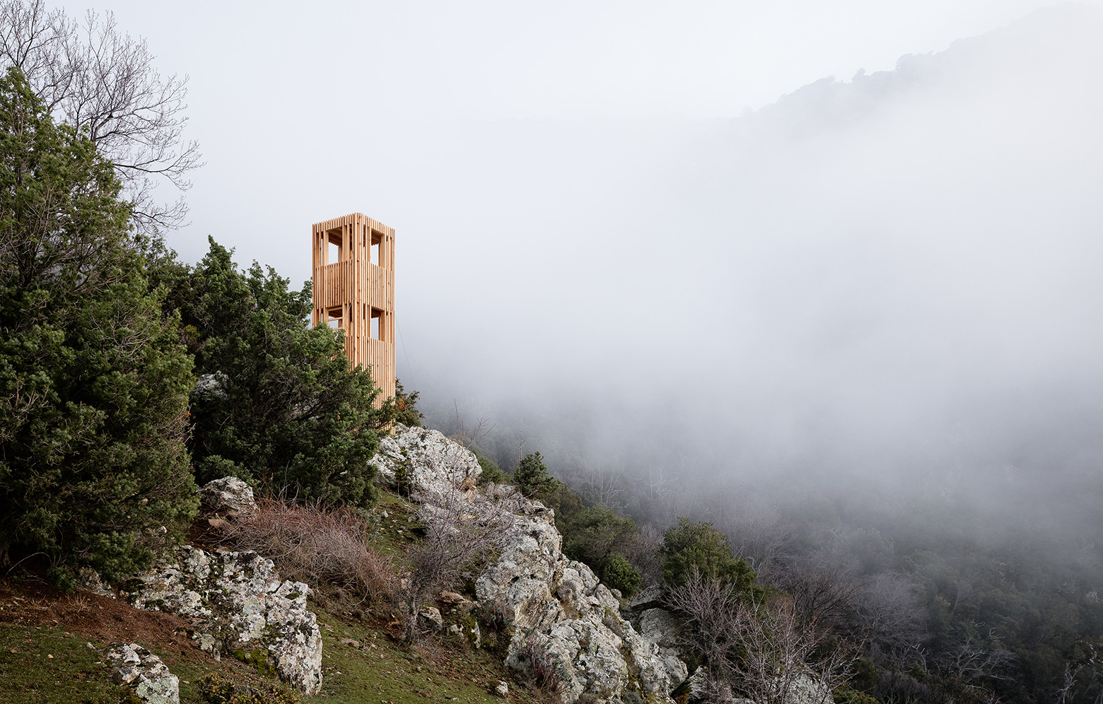 I slutet av 1960-talet var den korsikanska hjorten utrotningshotad. Tack vare öns naturvårdsprogram har stammen nu kommit tillbaka och åter börjat växa. Nu fortsätter programmet med en informationskampanj. För att ge såväl bofasta som besökare möjlighet att upptäcka och studera djuren utan att störa dem har tre observationstorn byggts på olika platser i den nationalpark som täcker 40 procent av öns yta. Tornen är totalt åtta kvadratmeter i två våningar, med en tillhörande trappa. Varje torn har anpassats för att smälta in i den lokala terrängen.