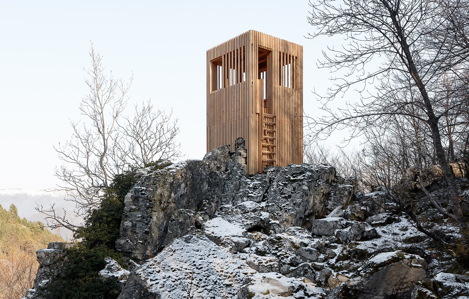 Samtliga utkiksplatser känns igen på sina genomgående räta former, där de smala ribborna ska påminna om en skog med täta trädstammar. När solen är framme skapar de också ett spännande skuggspel. Träet kommer från de lokala skogarna, och placerade på bergstoppar ger tornen besökaren en bra utkiksplats samtidigt som de döljer observatören som därmed inte stör djurlivet.