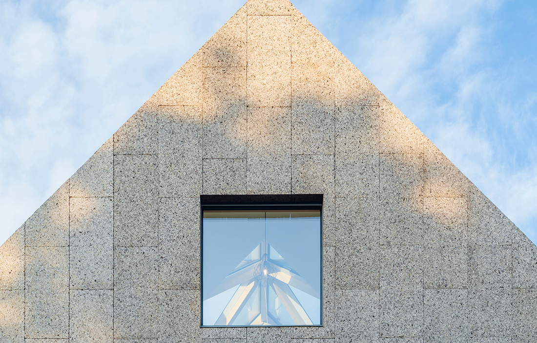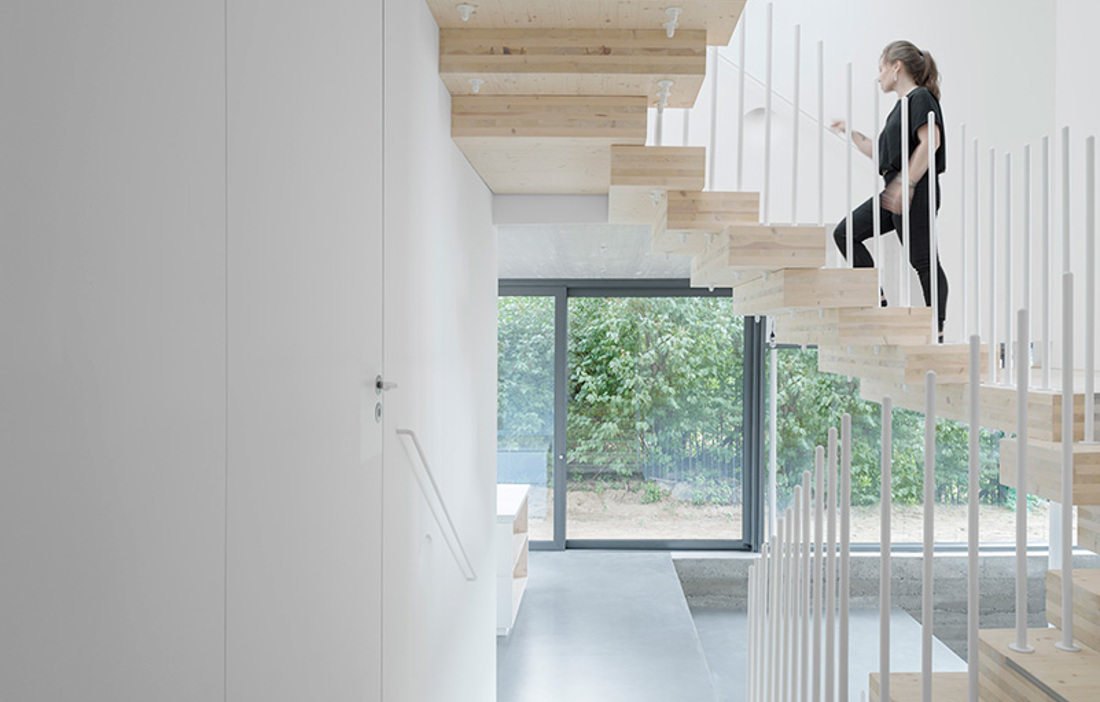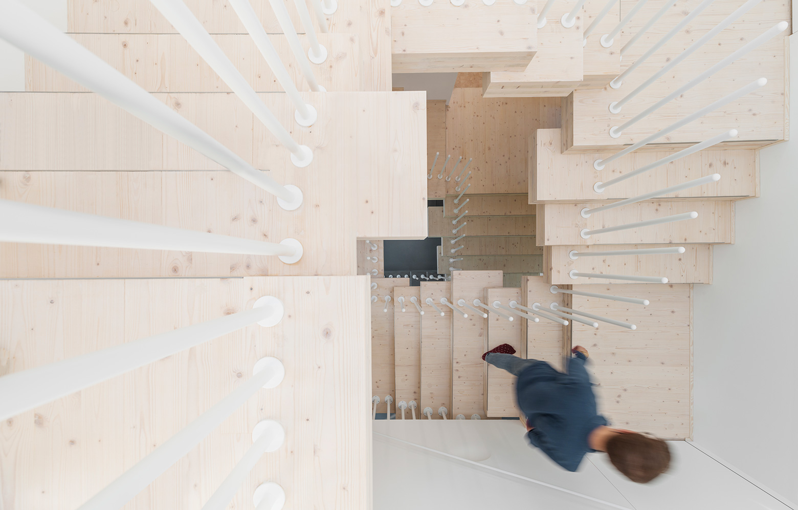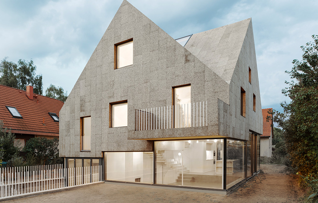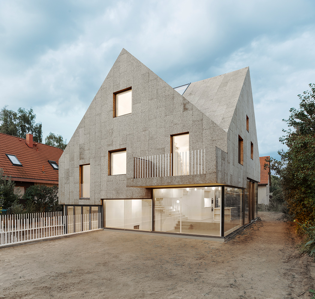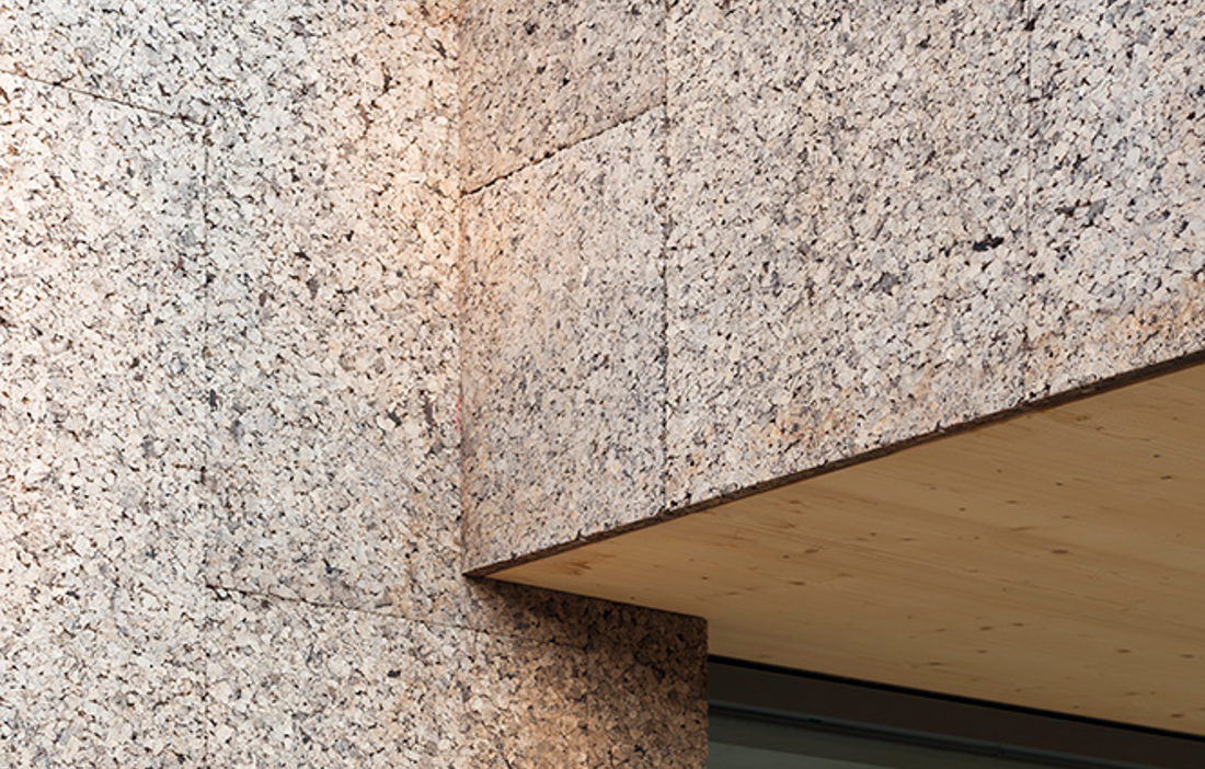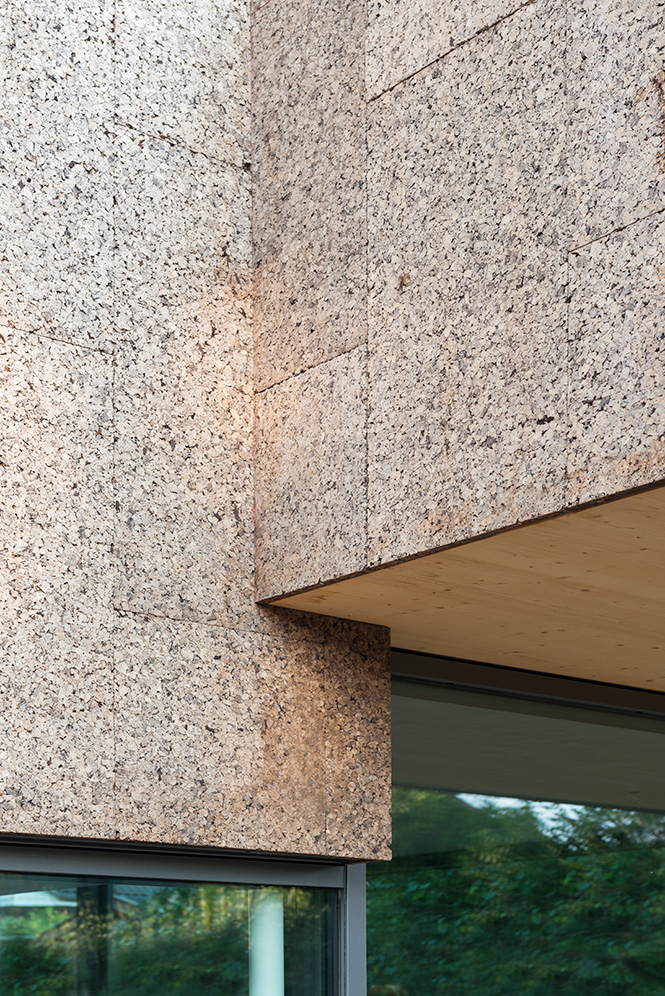 Det började med ett starkt önskemål om att det nya hemmet skulle få bästa möjliga akustik. Rundzwei Architekten fann då ett material som fungerade inte bara som ljudförbättrare och isolering, utan kork blev också avgörande för att ge den tyska villan dess speciella uttryck. Kork, som används för till exempel vinflaskor och underlägg, hämtas från korkekens bark. De smulor som under produktionen blir till restprodukter kan används till annat, till exempel till husfasader och tak. När granulatet värms och pressas till paneler för bland annat fasader, frigörs kåda som binder samman smulorna. Resultatet blir ett lätt och hållbart byggelement. Invändigt syns generösa inslag av ljust trä, allt format runt den spiraltrappa som leder besökaren genom husets våningar och som tillsammans med gipsskivor ska ge ett behagligt inomhusklimat med lagom luftfuktighet. Isoleringen är av kork, träfiber och cellulosa, och sammantaget gör detta att inget ventilationssystem behövs i villan.