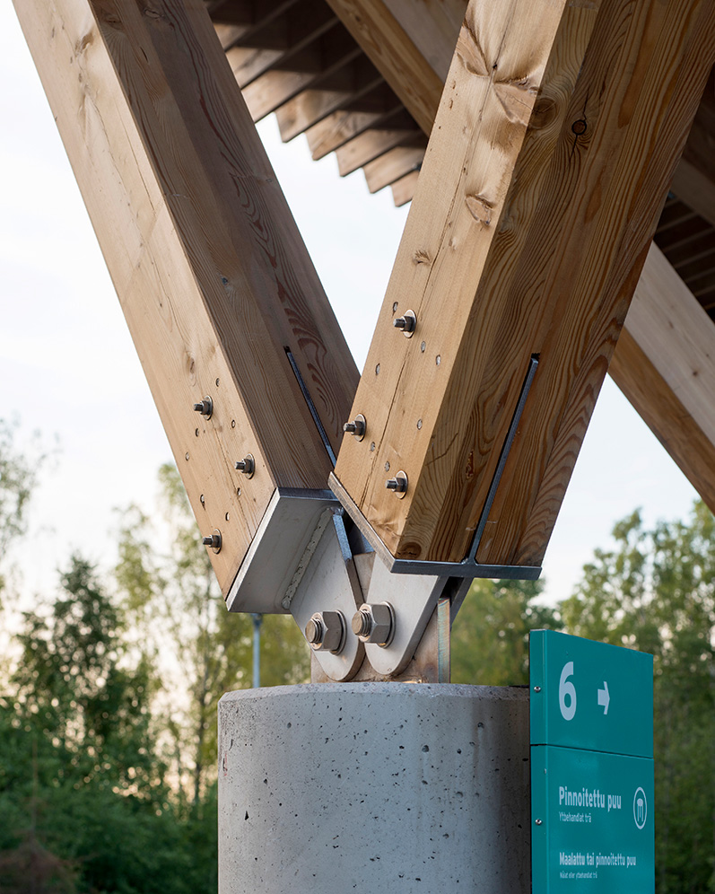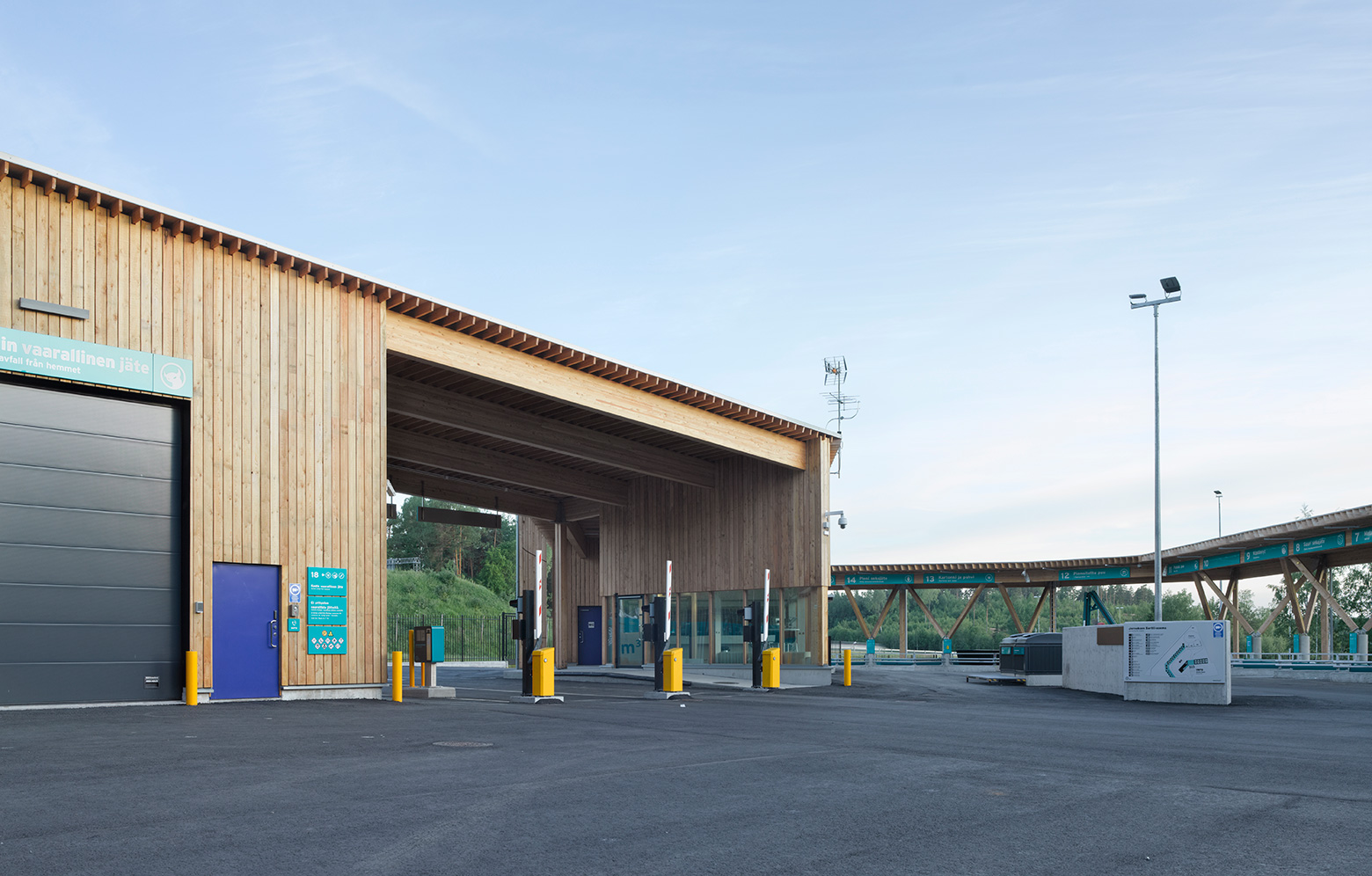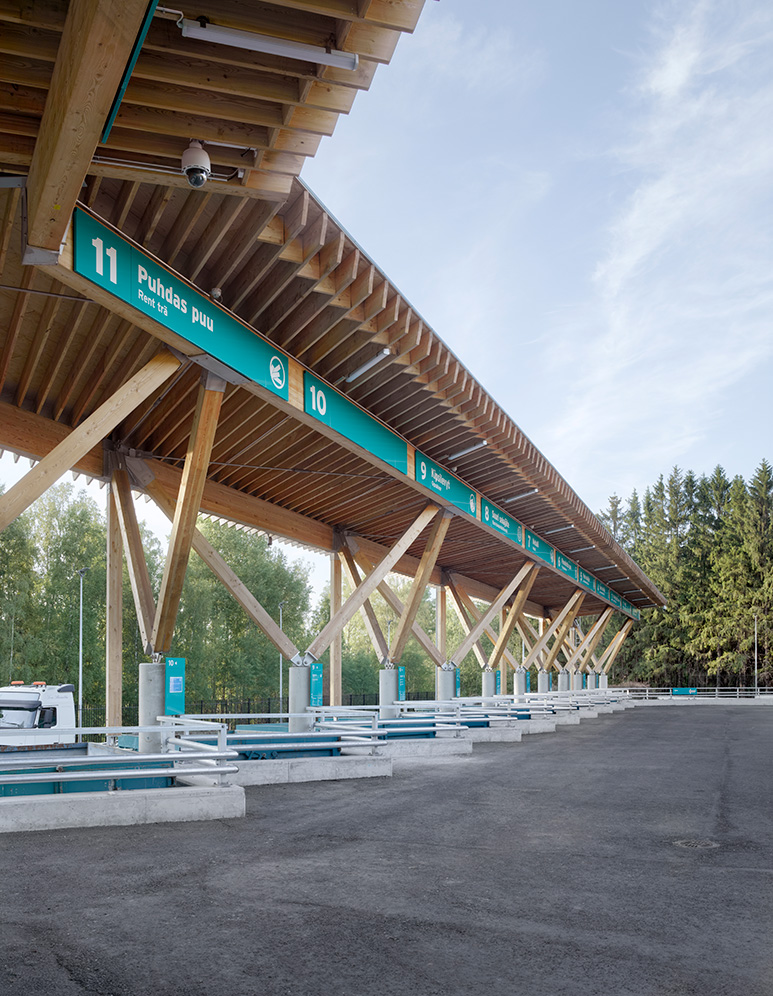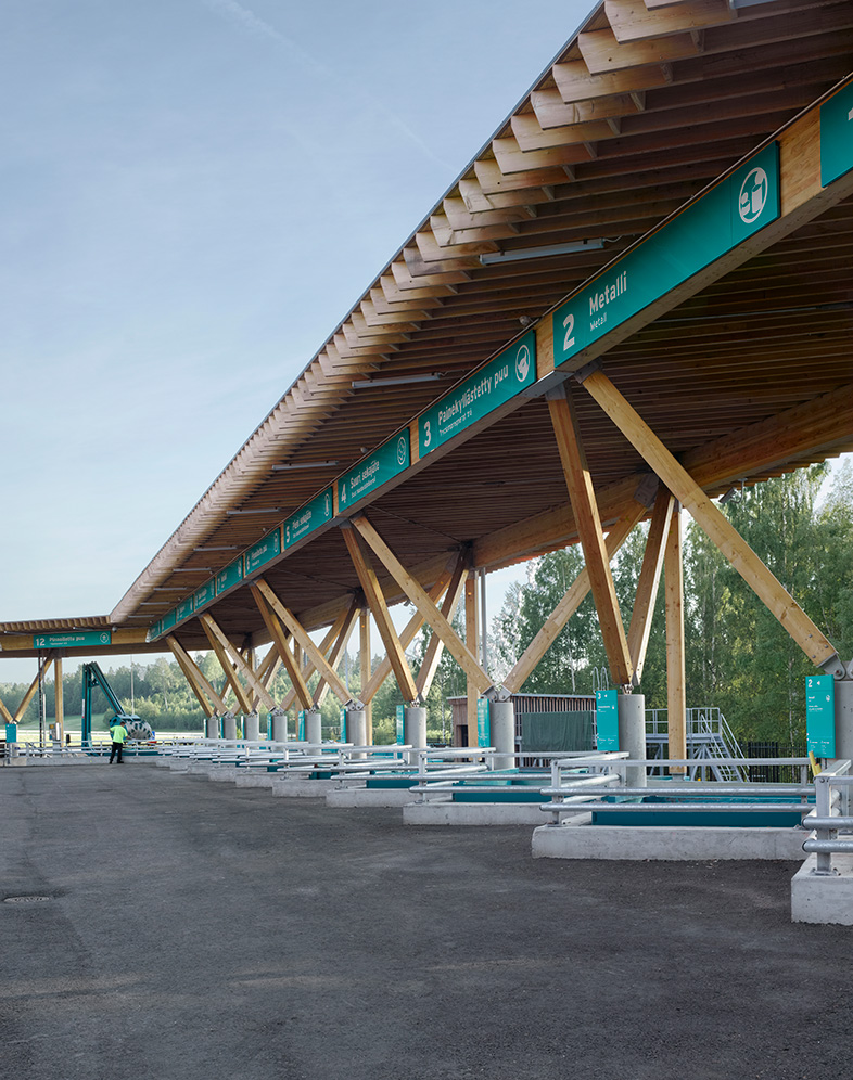I Finland, tre mil väster om Helsingfors, har Virkkunen & Co skapat en återvinningsstation som ska ha så liten miljöpåverkan som möjligt. Konstruktionen består huvudsakligen av KL-trä samt massiva limträbalkar och -pelare av sibirisk lärk. Träytorna är synliga såväl interiört som exteriört och behandlade med vitpigmenterat skyddsvax som hindrar träet från att mörkna av solljuset. Även fasaderna är klädda med sibirisk lärk, i form av en stående panel där träet lämnats obehandlat och med tiden kommer att gråna.