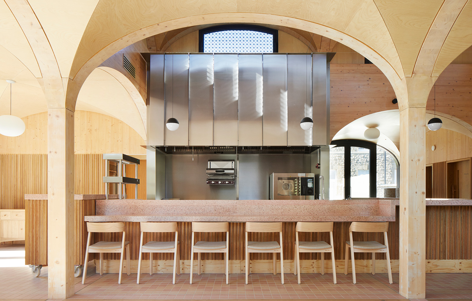 Restaurangen är designad som en fristående paviljong klädd med pulverlackerad aluminium och mörkmålad träpanel. Trots sitt moderna uttryck, harmoniserar exteriören väl med de äldre intilliggande byggnaderna med stenfasad. De distinkt välvda bågarna är utmärkande för formen, men det är först när besökaren kommer in i byggnaden som de kommer riktigt till sin rätt. Den synliga konstruktionen består av repetitiva bågar som mäter 4 x 4 meter och som har sågats fram ur KL-träelement. De stöttas av pelare av limträ. Valvformen förstärks med skivor av plywood. Det betsade träet knyter tillsammans med granitskivor och metall samman inredningen till en ljus och harmonisk plats.
