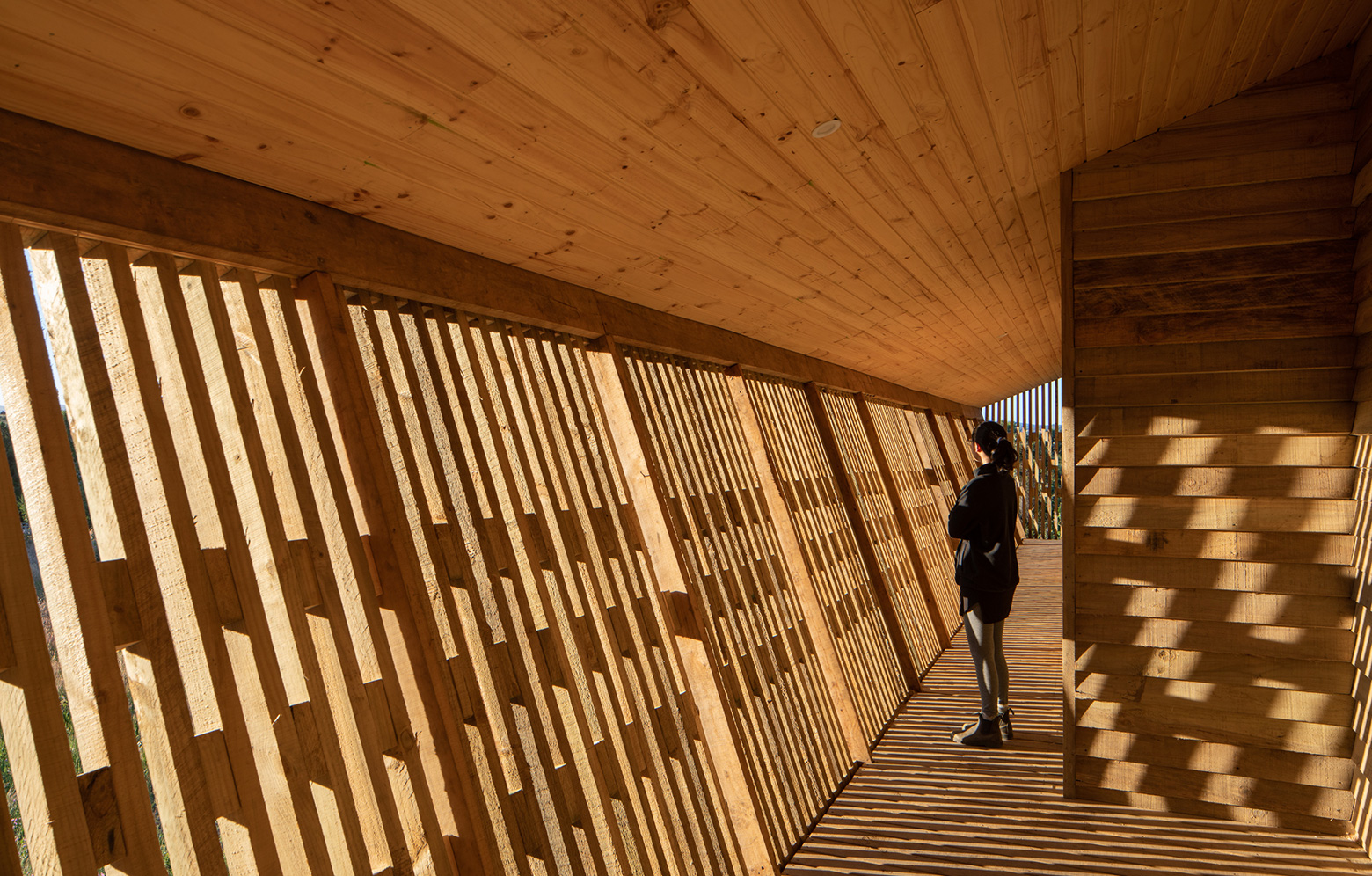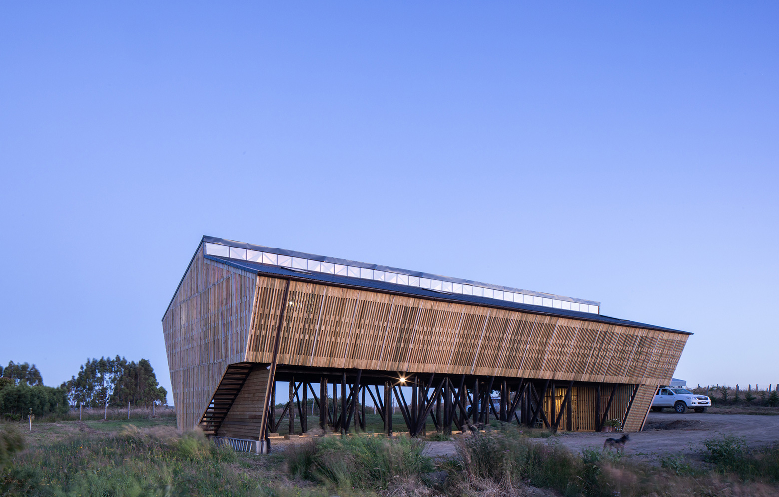 Byggnaden har plats för flera gäster och är formad som en enhet. Tre meter upp från marken vilar volymen på limträpelare. Det luftiga uttrycket bibehålls tack vare det halvgenomskinliga skalet av grovt sågade furubrädor som i tre väderstreck omger byggnaden och som genom en korridor binds ihop med husets fasad, allt utformat för att ägaren och grannarna ska slippa insyn till sina privata hem.