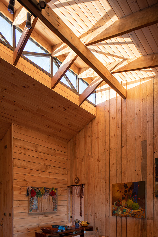Interiören består av träpanel av furu i varierade bredder som på väggarna har placerats såväl horisontellt som vertikalt för att ge ett levande och robust uttryck. Dessa kompletteras av det såpaskurade furugolvet.