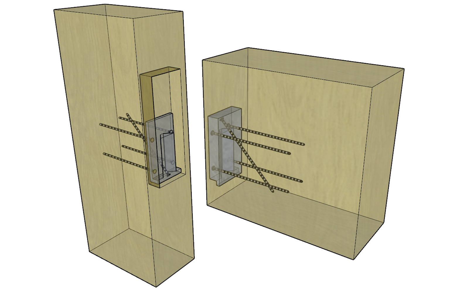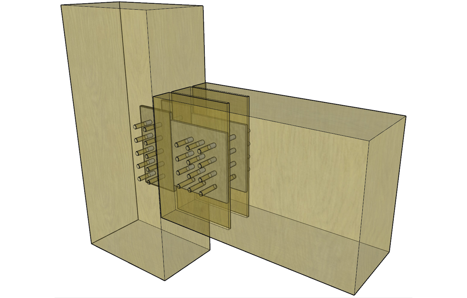 Inslitsade plåtar eller beslag – låses med hjälp av ståldymlingar eller träskruvar, är den vanligaste lösningen i större byggnader med synliga trästommar, se figur 1. För bästa brandskydd bör dymlings- och skruvhålen pluggas eller täckas med brandtålig fogmassa. Dimensioneringen följer Eurokoderna, och monteringen kan utföras delvis i fabrik eller helt på byggarbetsplatsen. Förbandet är lätt att kontrollera och kan demonteras när byggnaden renoveras eller rivs. Det används till exempel i höga trähus som Mjøstårnet i Norge och Kulturhuset i Skellefteå.