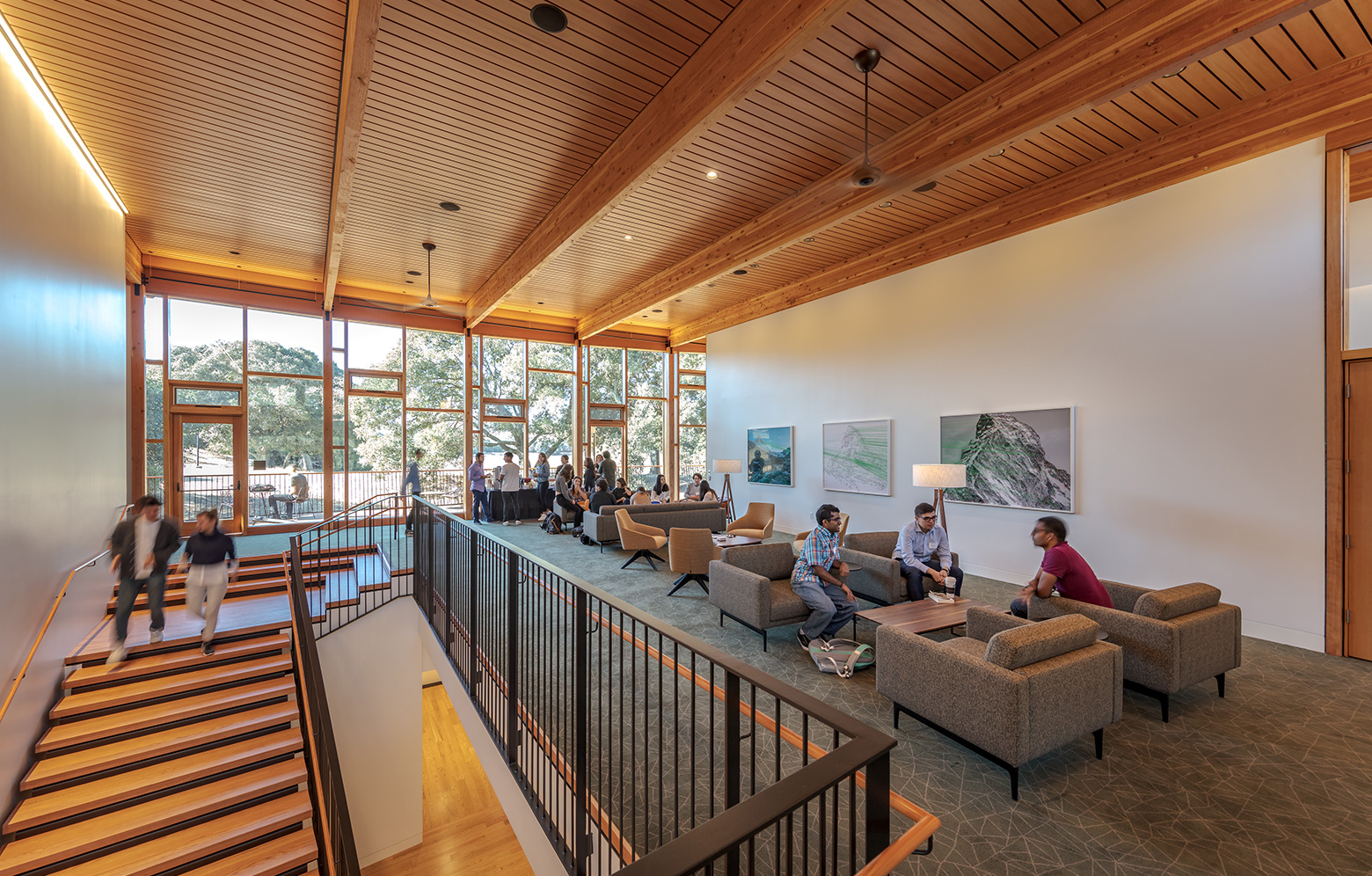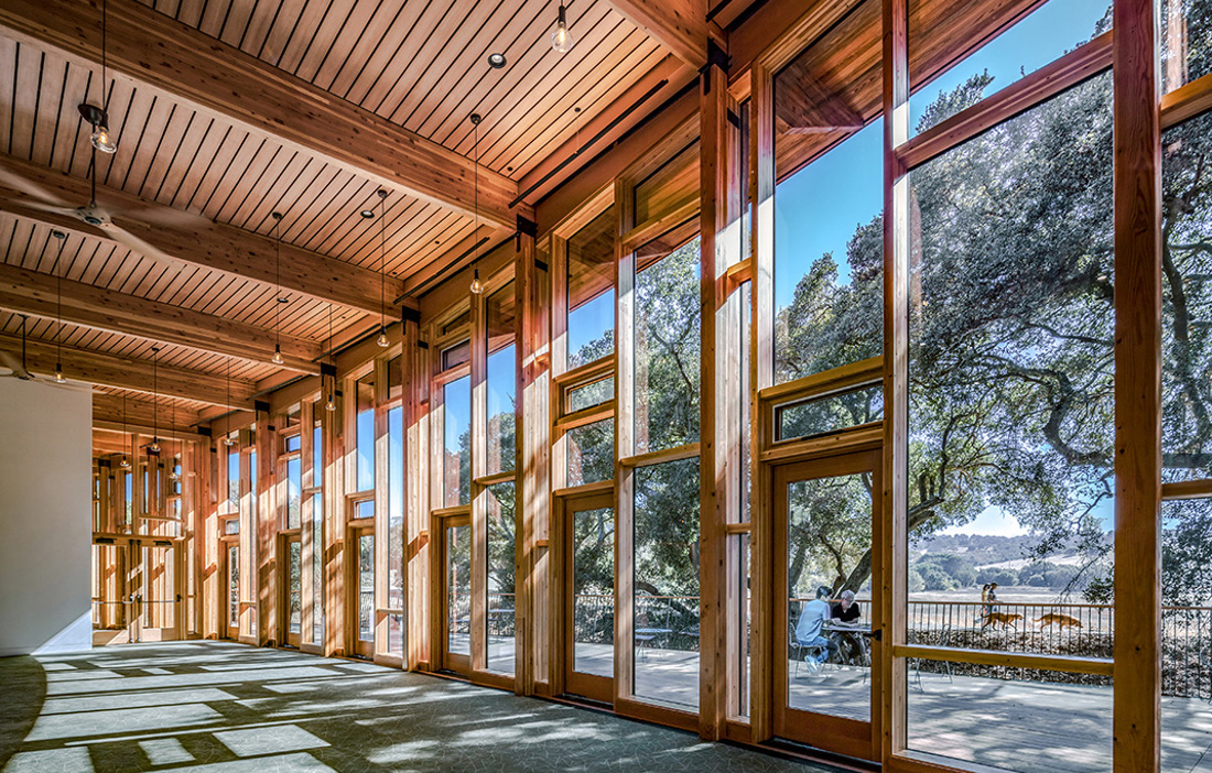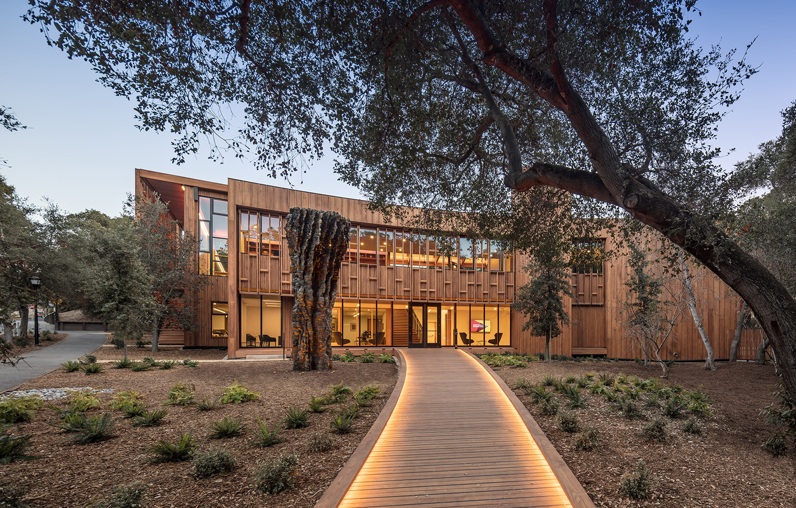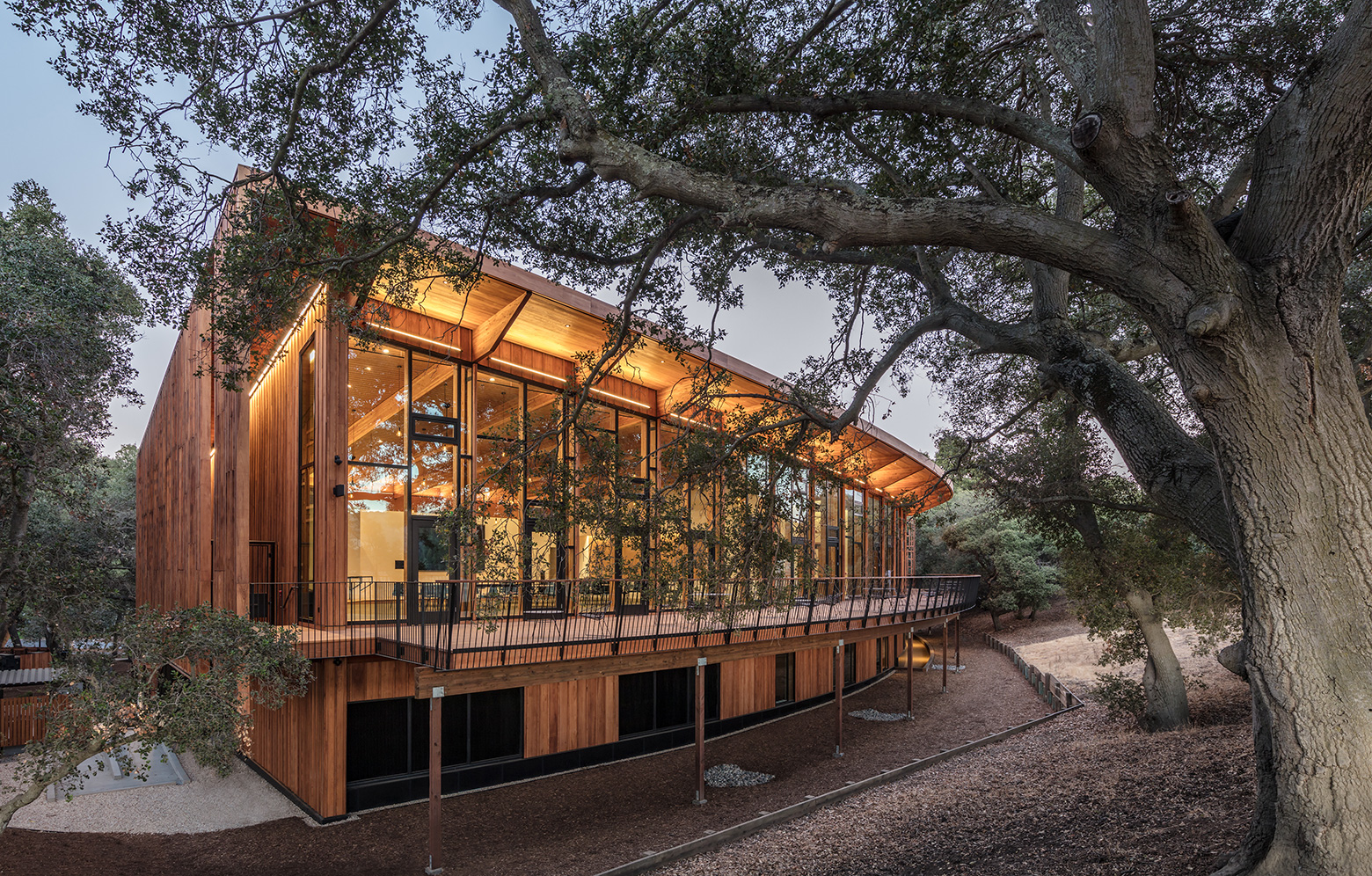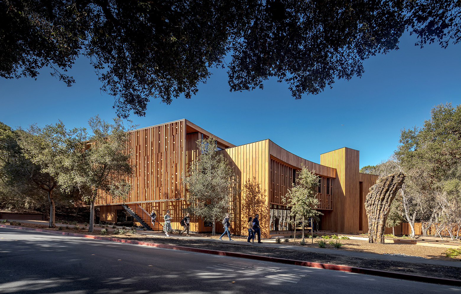 En tidigare parkeringsplats spelar en viktig roll för den nya byggnad som universitetet i Stanford har skapat för sina studenter. Man hittade platsen ovanför en sluttning vid Lake Lagunita. Den omgivande och täta ekskogen skapar ett lugn långt bortom universitetets livliga miljö, och det har Ennead Architects tagit fasta på när de skapat den lågmälda byggnaden där en lång svängd trägång leder fram till entrén. Placerad i sluttningen ner mot sjön erbjuder över-våningen makalös utsikt över omgivningarna, med vatten, skog och berg som inramning. Därför är restaurang, klassrum och studieplatser placerade på övre plan, medan administration och konferensmöjligheter finns på den mer ombonade mark-nivån.
