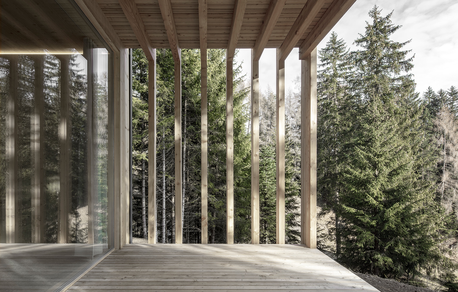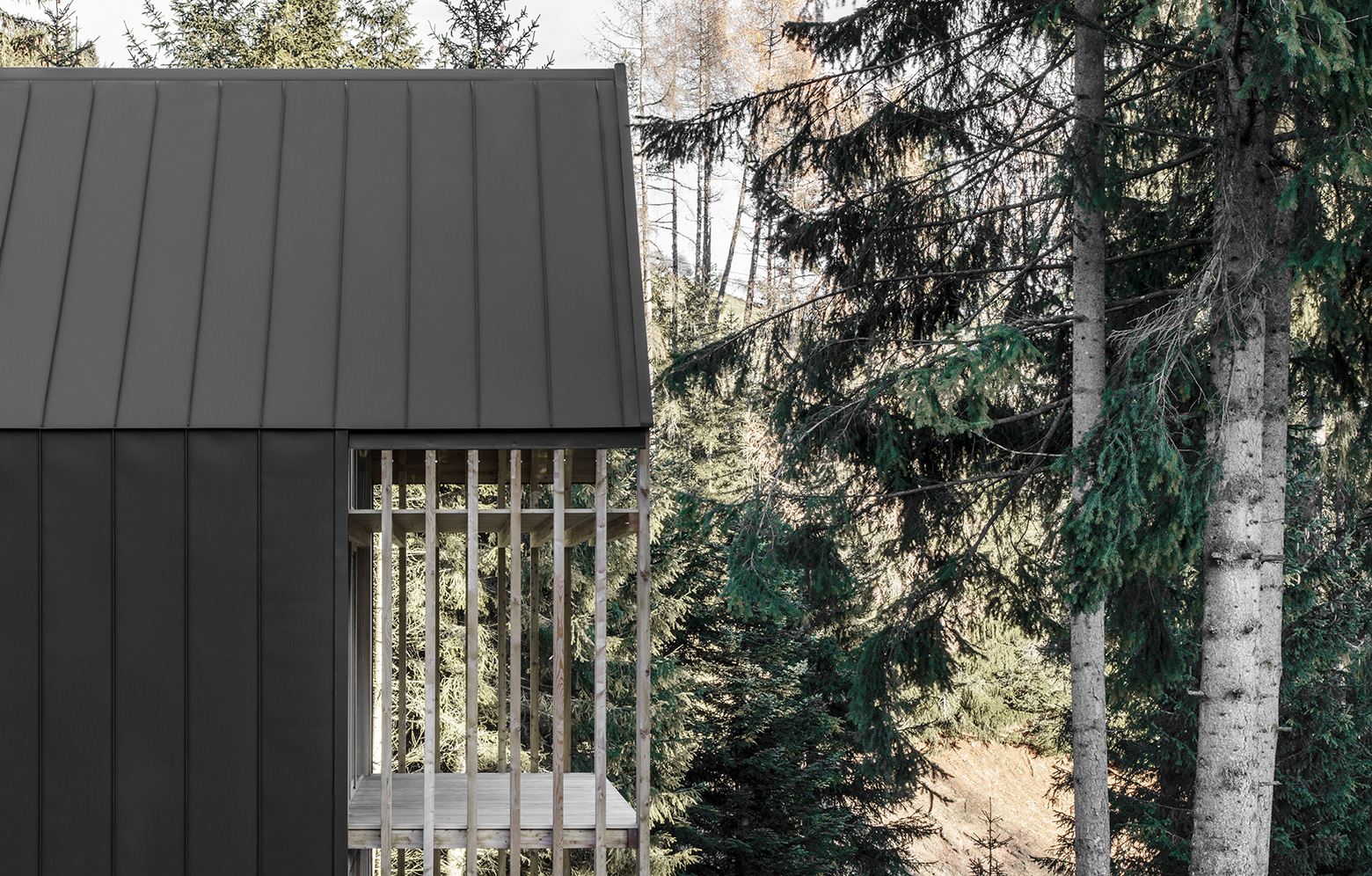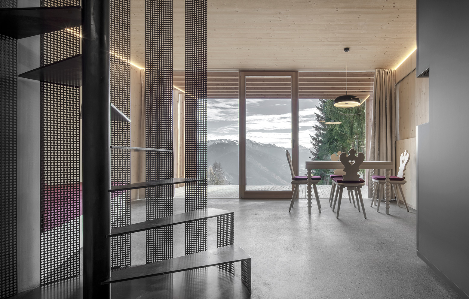 Gör så få ingrepp som möjligt och bevara så mycket som möjligt av omgivningen och den sluttning som stugorna vilar på. Det var Andreas Grubers filosofi när han skapade de tre gäststugorna i Sydtyrolen, där närheten till Dolomiterna och dess friluftsliv lockar turister från när och fjärran. Byggnaderna är visuellt sammanbundna till en enhet men samtidigt fristående och utformade med små privata nischer som trots de över-dimensionerade fönstren bidrar till att ge gästerna avskildhet.