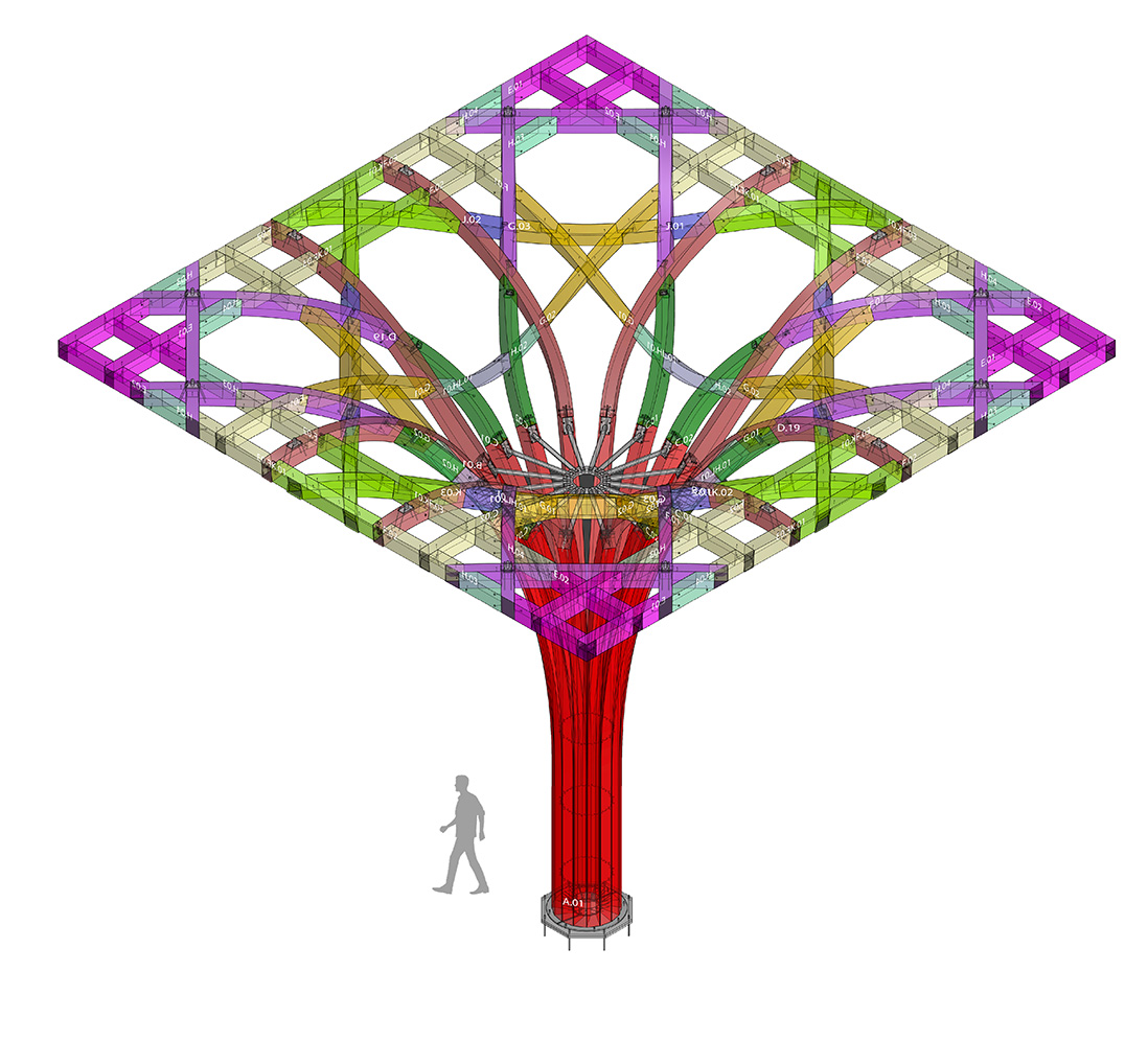 Arkitekterna föreställde sig en skogsdunge dit församlingens medlemmar skulle söka sig för samvaro och skugga. Utifrån den idén har man med hjälp av limträpelare av gran skapat stiliserade träd vars stammar och »kronverk« tillsammans med de omgivande väggarna av KL-trä utgör den bärande konstruktionen. Trädgeometrin består av ett repetitivt mönster, där varje träd har formen av en oktagon. Konstruktionen består av 30 träd som både bär upp byggnaden och skapar en harmonisk plats.
