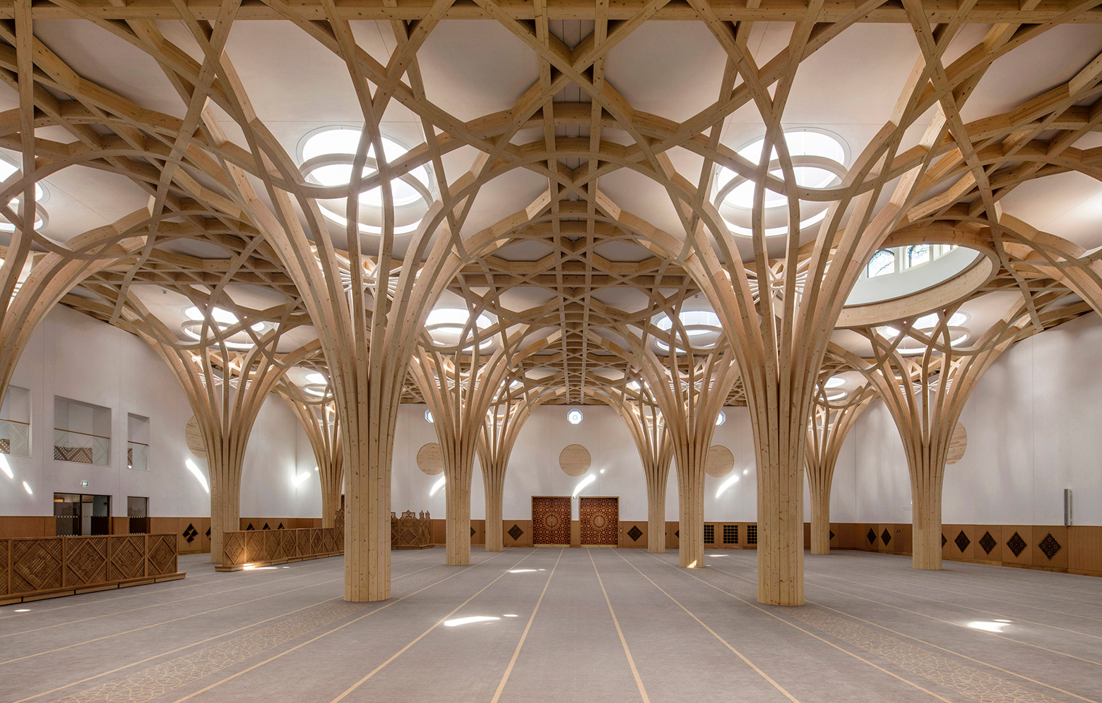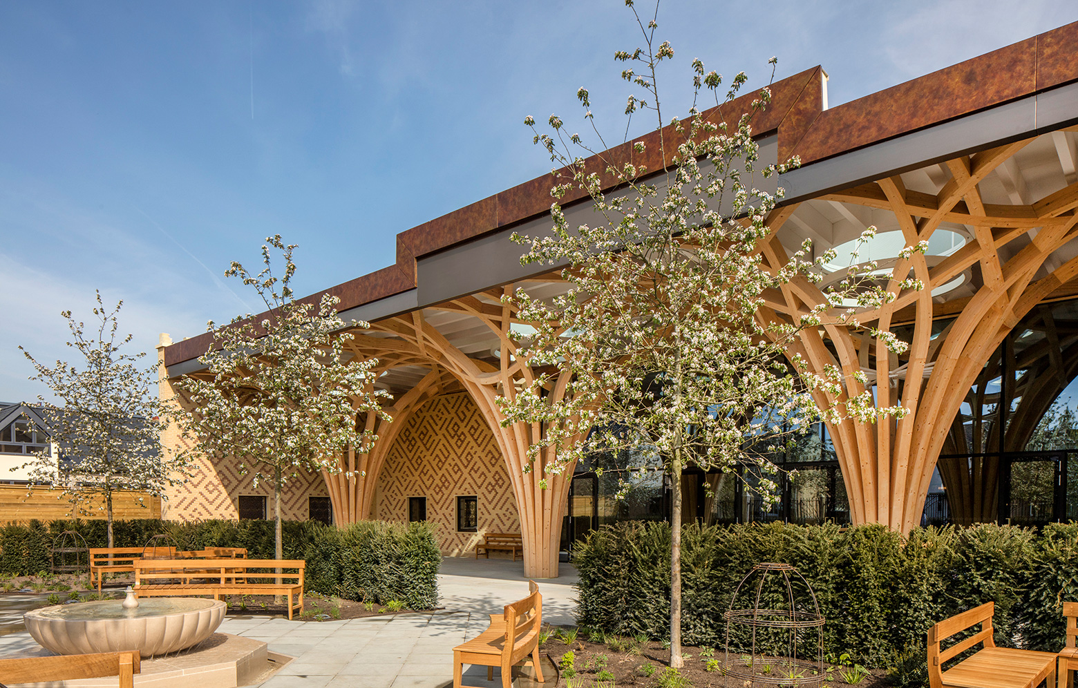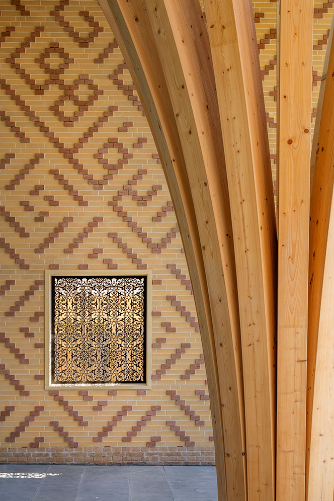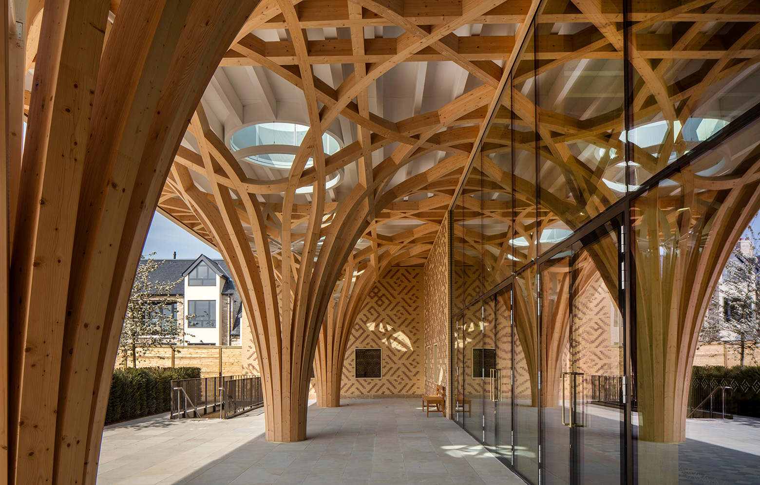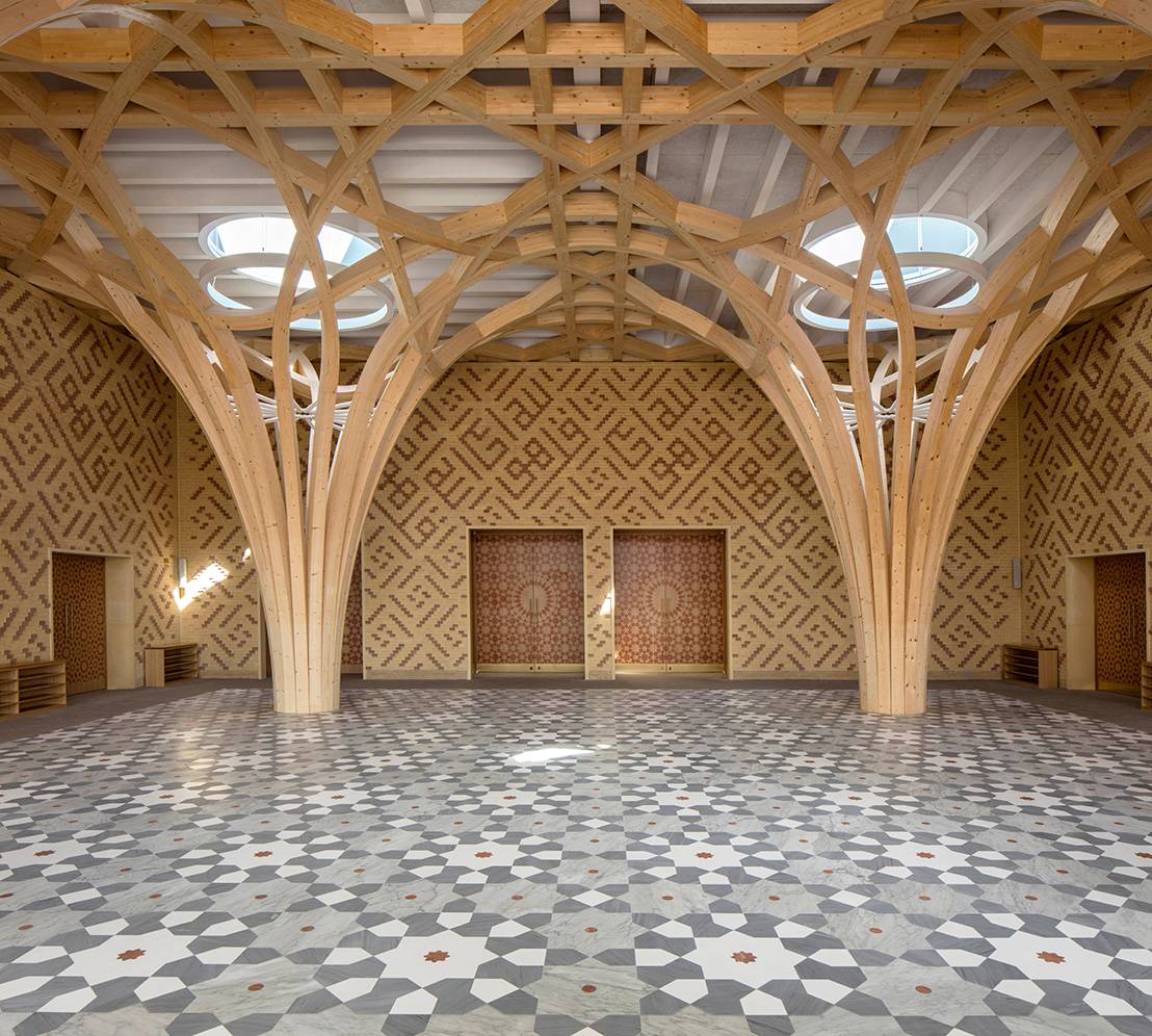 När man i Cambridge beslutade att bygga en ny moské, eftersom den tidigare blivit för liten, var det viktigt att den inte bara speglade den muslimska kulturen, utan det skulle också finnas plats för lokala referenser. Uppdraget gick till Marks Barfield som här har skapat en byggnad som på ett modernt sätt fångar upp såväl den brittiska arkitekturen som den muslimska kulturen, genom exteriört tegel utanpå väggarna, som är av KL-trä, och med invändiga trädpelare av limträ.