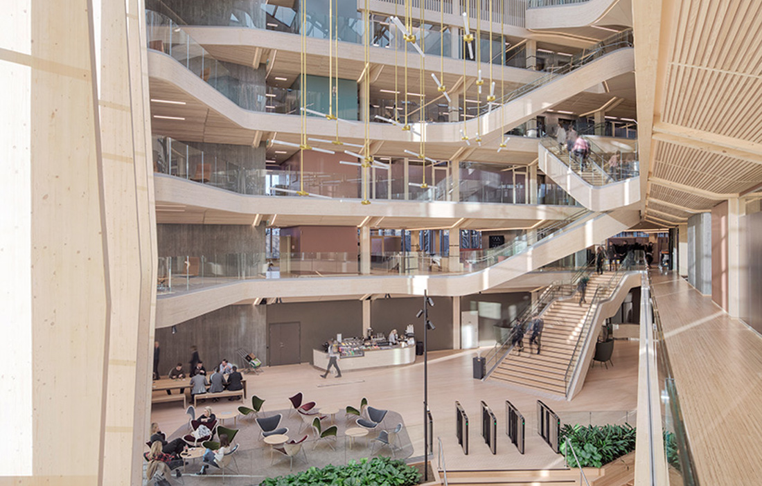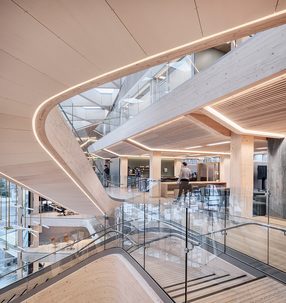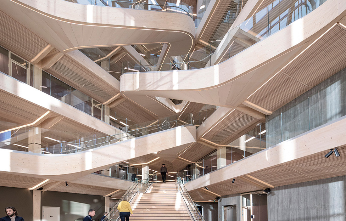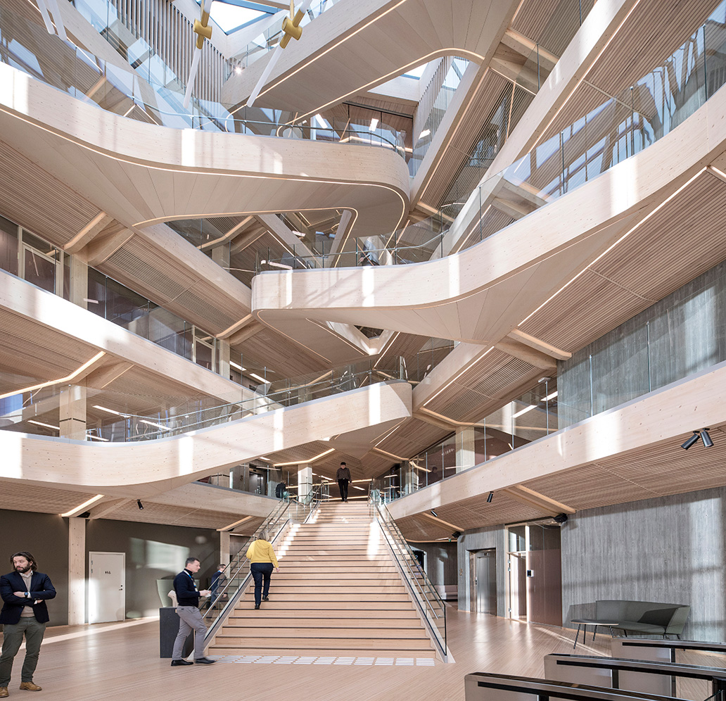Det är mycket som lätt hamnar i blickfånget i Finansparken, men kanske allra mest den skulpturala trappan som tar avstamp i huvudentréns öppna atrium och slingrar sig vidare upp i byggnaden. De dubbelkrökta limträbalkarna är tillverkade av Hess Timber i Frankfurt som är ett av få företag som kunnat bemästra den komplexa geometrin.
