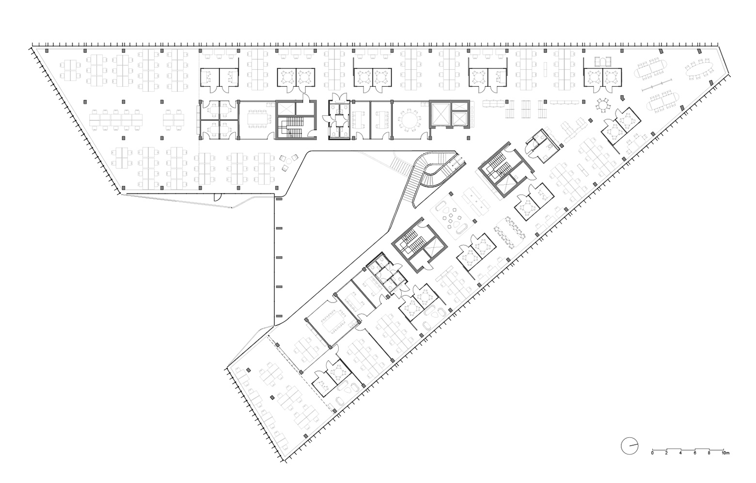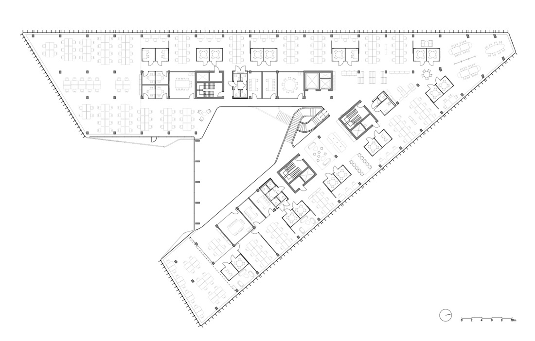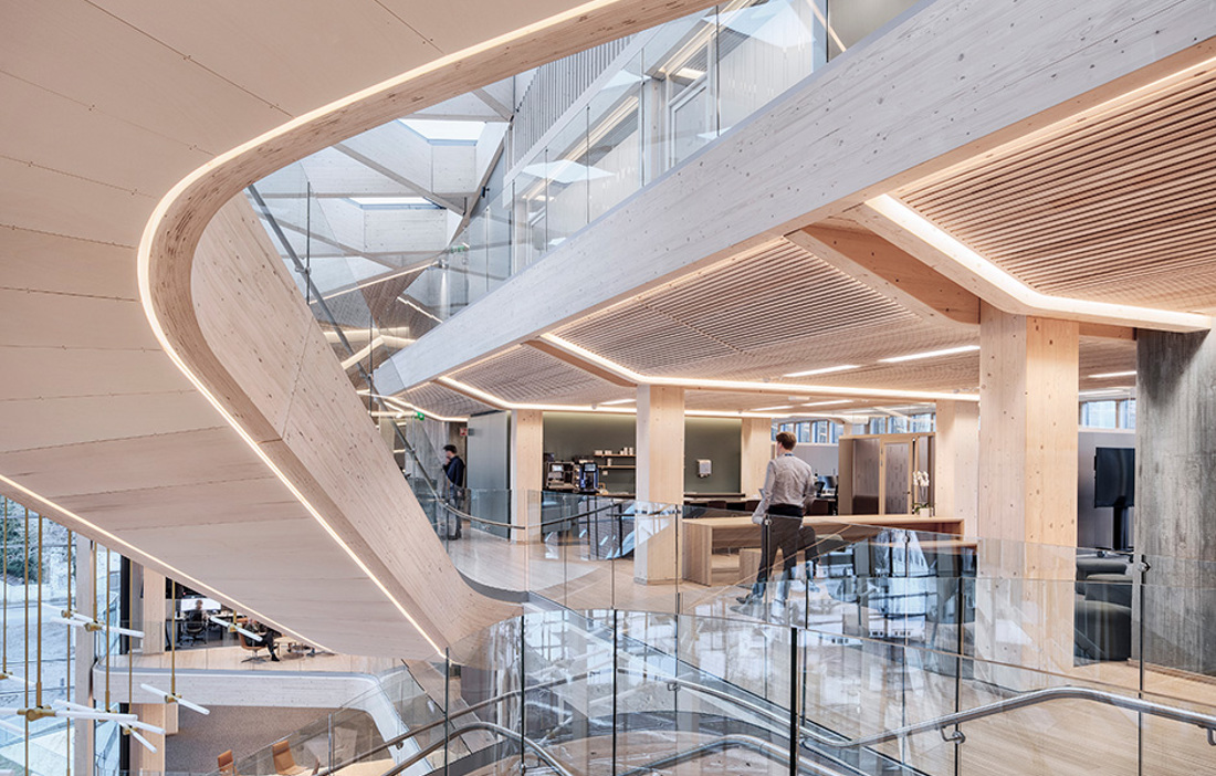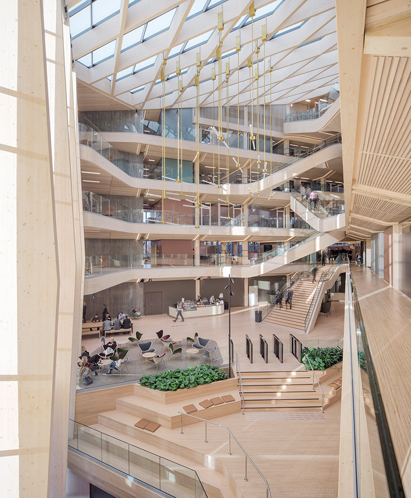 Det är mycket som lätt hamnar i blickfånget i Finansparken, men kanske allra mest den skulpturala trappan som tar avstamp i huvudentréns öppna atrium och slingrar sig vidare upp i byggnaden. De dubbelkrökta limträbalkarna är tillverkade av Hess Timber i Frankfurt som är ett av få företag som kunnat bemästra den komplexa geometrin.