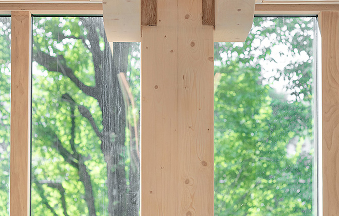 Entréplanet har dubbel takhöjd med färre pelare i syfte att skapa rymd. De pelare och balkar som använts i de första tre våningarna är tillverkade av fanerträ, LVL, i form av så kallat Baubuche från tyska Pollmeier. De har i huvudsak levererat 40 millimeters bokfanerskivor till Moelven Limtre som limmat och bearbetat materialet slutligt. Kvistfritt faner har använts i det yttersta skiktet på alla synliga ytor. Att bok är tyngre och starkare ger materialet både mycket hög drag-, tryck- och böjhållfasthet vilket gör att det går att bygga smäckrare än med traditionellt limträ av gran. Möjligheten att välja en extra hög ytkvalitetet gör även Baubuche till ett bra val i synliga konstruktionselement.