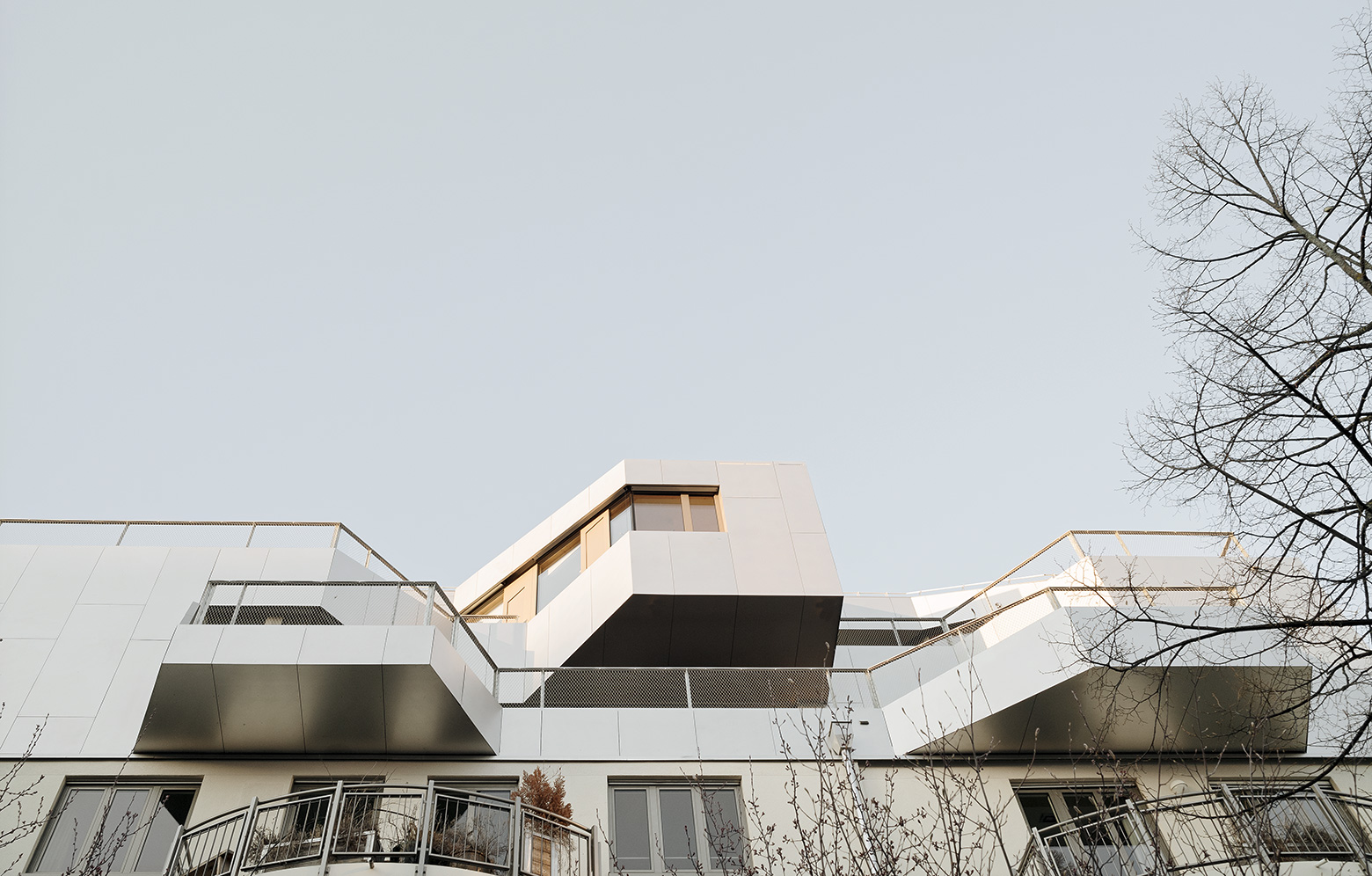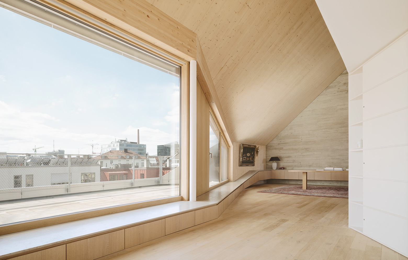 Vad gör man när man vill bygga ytterligare en våning på ett hus från 1980-talet, men den befintliga betongkonstruktionen inte är tillräckligt stark för det? I det tyska kvarteret rev man helt enkelt den översta våningen och la sedan till två våningar med stomme av KL-trä, som är tillräckligt lätt för att slippa förstärka den befintliga konstruktionen.