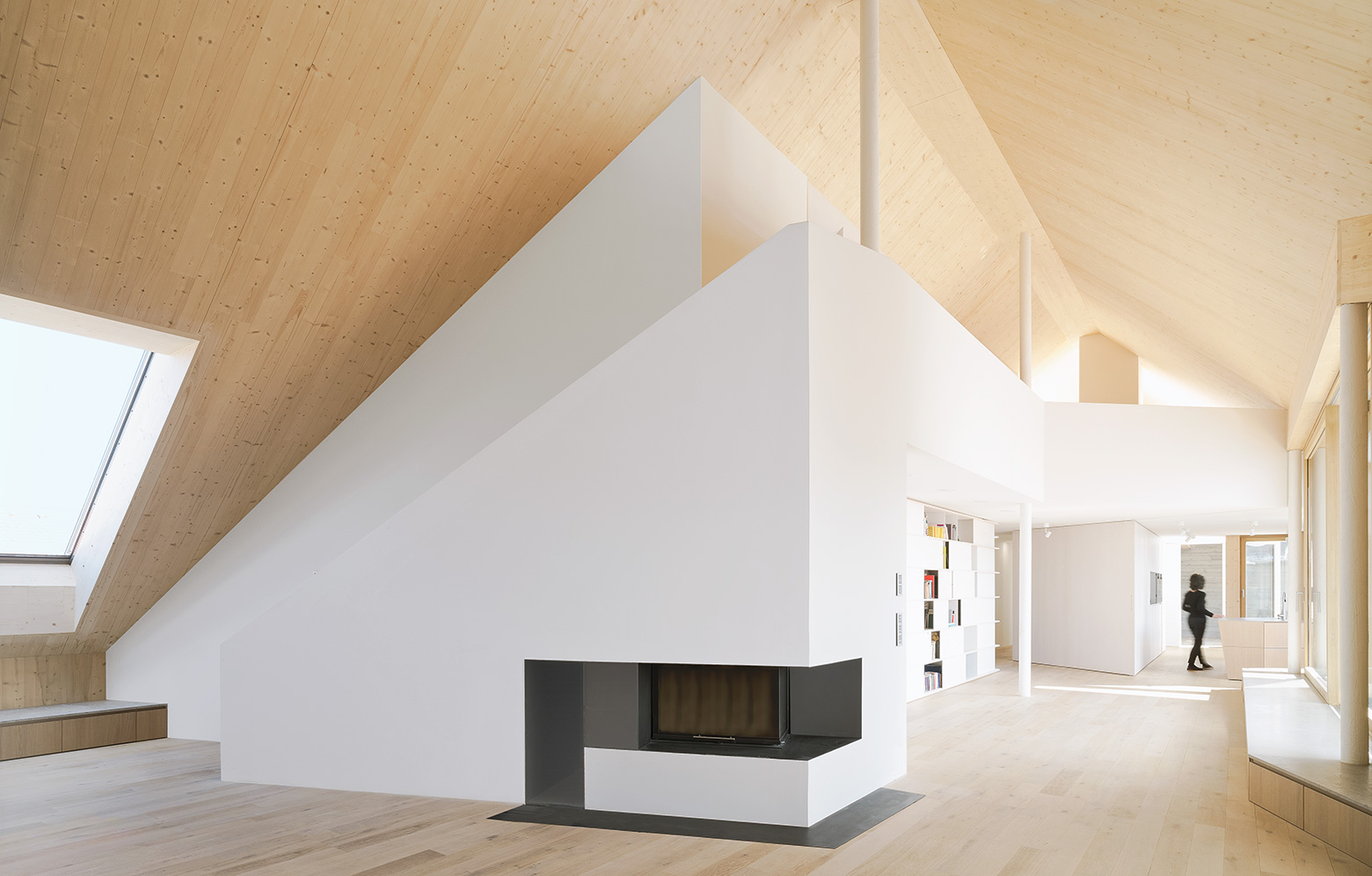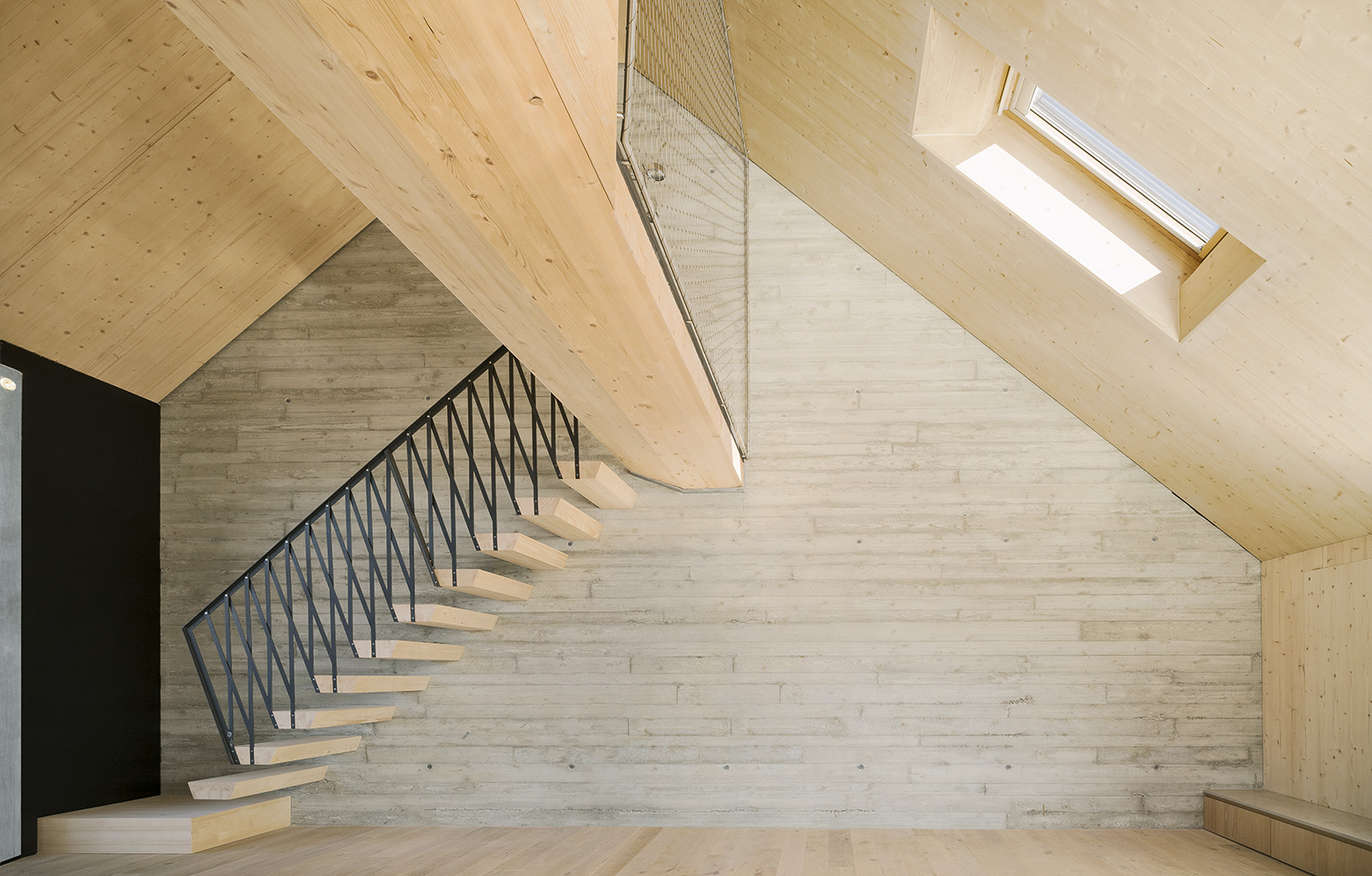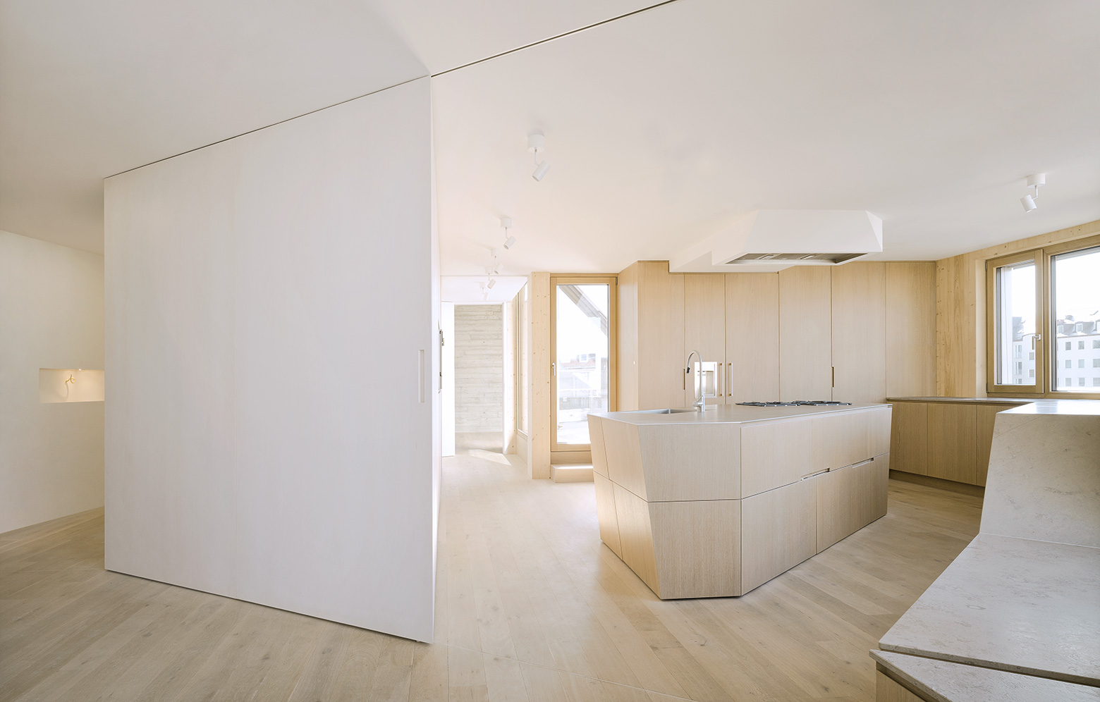 För att harmonisera med resten av byggnaden, och med övriga hus i kvarteret, har exteriören klätts med fasadplåt, vilket tillsammans med betong också syns i delar av interiören, som en påminnelse om husets ursprungliga utförande. Men invändigt är det emellertid det exponerade KL-träet som dominerar, vilket framför allt märks på vindsvåningen vars sluttande innertak ramar in hela våningen och binder samman rummen till en enhet. Den generösa takhöjden lämnar också plats för en mezzaninvåning med balkong, och arkitekterna har arbetat med att lyfta fram olika vinklar i interiören, en form de själva beskriver som ett slags skulptur.