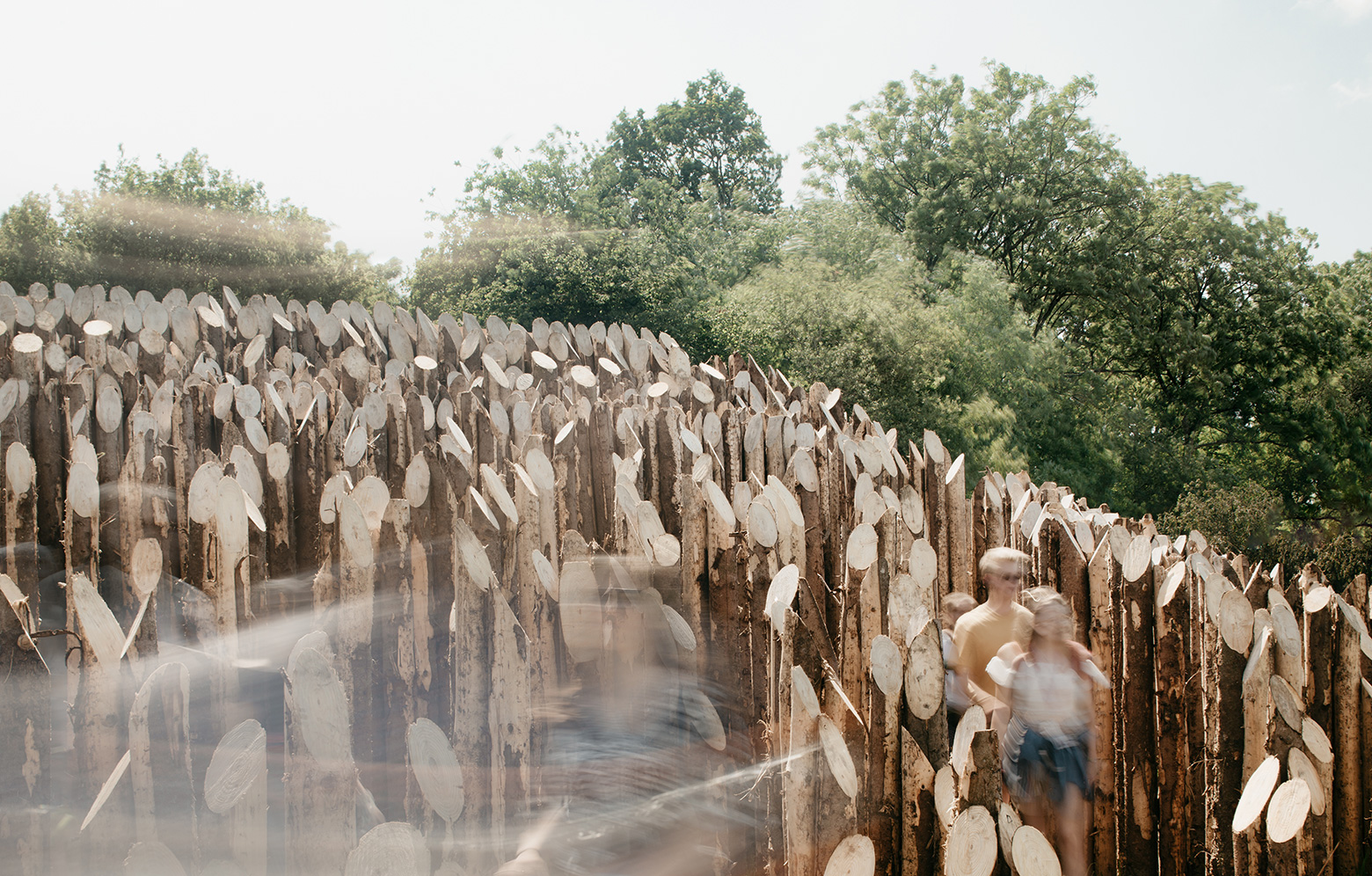 Granarna kapades i lämplig höjd men behandlades inte på något sätt, utan kvistmärken och bark fanns fortfarande kvar på de sammanfogade stammarna, vilket gav känslan av att promenera i en riktig skogsdunge.
