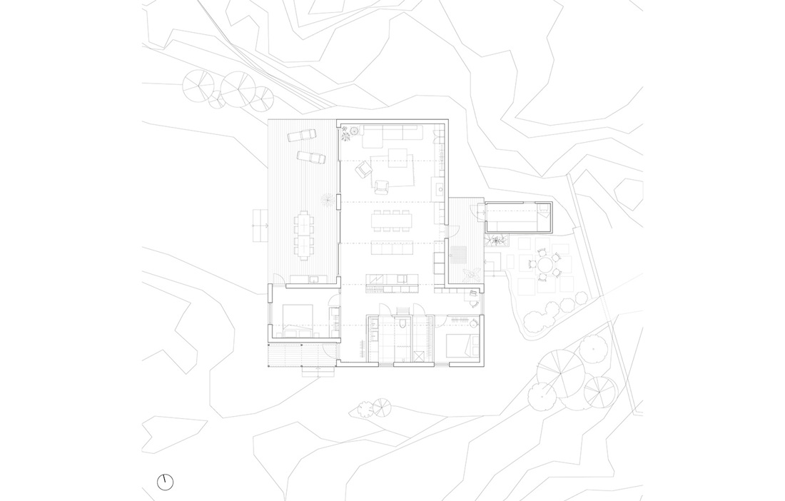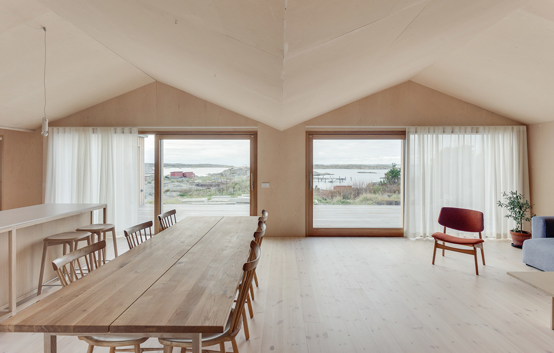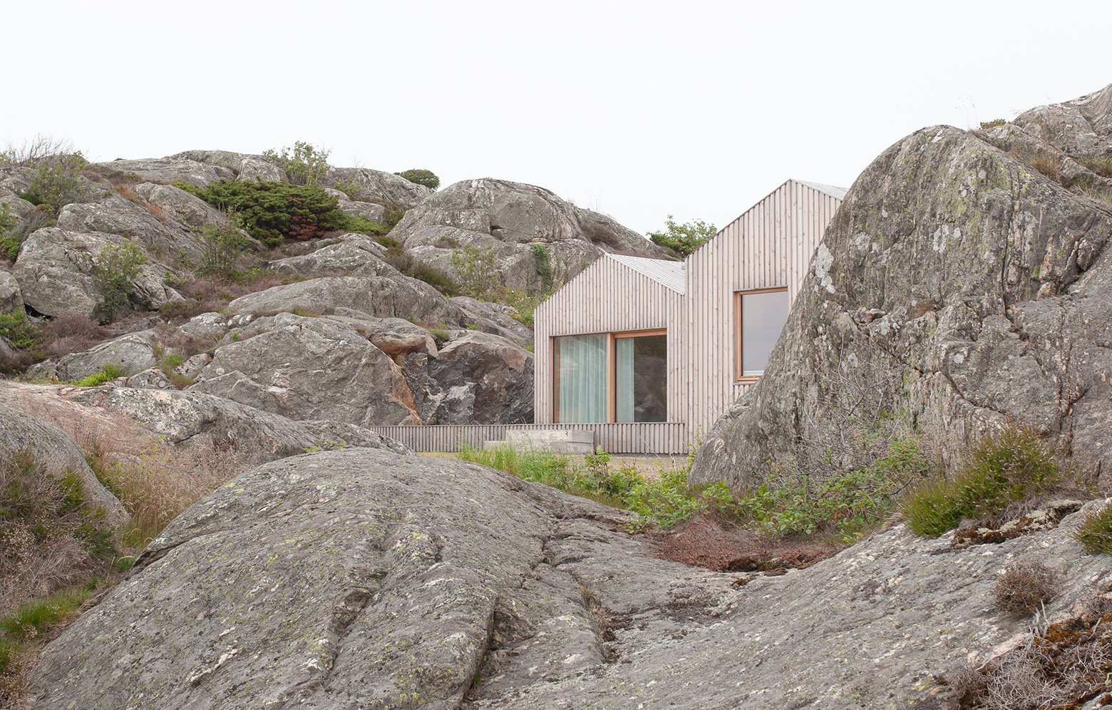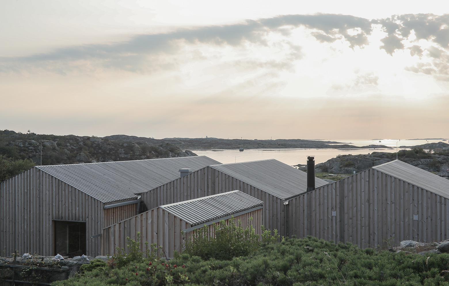– Vi ville förankra våra val i platsen, dels i volym och materialval, dels i tradition. Volymerna är anpassade till, och samspelar med, de omgivande klipporna samt utnyttjar tomtens förutsättningar för att skapa väder och insynsskyddade platser. Formerna hänvisar även till en välkänd traditionell typologi på västkusten, säger Mathias Holmberg, arkitekt och son till beställarna.