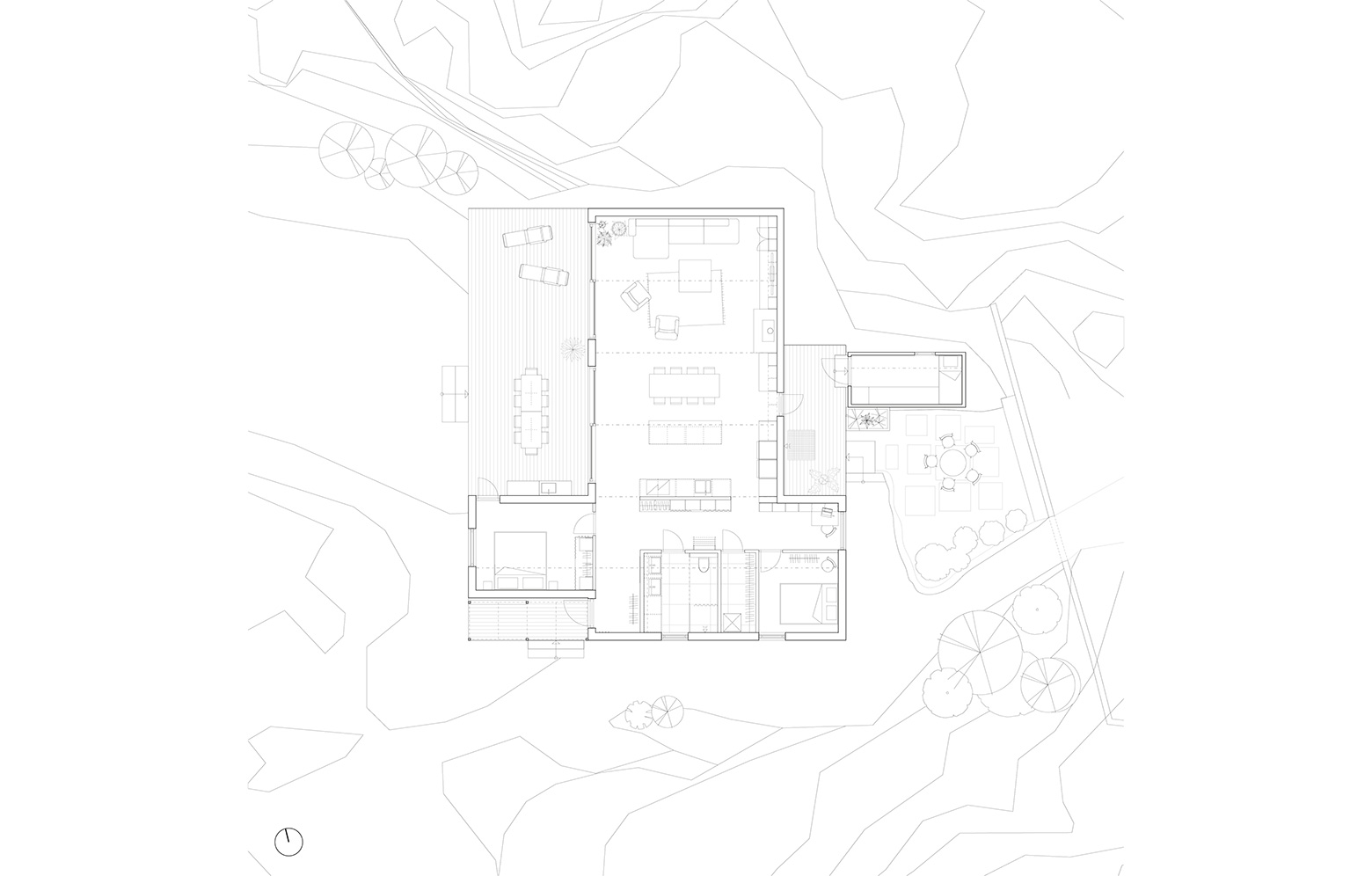 Att huset så diskret smälter in på platsen beror antagligen också på att taket är en förlängning av fasaden och tillsammans med den skapar ett monolitiskt uttryck.