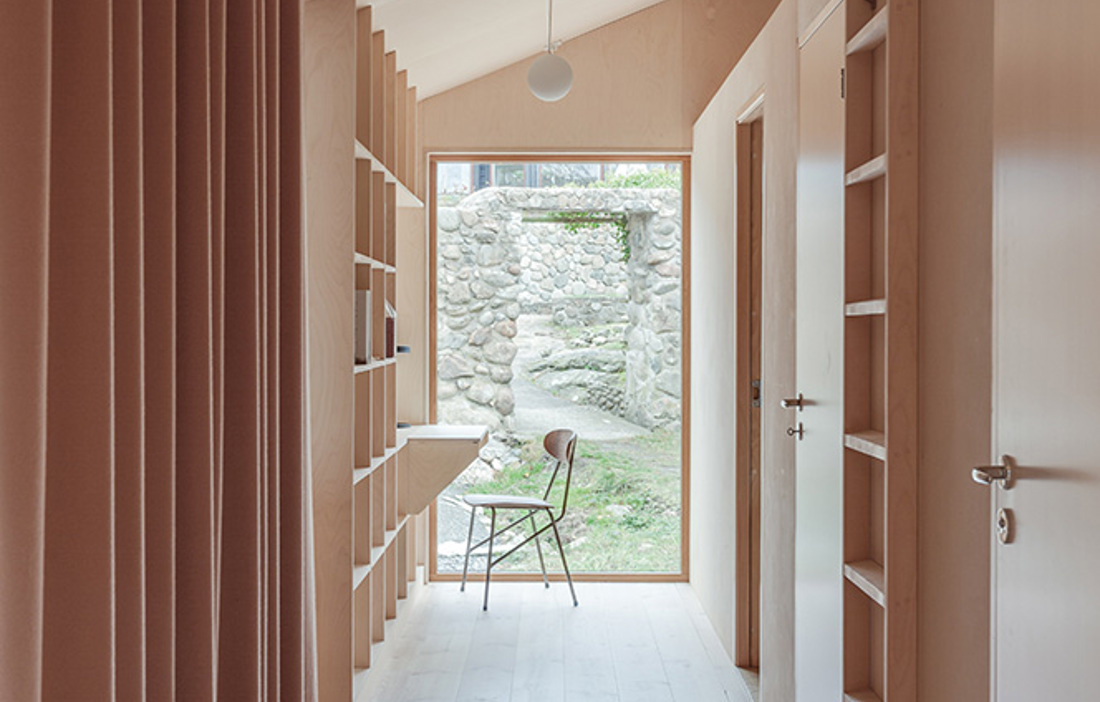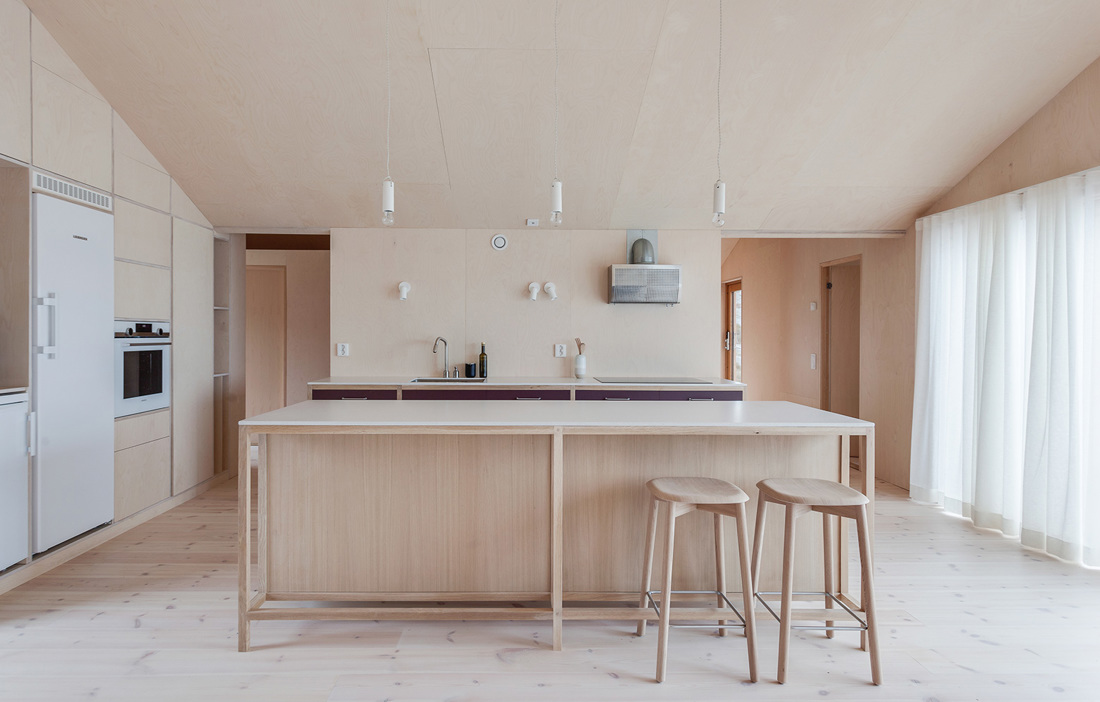 Det är inte bara exteriört som taket har blivit ett viktigt uttryck för huset. Även interiört spelar det en viktig roll, med rum som är öppna till nock och klädda med ljus björkplywood. Höjden växlar mellan 2,1 och 3,0 meter, och variationen skapar både rymd och god akustik med ljud som studsar tillbaka från väggar och tak, de öppna ytorna till trots. Samtidigt bidrar de skiftande nivåerna också till att markera de tre volymernas olika funktion: privat del med sovrum och badrum, kök med matplats samt sällskapsrum.