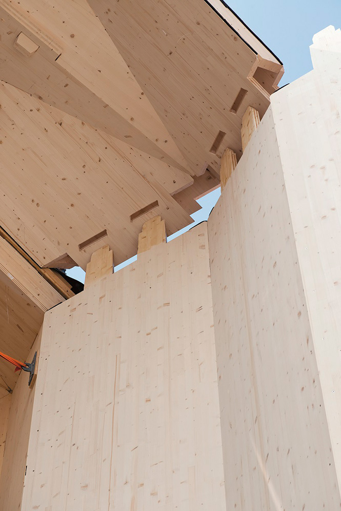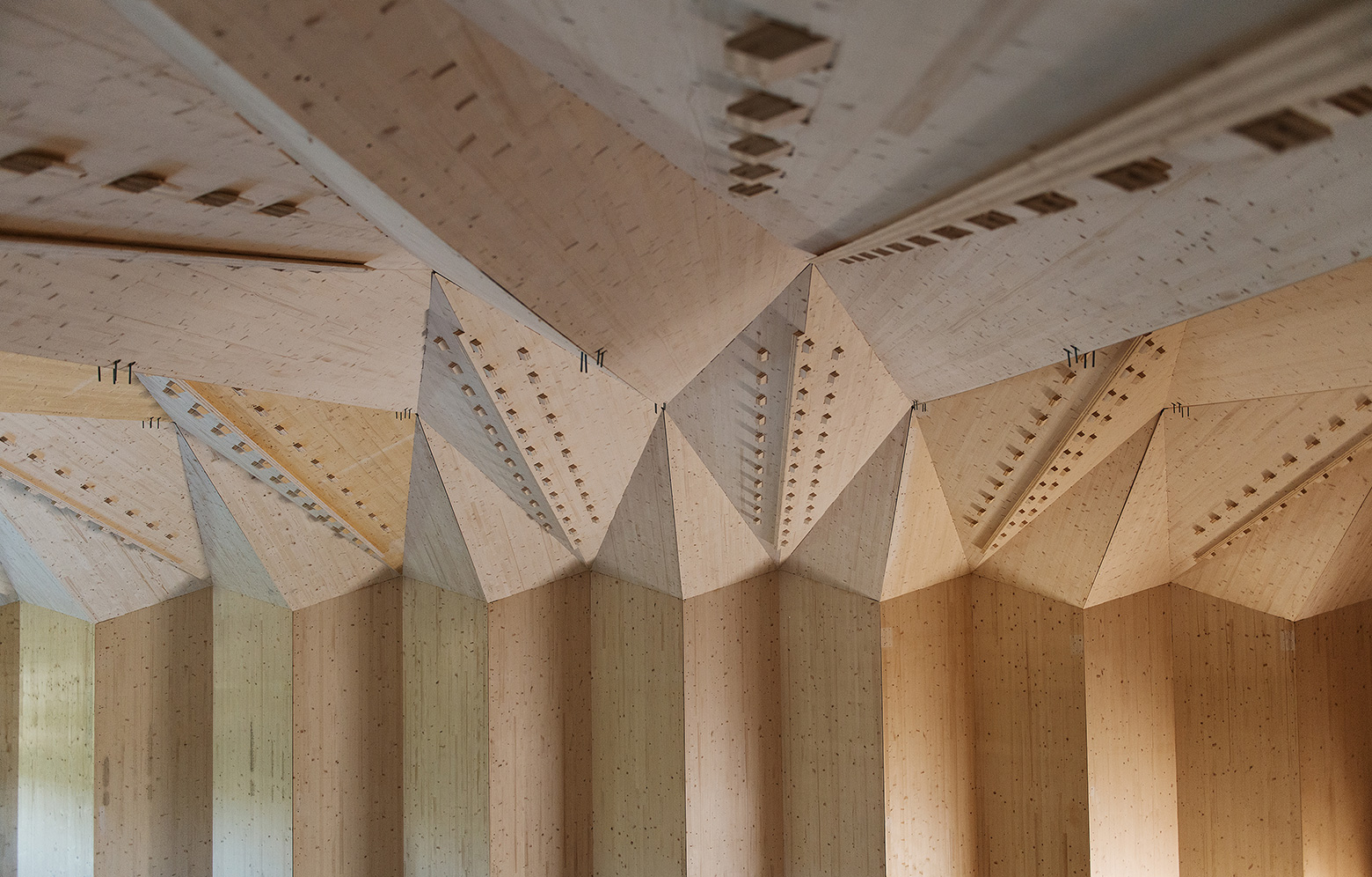 En offentlig byggnad där konstruktionen är sammanfogad på traditionellt sätt och utan stålkomponenter. Ja, så ser den nya kulturscenen i Lausanne ut, skapad av trä och med en vacker origami-struktur. Elva KL-trävalv av lokalproducerat trä har skapats av väggarnas veckade paneler och byggnadens tak. I stället för att skruva samman elementen har konstruktörerna inspirerats av en traditionell metod, laxknutar, men i en tydligt moderniserad tappning. Med hjälp av ett konstruktionsprogram har de utvecklat en exakt och specifik tillskärning av de olika delarna. Programmet har också räknat ut hur krafterna ska fördelas i den veckade strukturen.