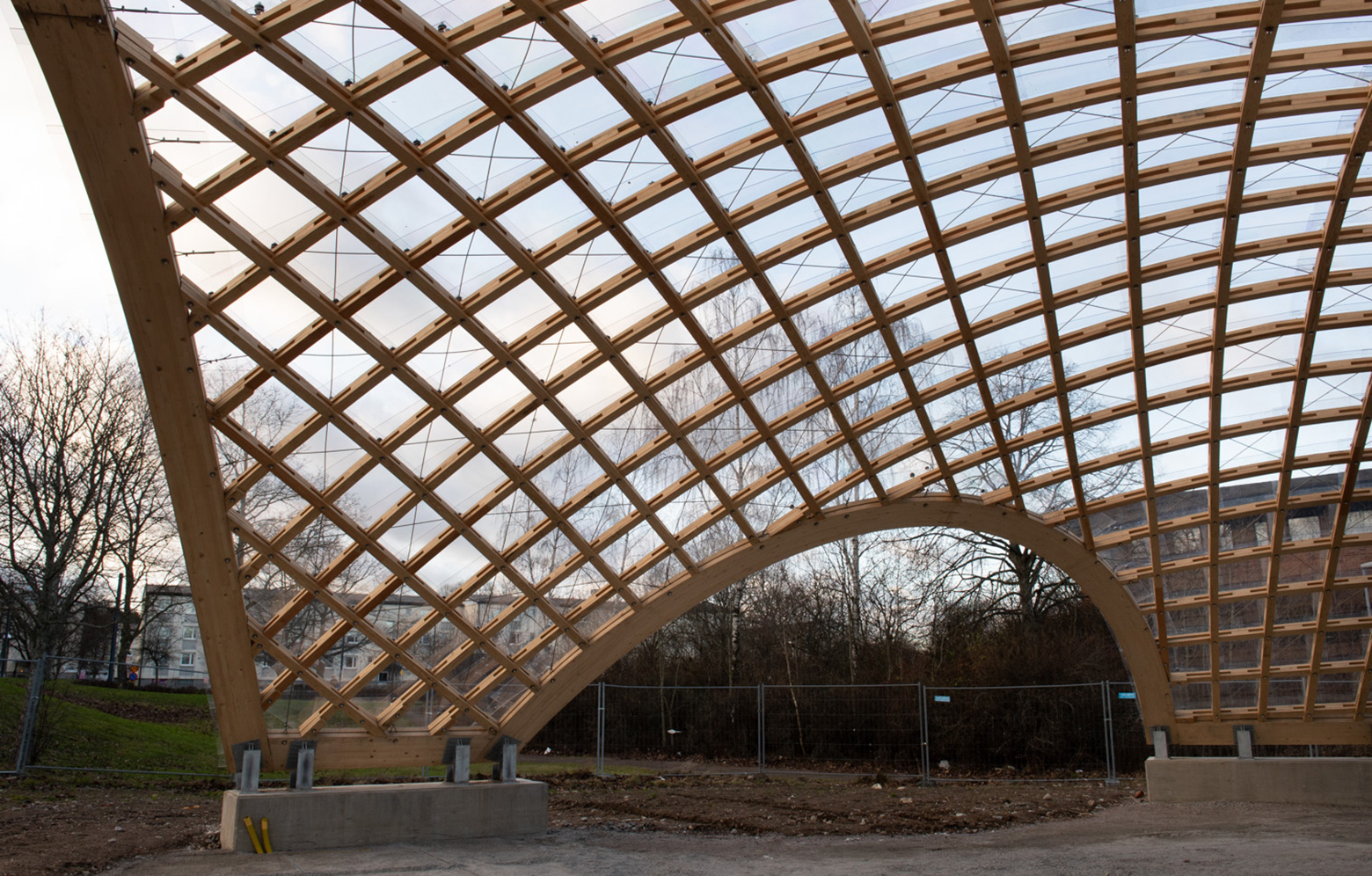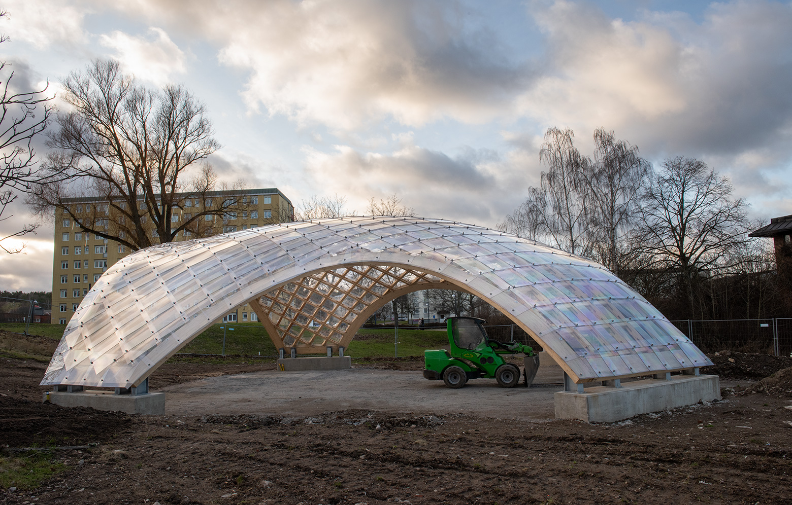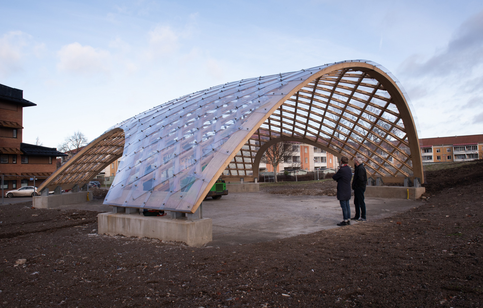 Tekniken bygger på träets inneboende flexibilitet. I en ram av limträ böjt i två riktningar har ett raster av träribbor i tre lager skapats, ribbornas lameller mäter 34 x 90 millimeter och består av kvistfri furu.