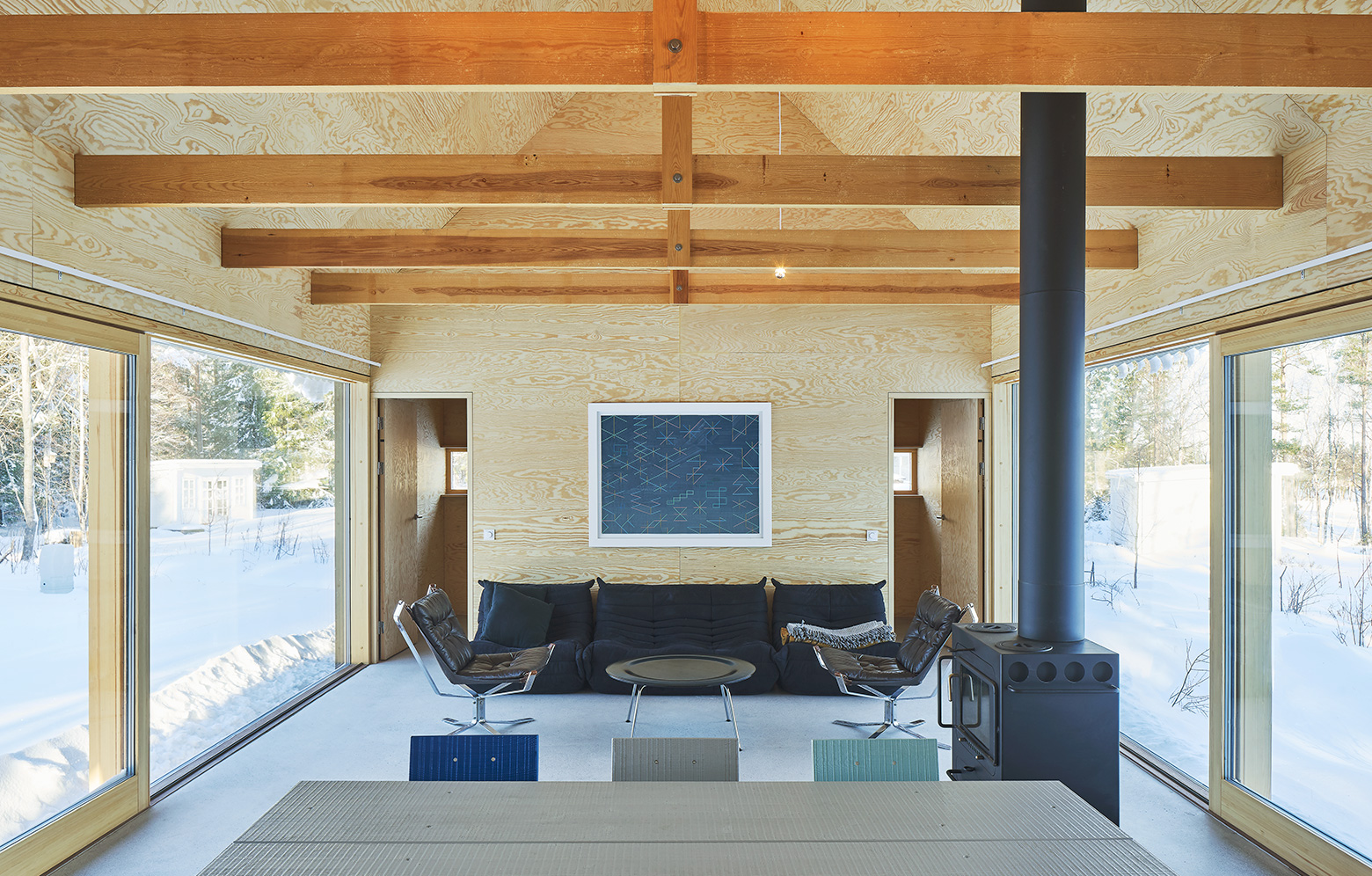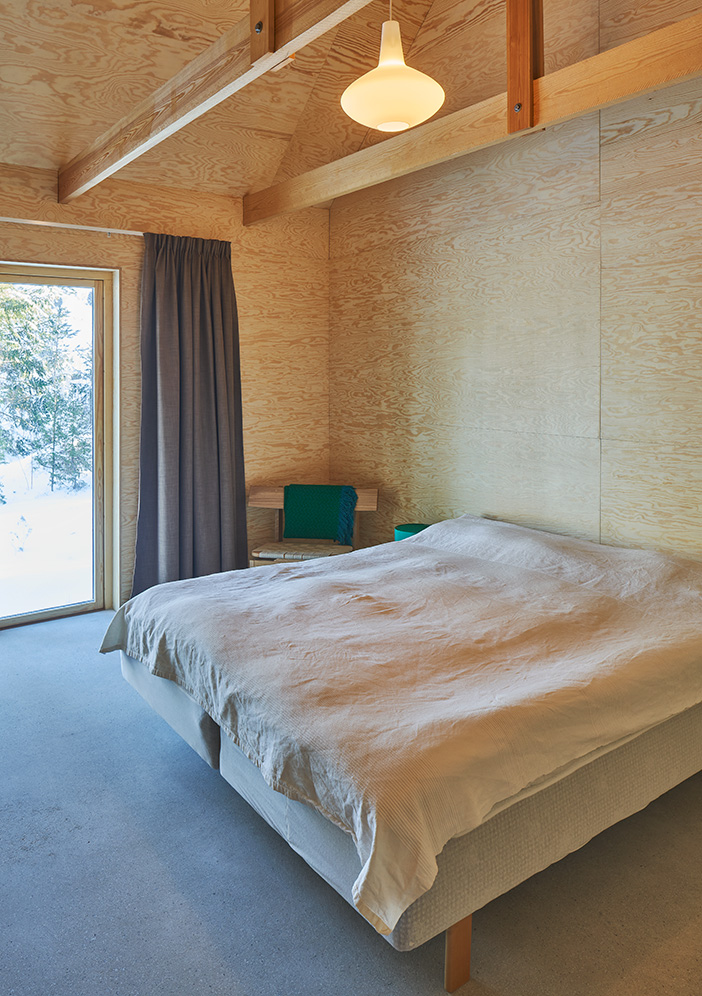 En stor del av konstruktion och tekniska lösningar är gjorda enligt gängse byggnadssätt, med isolering av mineralull och en grund av betong med ingjuten golvvärme och slipad obehandlad yta. Tillsammans med generösa glaspartier, som går att skjuta helt åt sidan för att under varma dagar skapa total utekontakt, ger golvet en distinkt kontrast mot övrig interiör som är helt av trä, med väggar täckta av furuplywood och en synlig takstol av furu.