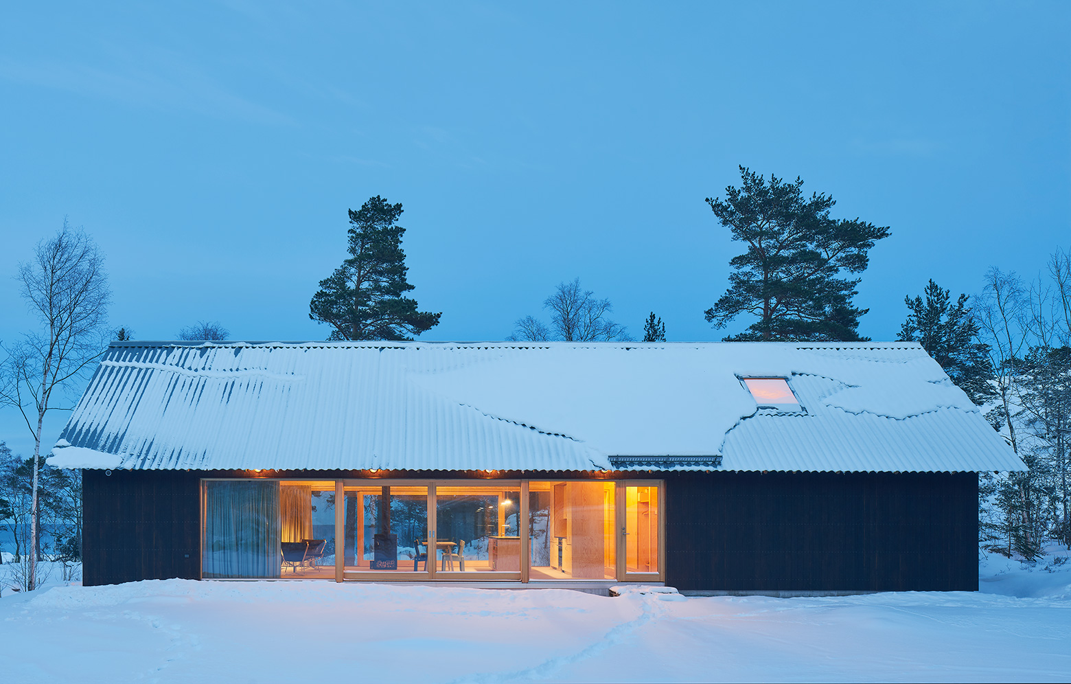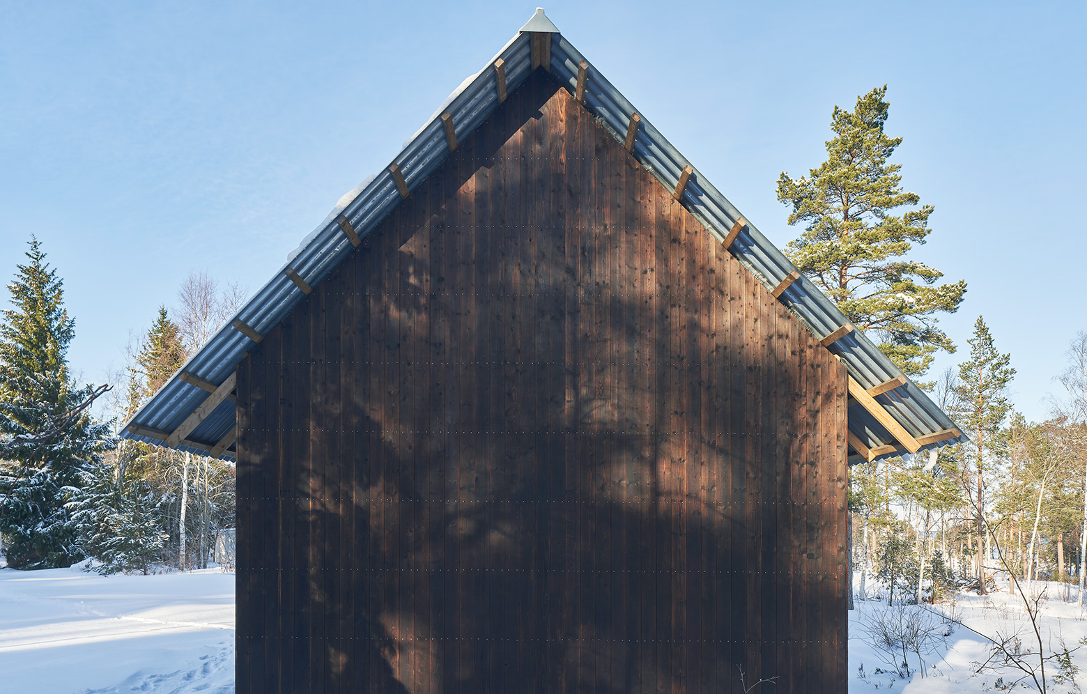 Den mörka och robusta fasaden sticker diskret fram på naturtomten. Här, i Roslagens skärgård, möter den karga kustens kyliga vindar öns varma, soliga gläntor. Fritidshuset ligger mitt i gränslandet, med ena långsidan mot havet, och behövde därför kunna möta det föränderliga landskapet med både öppenhet och slutenhet.