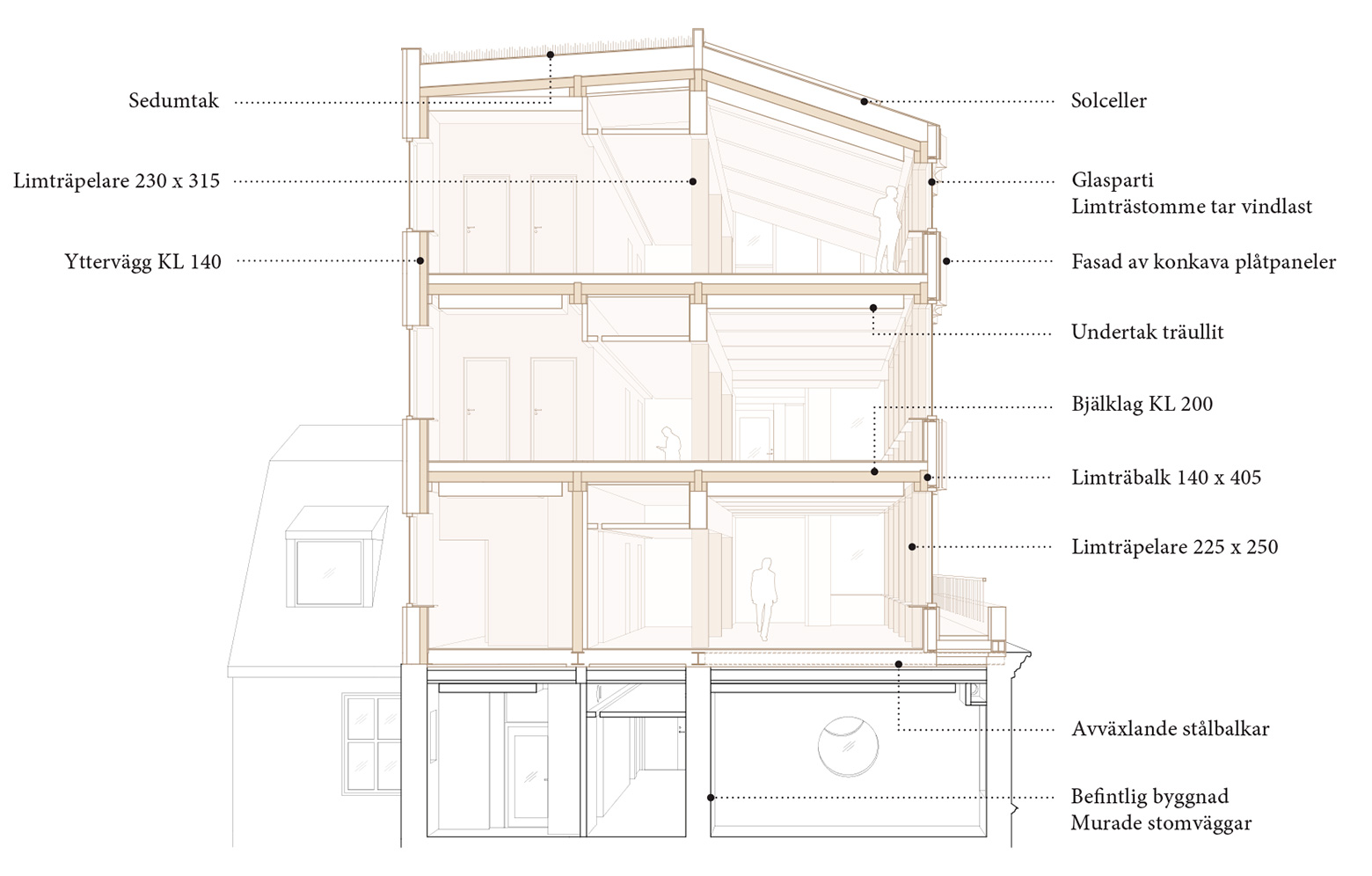 – Till en början fokuserade vi på problemet med sättningar i det gamla huset. Det innebar att en påbyggnad av huset skulle behöva göras med en så lätt stomme som möjligt. Valet av trä blev därför ett både nödvändigt och pragmatiskt beslut. Sedan gillar både vi som arkitekter och Vasakronan som fastighetsägare hållbarhetsaspekten med att använda trä, säger Morten Johansson, ansvarig arkitekt på Dinell Johansson.