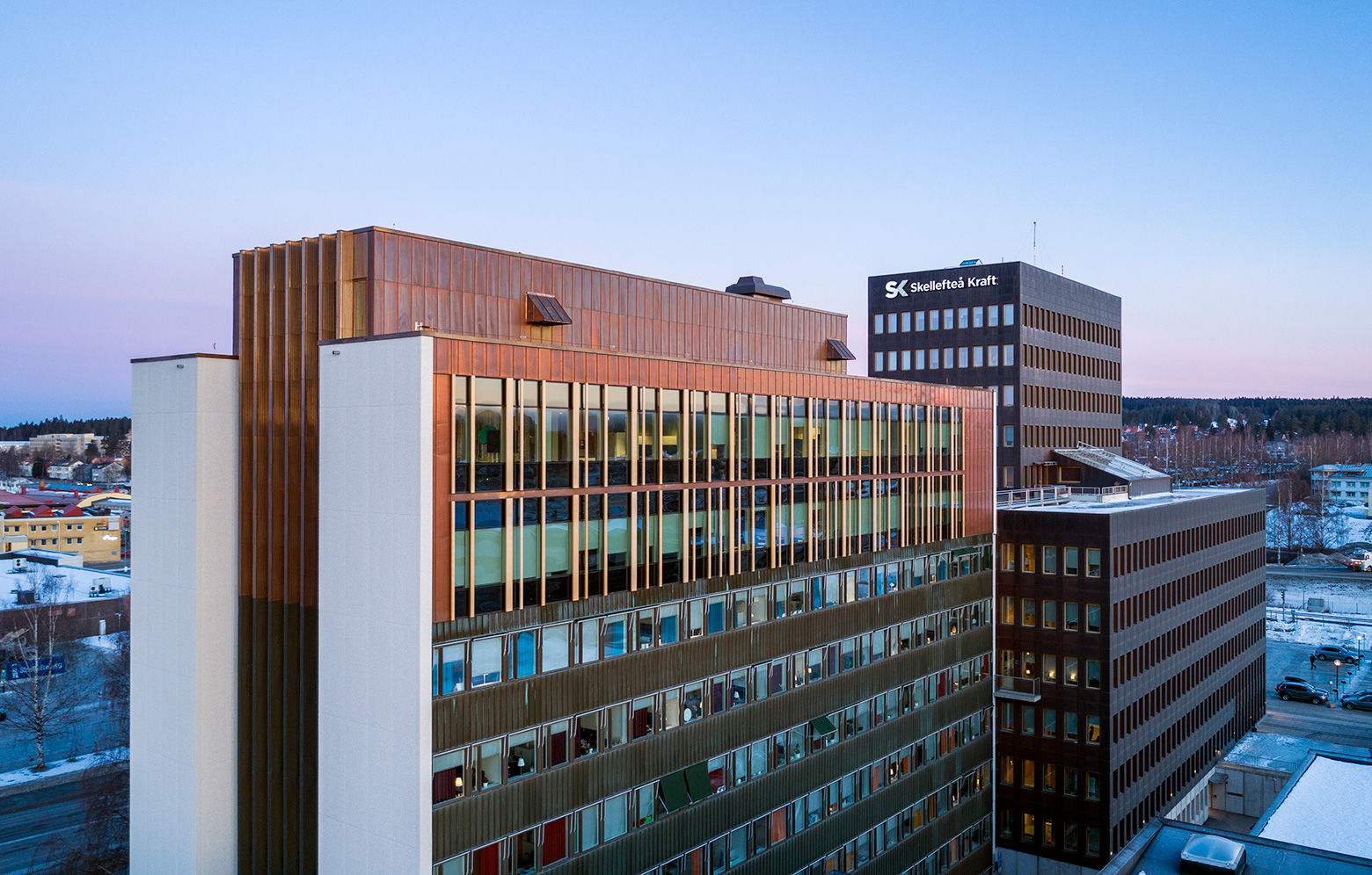 Vi beger oss norrut till den moderna trästaden Skellefteå. Här har man på många sätt gått från ord till handling när det gäller att ta tillvara sina goda förutsättningar för att driva utvecklingen inom träbyggande framåt. Ett bra exempel är Skellefteå Krafts huvudkontor mitt i centrala Skellefteå. När företaget behövde mer utrymme för att växa vidare valde man att göra det på höjden. Resultatet blev en påbyggnad av KL-trä och limträ på det äldre av de två kontorshusen.