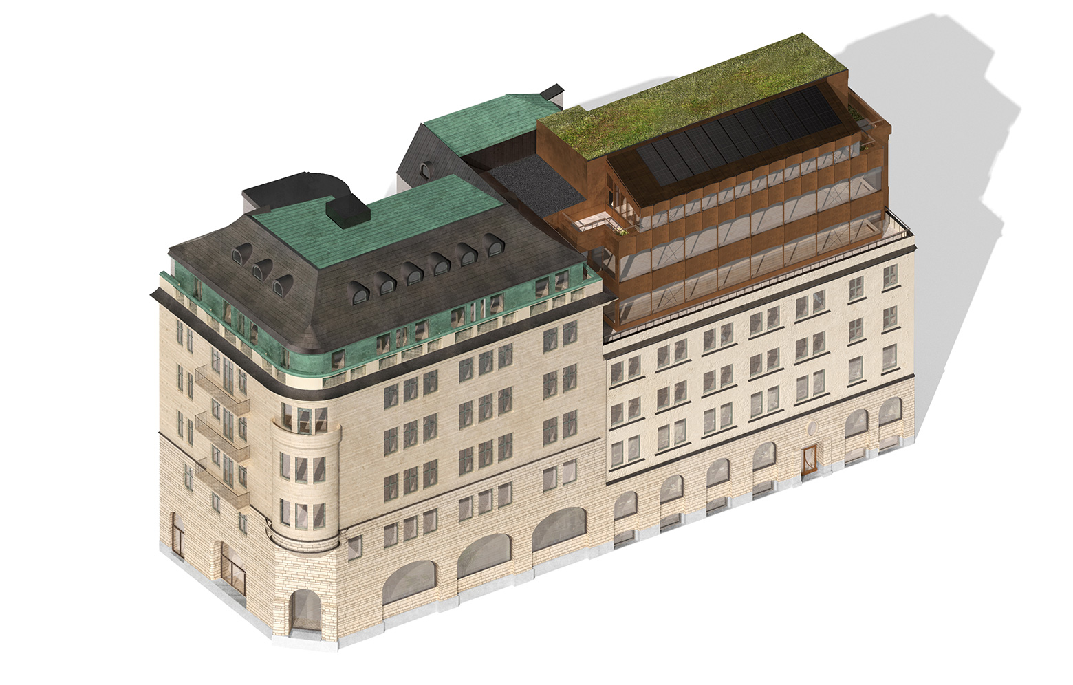 Ett lyckat exempel på hur man kan förtäta staden på ett hållbart sätt och samtidigt spara både tid och pengar är fastigheten Styrpinnen 15 i hörnet Kungsträdgårdsgatan–Näckströmsgatan mitt i centrala Stockholm. Den vackra sekelskiftesfastigheten ritades av arkitekten Erik Lallerstedt, och när den uppfördes för Hernösands Enskilda Banks räkning under åren 1889–1901 blev den startskottet för stadens finansiella maktcentrum.