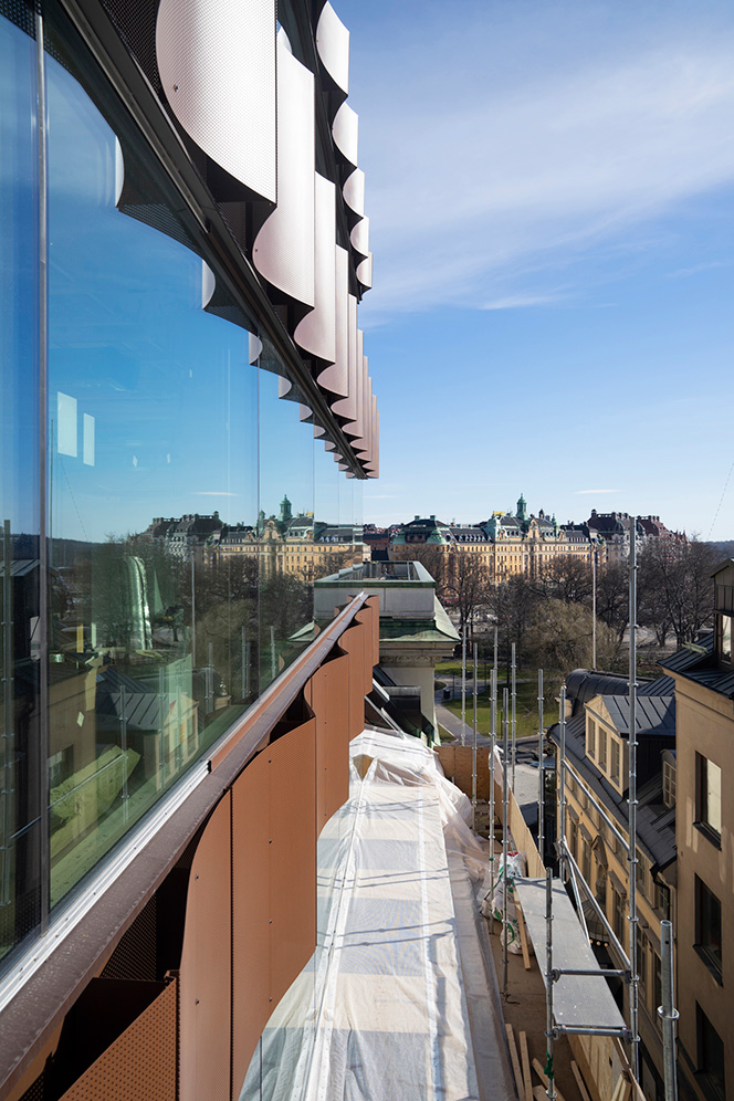 Påbyggnaden får en svart helglasad fasad med samma utförande som den underliggande byggnaden. Den nya fasaden veckas för att bryta ner skalan, skapa ett vågmönster och anknyta till arenans veckade yta. För att visuellt åtskilja påbyggnaden från den ursprungliga byggnaden är den nedersta våningen indragen från den underliggande byggnadens fasadliv. Även om hotellverksamheten inte kommer att hållas i markplan är intentionen att påbyggnaden ska rama in platsen, lysa upp och vara välkomnande.