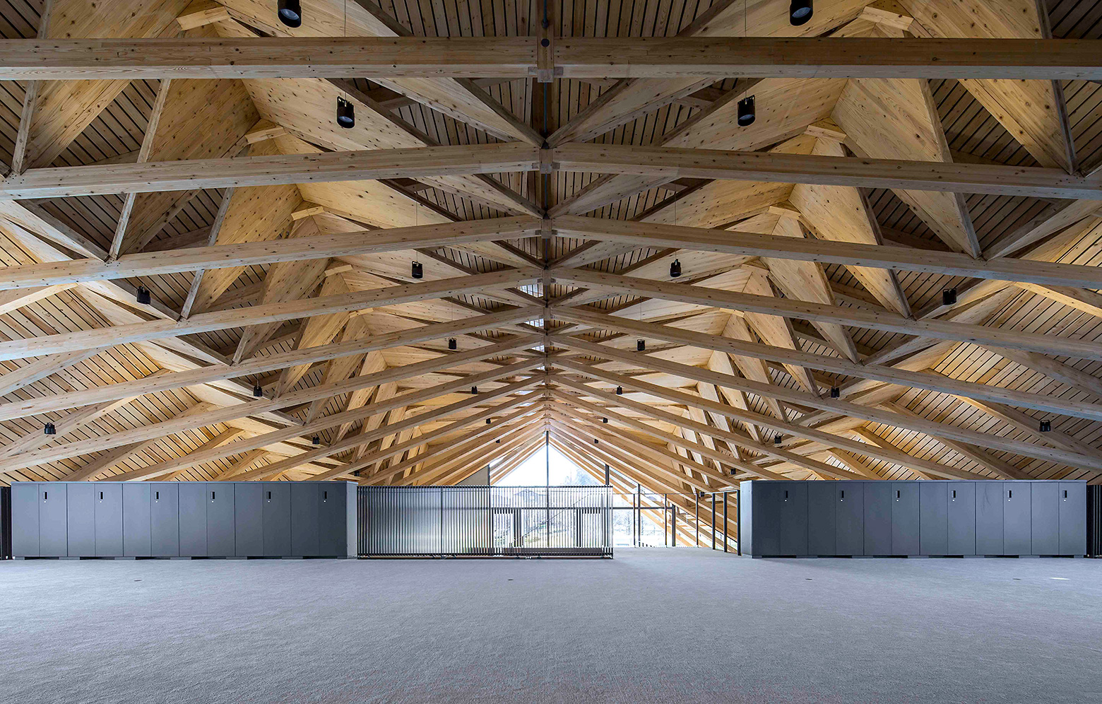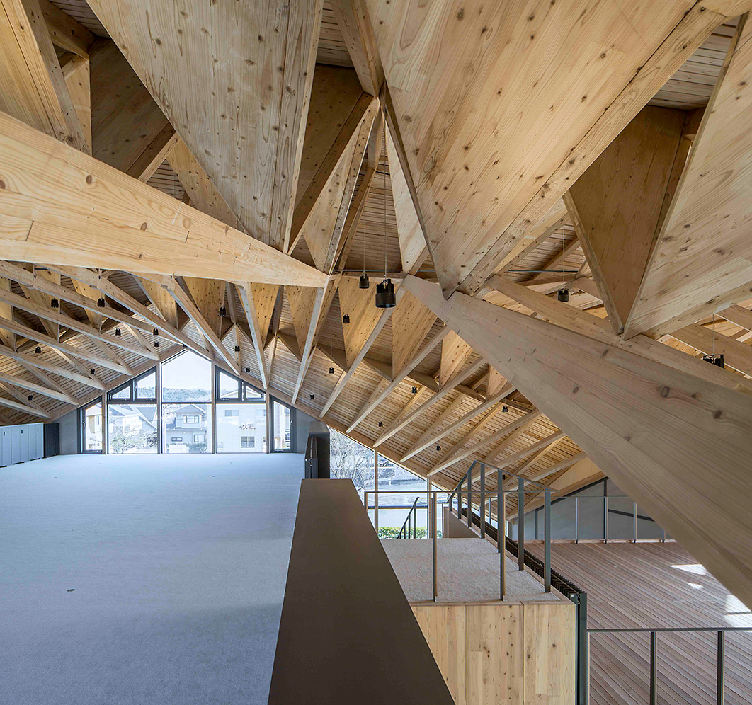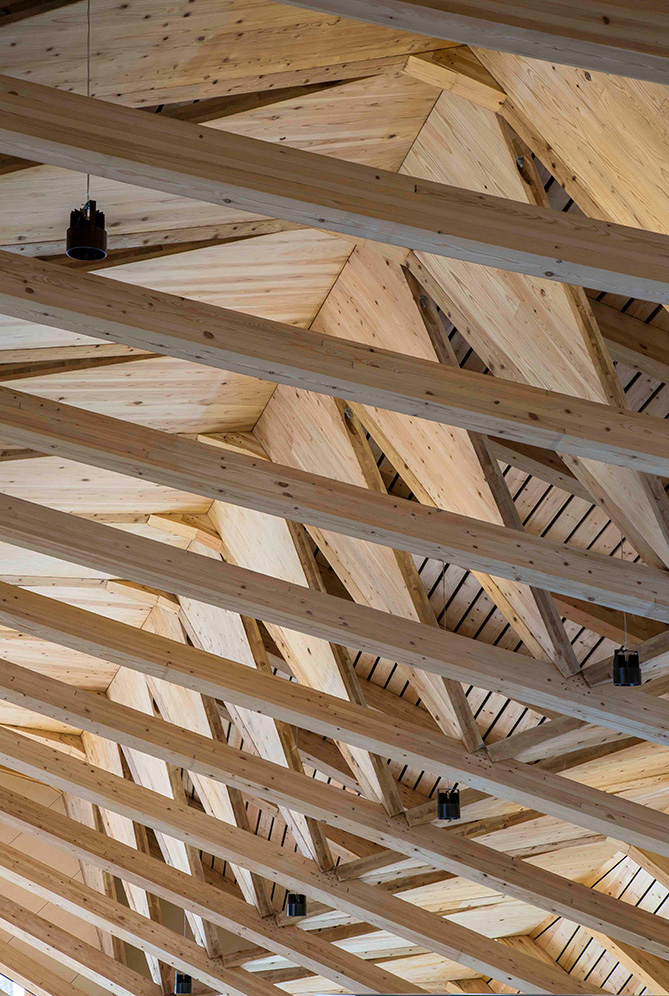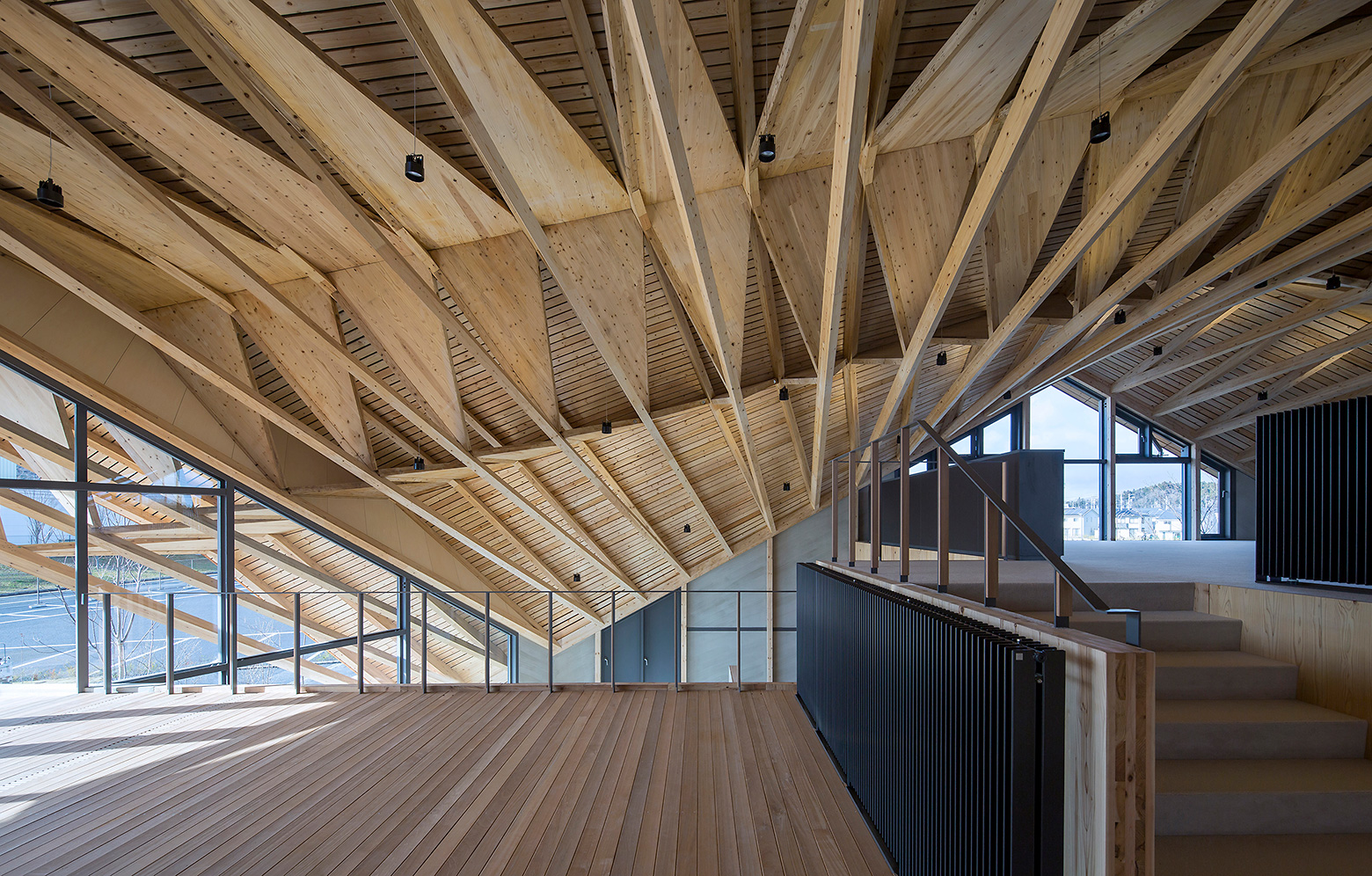 Fokus ligger på det geometriskt avancerade taket, som består av två lager med trianglar. Basen på de bredaste trianglarna löper hela vägen från långsida till långsida och består av ett fackverk med limträbalkar skapade av japansk tall. Dimensionen på dessa är 105x240 millimeter, en vanlig dimension i japanska hus. Ovanför fackverkets nedre del sitter två långa rader med triangulära KL-träskivor av japansk ceder, likt två fågelsträck som sänker sina vingspetsar från toppen av taket och ner mot limträbalkarna. Där vingspetsarna träffar balkarna knyts de båda elementen samman med förband i såväl mittlinjen som i två yttre linjer. Under de båda konstruktionerna är taket klätt med en längsgående panel av europeisk rödtall.